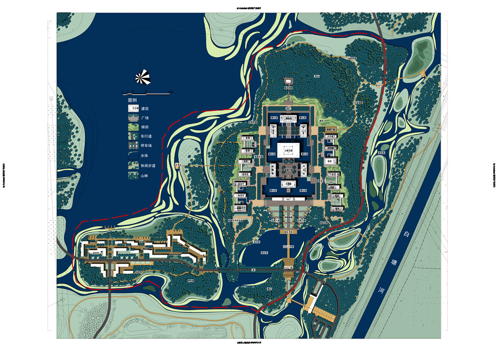 水月禪寺以“藏風(fēng)得水,古典格局;入世精神,簡約建筑;禪宗美學(xué),禪意空間”的理念為核心,在建筑風(fēng)格上,突破傳統(tǒng)規(guī)制,一改中國寺院傳統(tǒng)建筑風(fēng)格,在遵循佛教殿堂布局制式的前提下,融入現(xiàn)代建筑元素,詮釋了佛家大道至簡的人文理念;在建筑空間上,追求質(zhì)樸舒適的親切感和空間精神的感染力,力求宗教元素與現(xiàn)代元素的完美結(jié)合,人文關(guān)懷與生態(tài)環(huán)境的完美結(jié)合,古典格局與實用功能的完美結(jié)合;在建筑布局上,采用了現(xiàn)代化建筑形制與傳統(tǒng)寺院結(jié)構(gòu)相融合的方式,寺院內(nèi)部則延用了軸線對稱,院落圍合型的傳統(tǒng)布局形式,而寺院外部形制設(shè)計是完全現(xiàn)代化的簡約風(fēng)格。