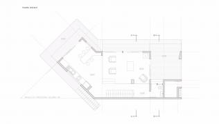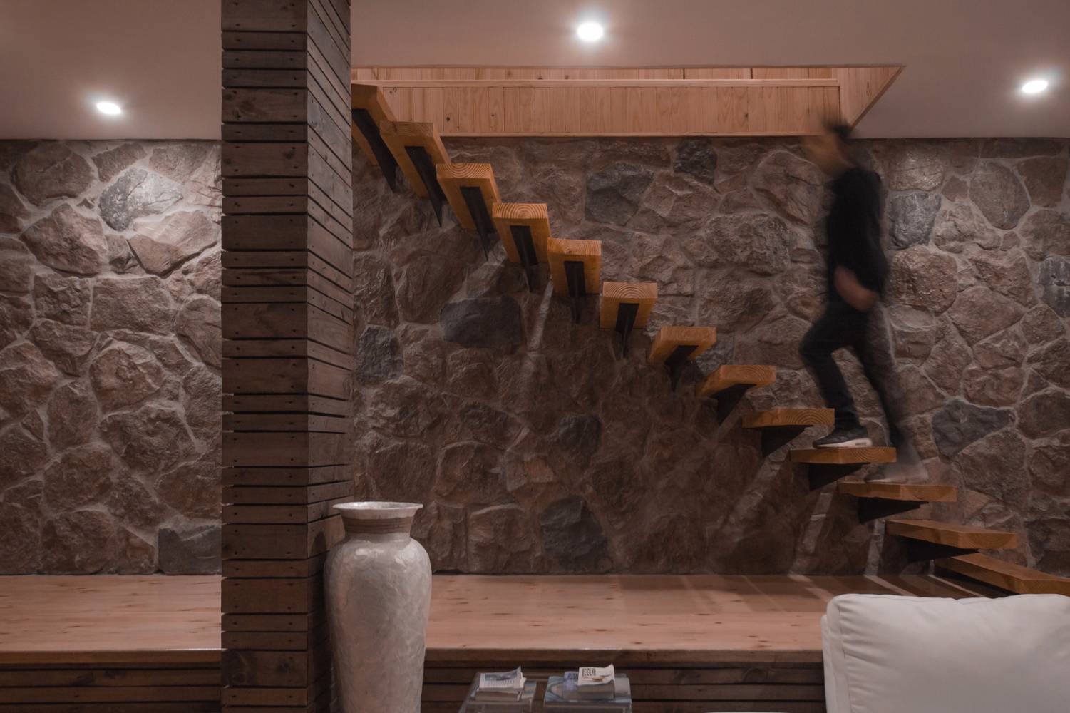 私人空間和建筑入口則位于二樓。位于雙層高度的空間之前的步行橋從左側(cè)連接了不同建筑空間,直達向上懸空的樓梯結(jié)構(gòu)。在另一側(cè)的客廳,現(xiàn)場搭建的小屋和主臥室,這些西北面向的空間仿佛是海邊景色的特寫。