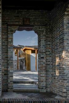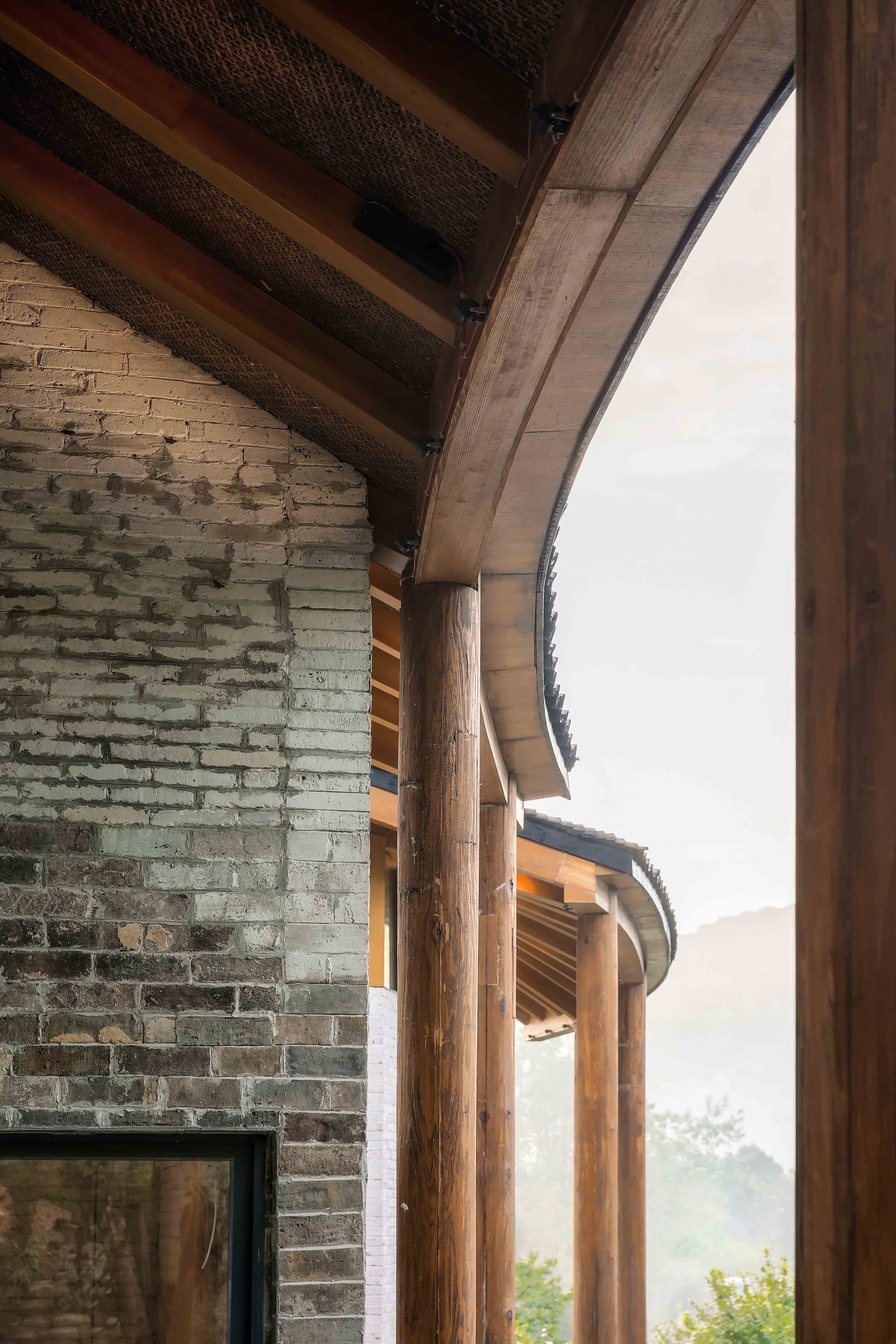 基于鋼結(jié)構(gòu)的構(gòu)架形式,原有墻體部分在建造過程中先由原墻體的老磚逐塊標(biāo)號保存,并待新基礎(chǔ)及主體鋼結(jié)構(gòu)施工結(jié)束后原位復(fù)建。而復(fù)建磚墻的過程中,為了將鋼結(jié)構(gòu)掩藏于傳統(tǒng)建造元素,許多老磚需要被切成薄片作為外貼飾面使用(這種方法多在當(dāng)?shù)匦迯?fù)和翻建傳統(tǒng)民居時為節(jié)省老磚材料所采用)。新產(chǎn)生的墻體部分由當(dāng)?shù)仄渌ㄖ系牟煌吞柕睦洗u砌筑而成,為了進一步彰顯且其差異,我們將新砌筑的部分刷上江南和徽州民居常見的白漆,并在兩種磚體交接處進行了處理和做舊,使二者形成既和諧又統(tǒng)一的關(guān)系。整個建筑的立柱及屋面也均采用了其他老舊民居上回收的老料老瓦,并由當(dāng)?shù)毓そ秤杀镜貍鹘y(tǒng)工法砌筑而成;這樣一方面在建構(gòu)方式上回應(yīng)了本土的文化性,另一方面也體現(xiàn)了可持續(xù)的生態(tài)理念。