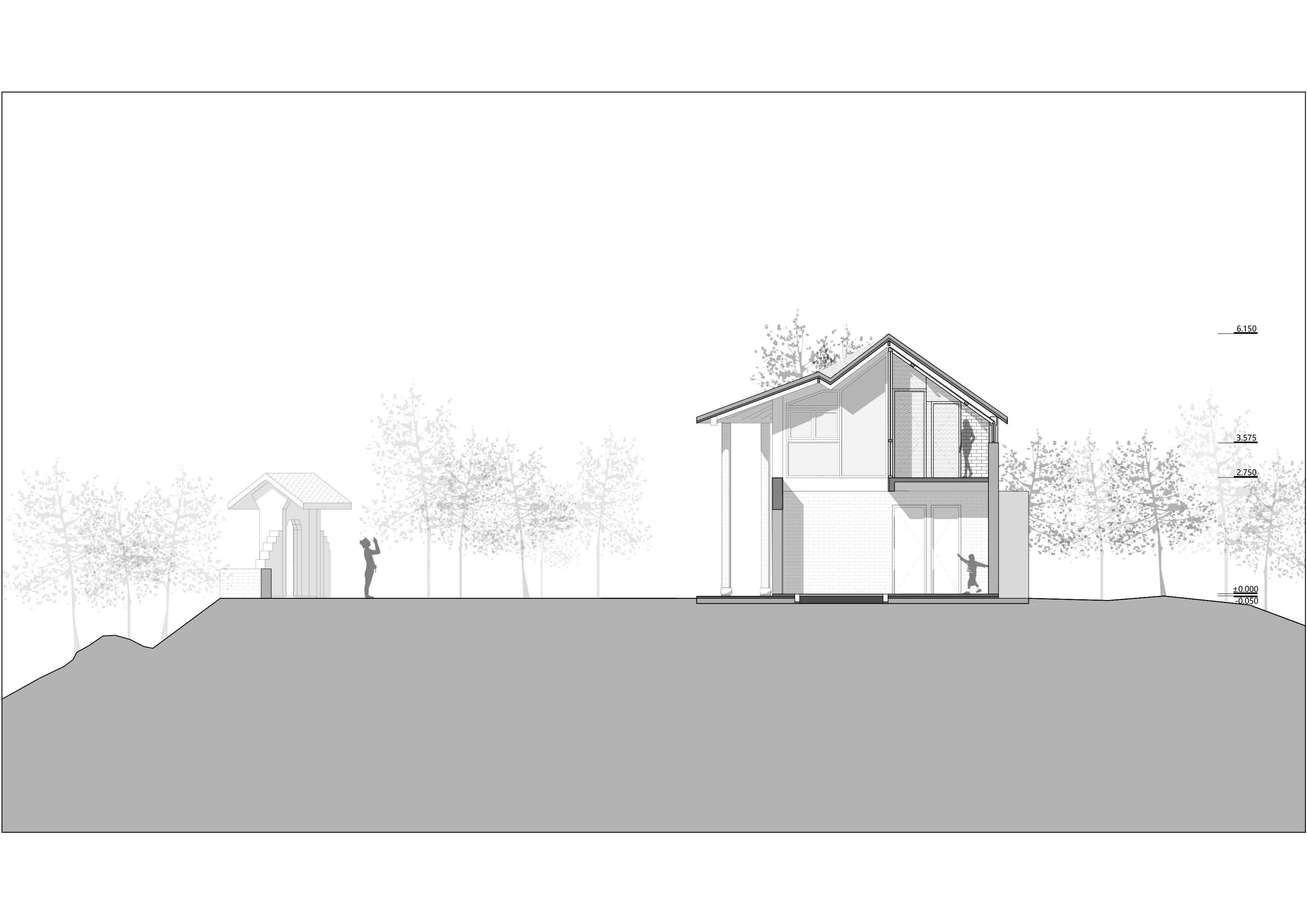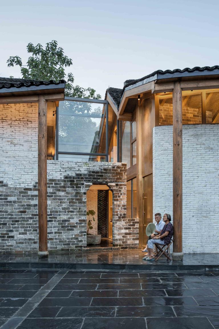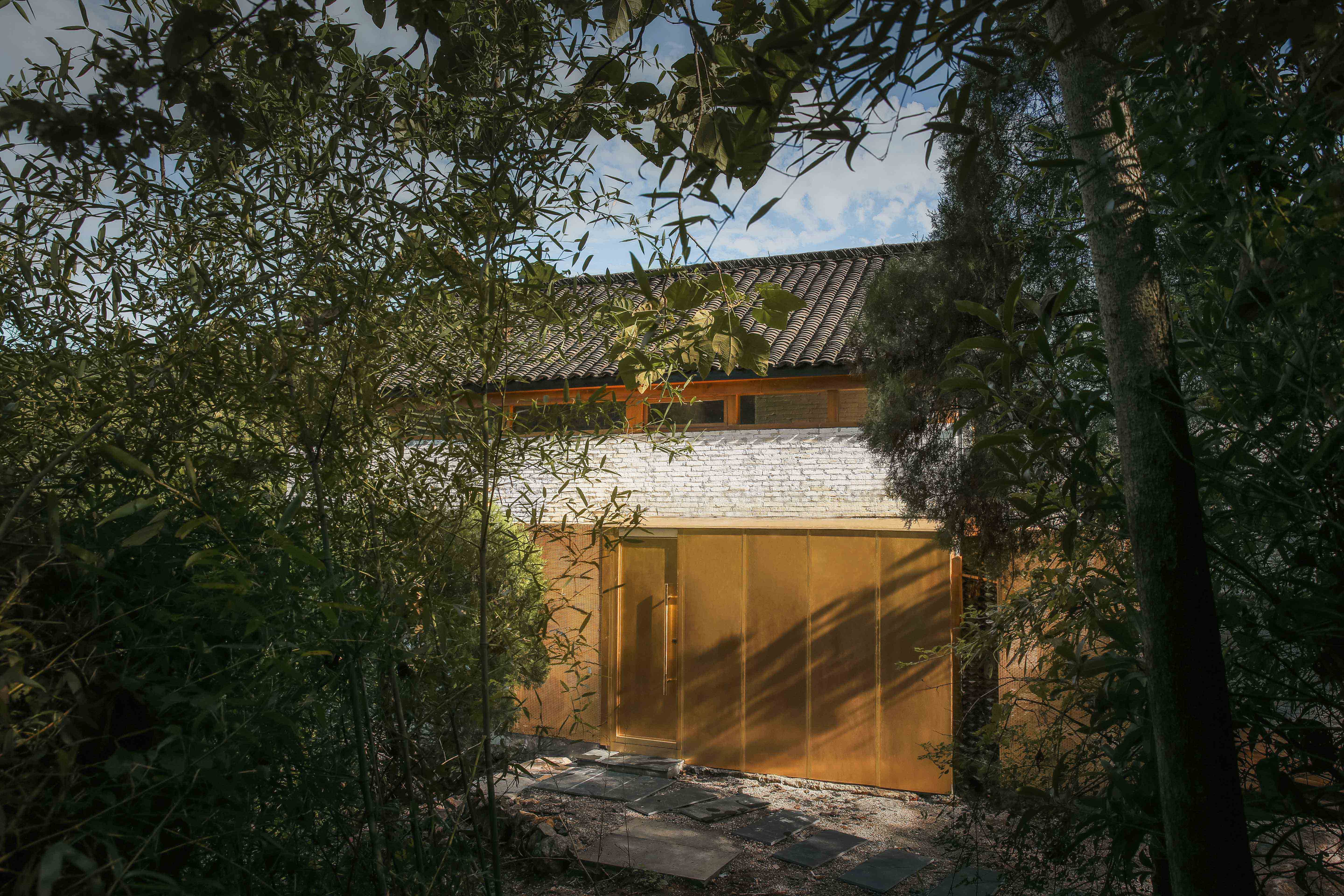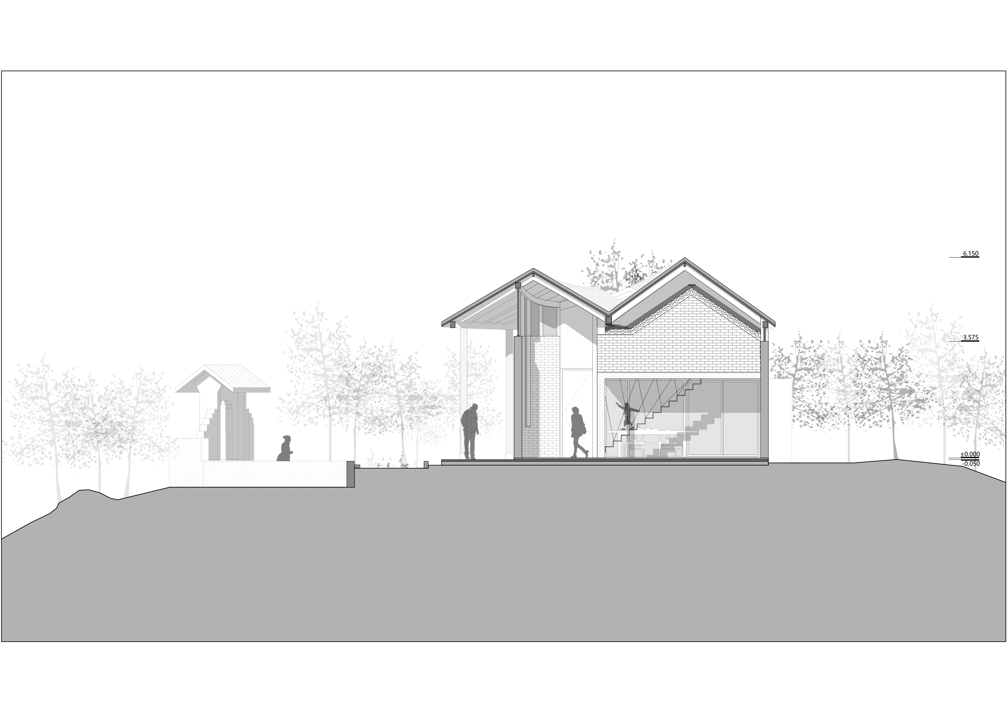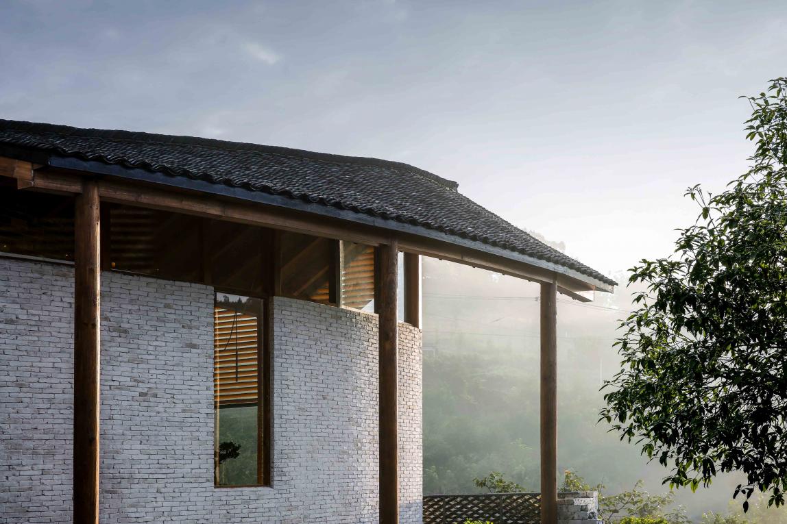 如此形成的東西向的四跨空間,從東起,一跨形成地塊南向的作為起居室的前廳空間,一跨與橫向展開的部分殘墻形成的庭院空間及其二層的玻璃觀景平臺,一跨與西側(cè)的原建筑墻體形成的臥室空間,增加一跨向西將山體和營造的部分景觀空間納入其半開放的檐下虛空間;由此在南立面上構(gòu)成一幅傳統(tǒng)語境下的當(dāng)代拼接畫。