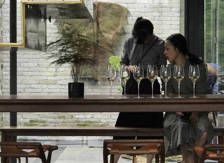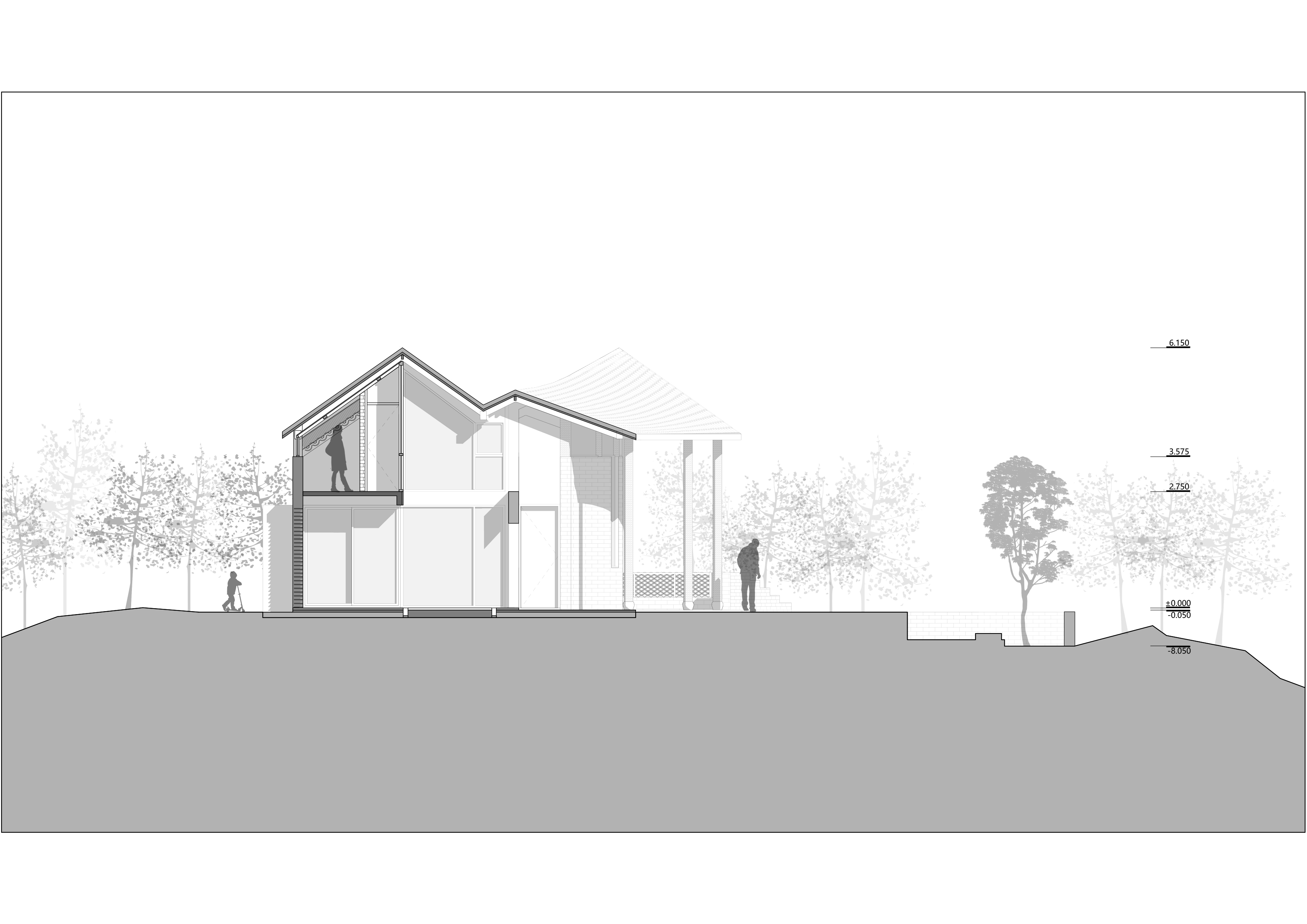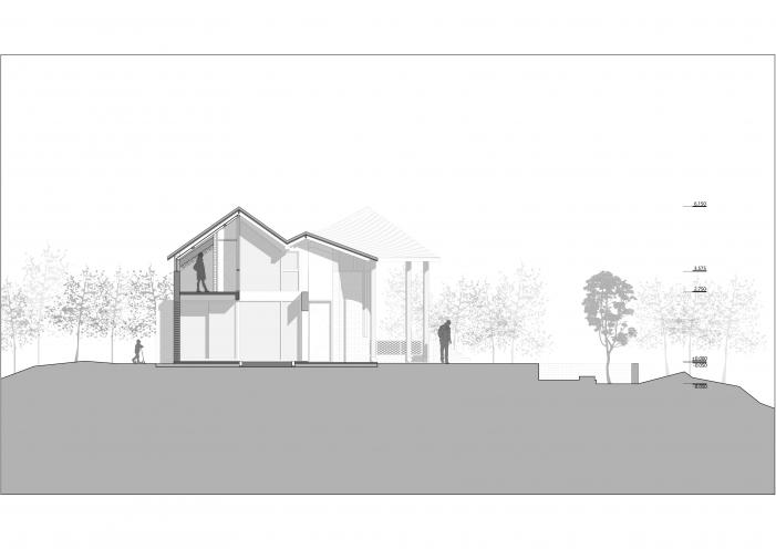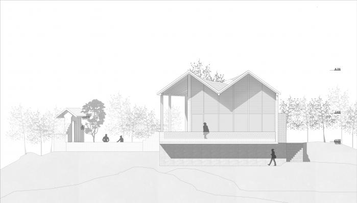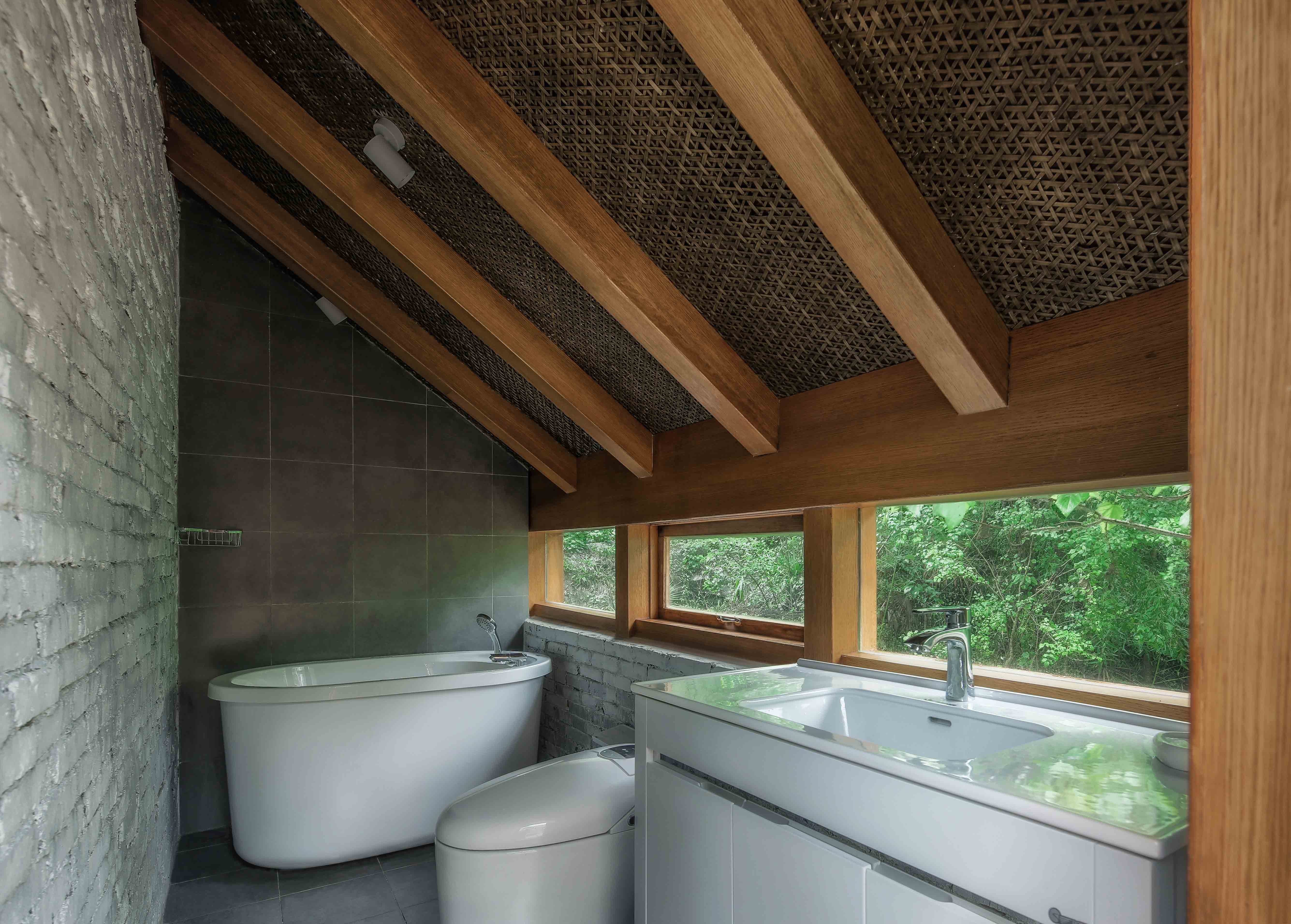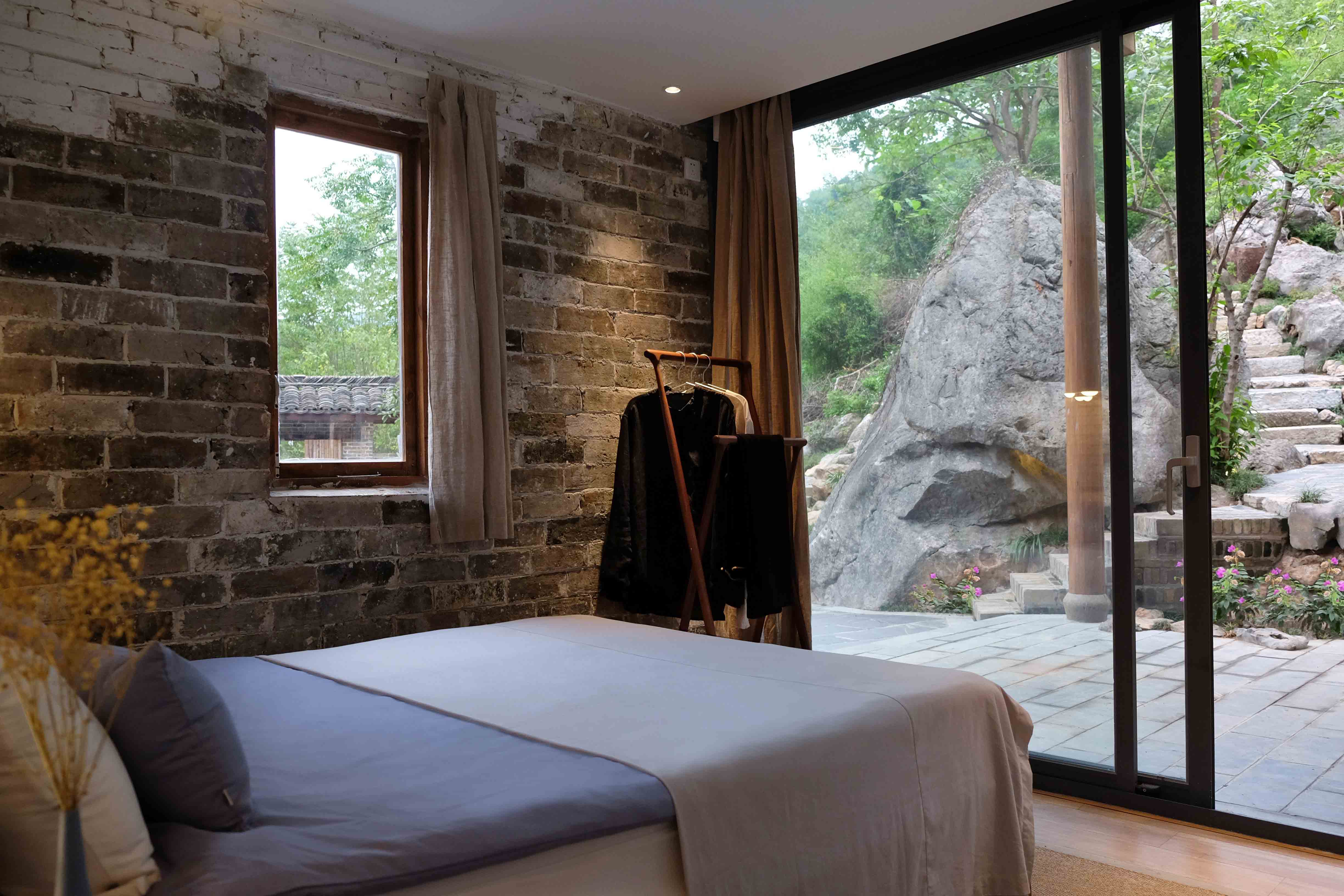 如此形成的東西向的四跨空間,從東起,一跨形成地塊南向的作為起居室的前廳空間,一跨與橫向展開的部分殘墻形成的庭院空間及其二層的玻璃觀景平臺,一跨與西側(cè)的原建筑墻體形成的臥室空間,增加一跨向西將山體和營造的部分景觀空間納入其半開放的檐下虛空間;由此在南立面上構(gòu)成一幅傳統(tǒng)語境下的當(dāng)代拼接畫。