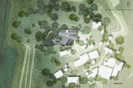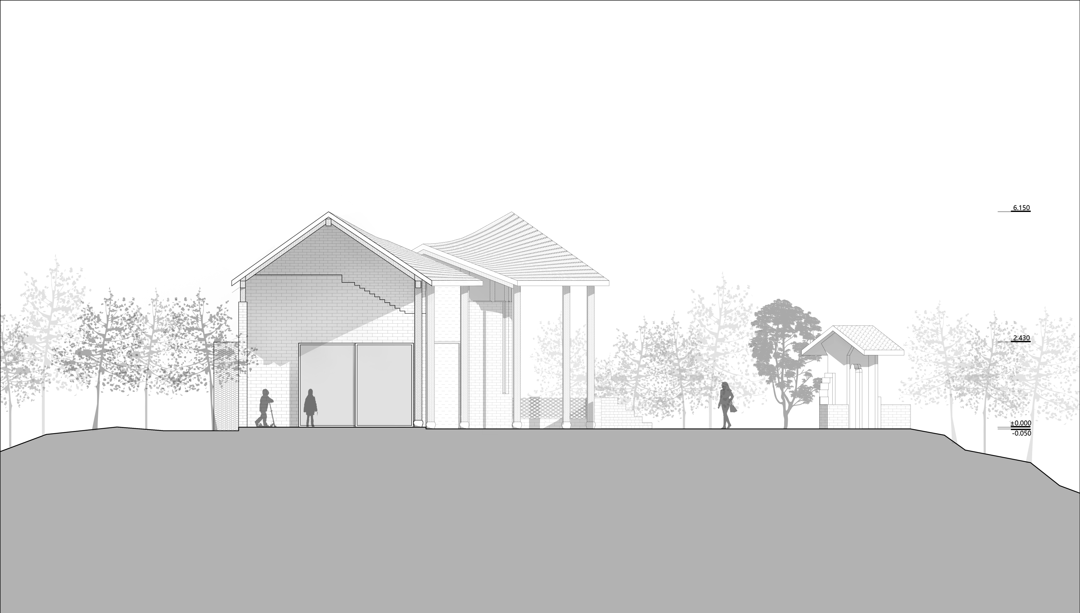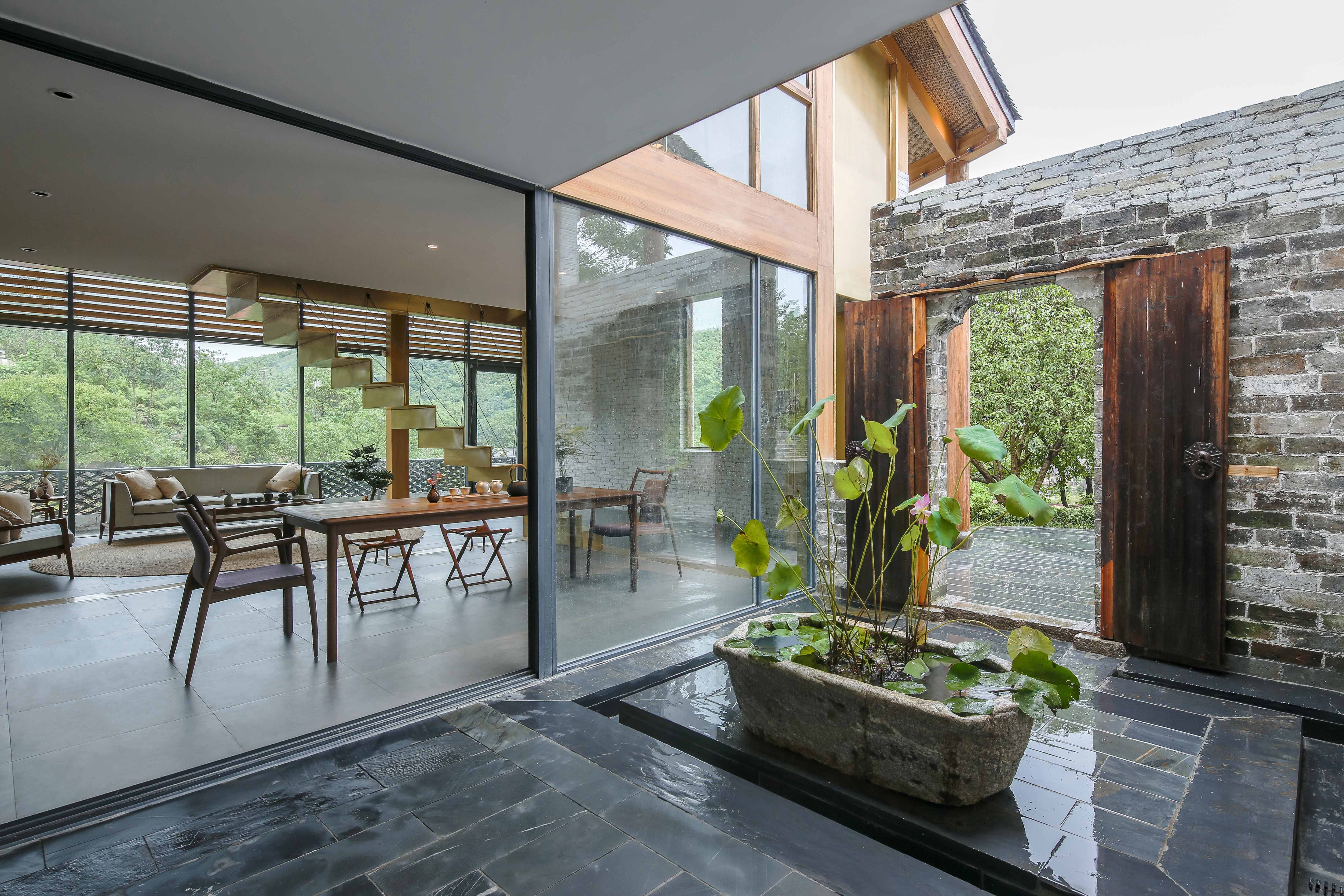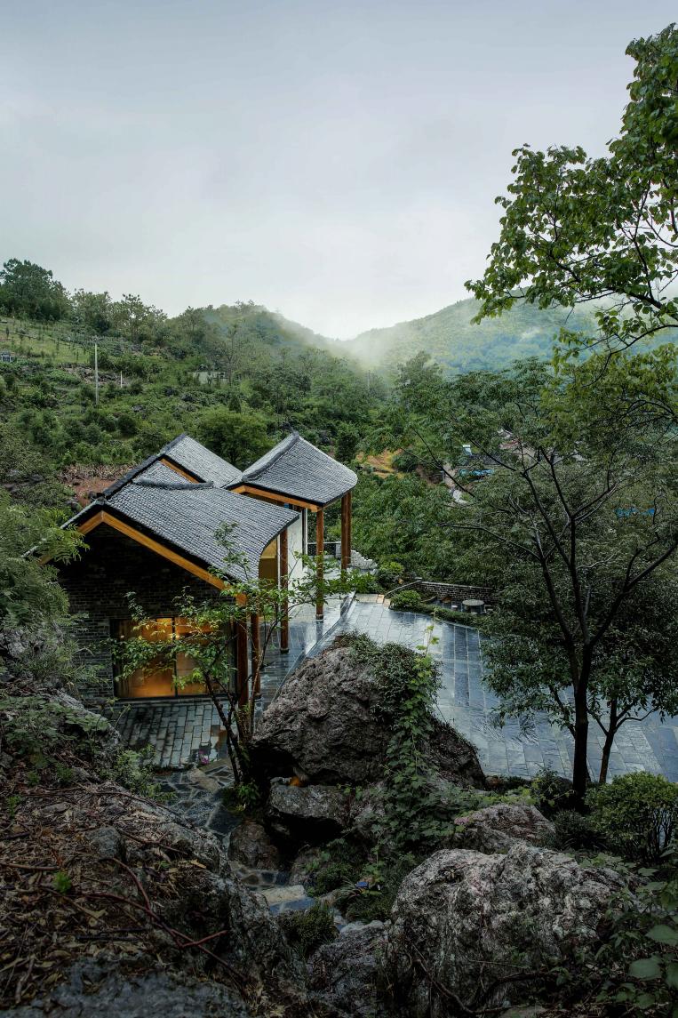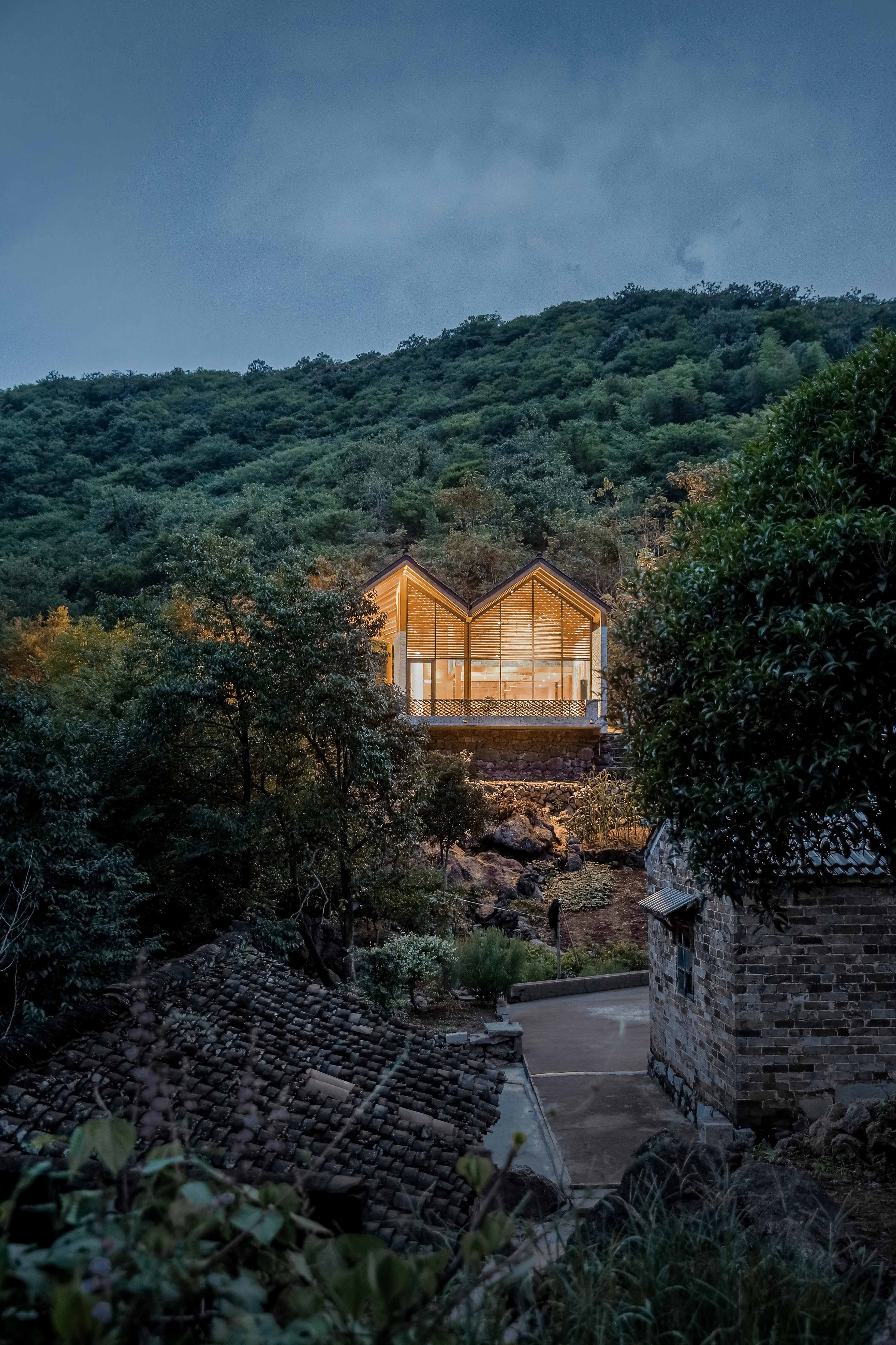 我們此次項目的業(yè)主吳彥祖說:“子玉你看村里這顆最高的殘樹是最美的,咱們以后的房子里應(yīng)該能夠看到它”。于是我們將殘墻一分為二;中段化為庭院,夜觀星河,四水歸堂;檐口化為兩分異質(zhì)脊線,與山巒并行;而那顆高聳的殘樹和古老的村落,則被引入我們的銅陵山居。