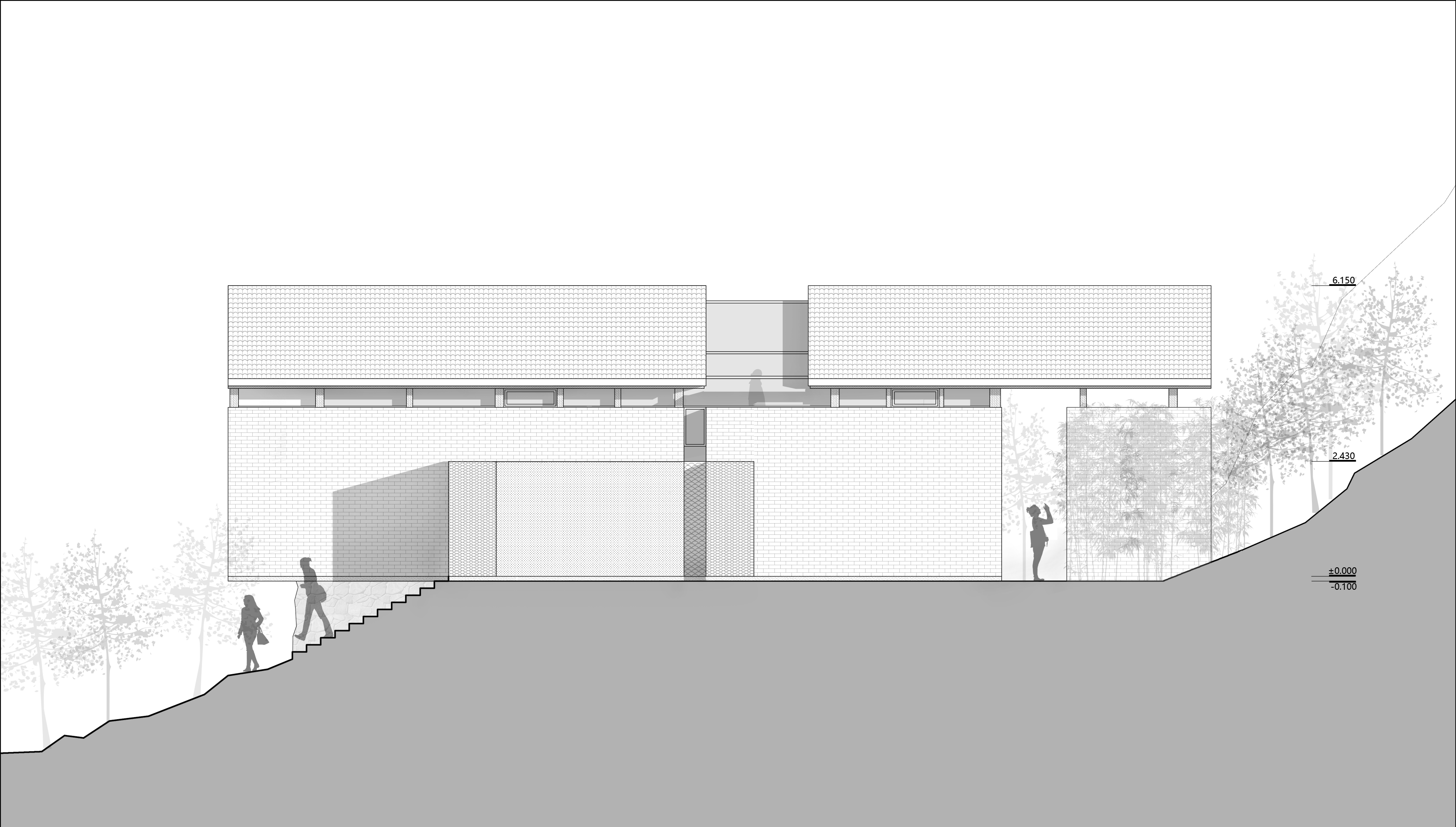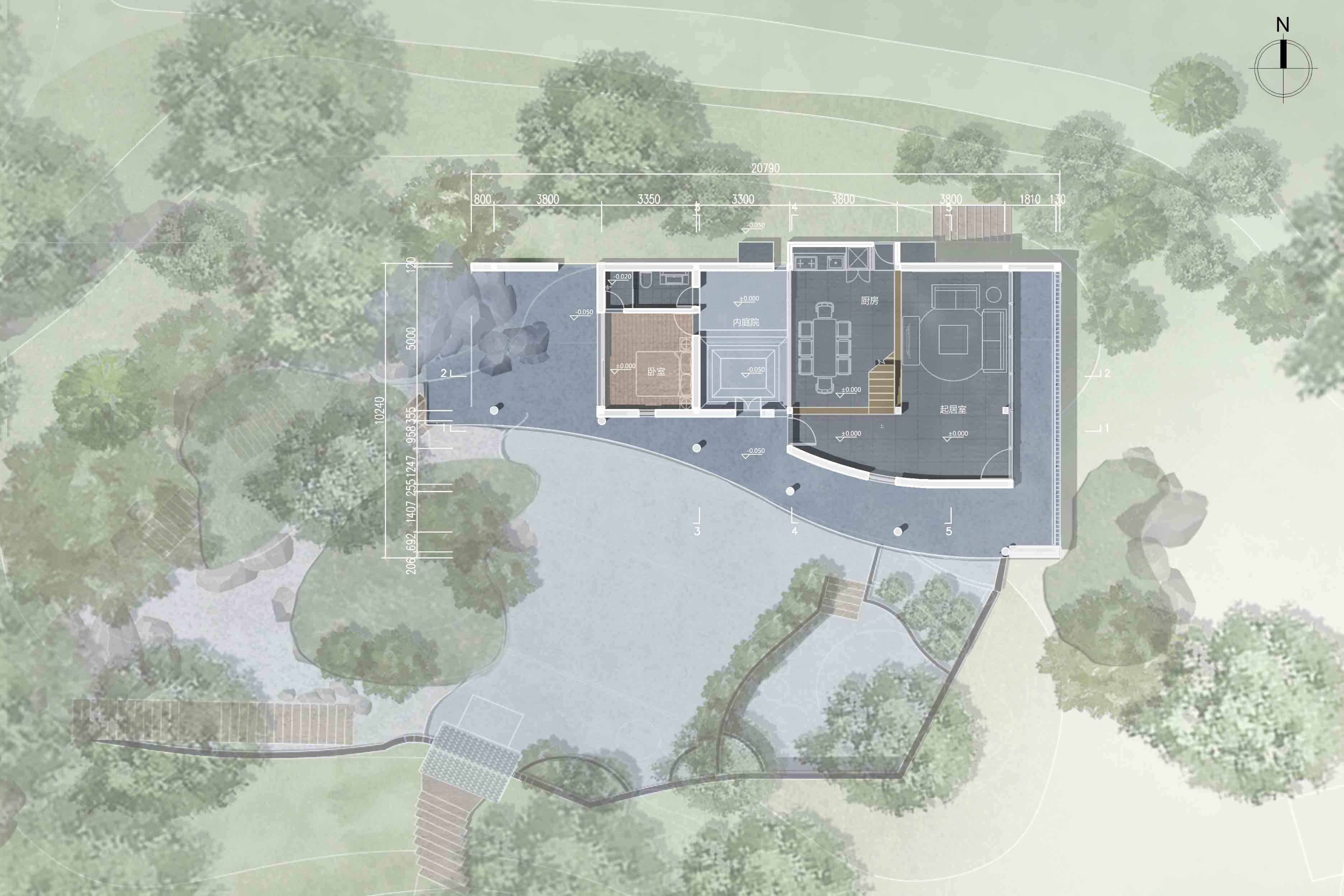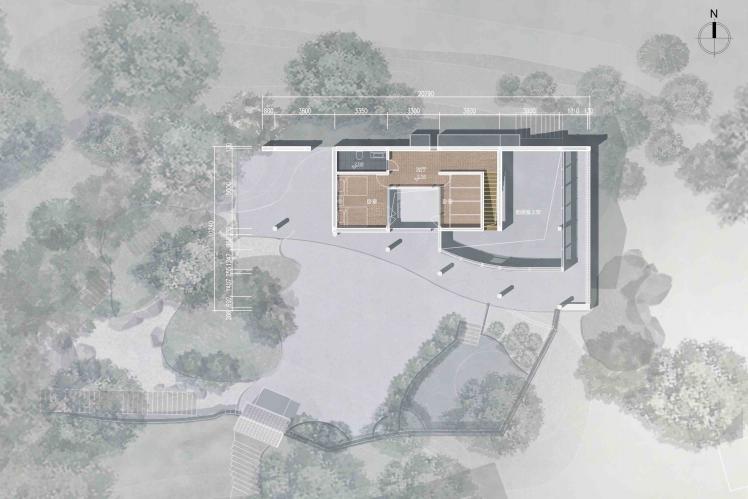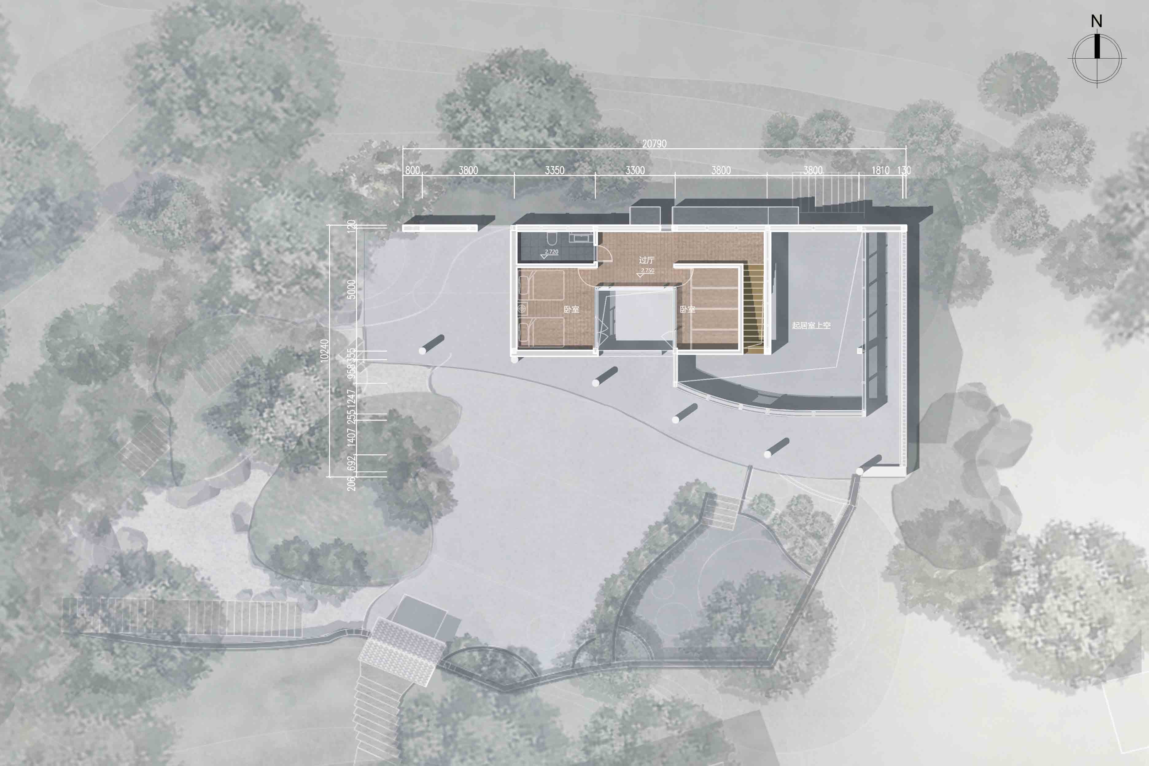 建筑南側(cè)是由入口空間展開的部分室外景觀,軟性的景觀元素旨在和建筑共同打造曲徑通幽的視覺通廊,并結(jié)合建筑的曲線屋面,將遠(yuǎn)處山巒引入建筑空間框定的畫境之中。西南側(cè)為一山門,從山下拾級而上,山門與建筑的中斷形態(tài)形成第一個框景,并與南側(cè)矮墻北側(cè)建筑一同形成了一個圍合的庭院;建筑西側(cè)檐下空間和喀斯特地貌巖石山體形成一個環(huán)形的石階游廊,從山門入口處起,從檐下庭院處止;東南側(cè)結(jié)合原有的一個高大喬木設(shè)置了下沉庭院,對其領(lǐng)域感加以限定,并置入石桌石凳,形成建筑室外的休憩場所。東側(cè)為落差不大的懸崖,建筑由此出挑2米;居者從建筑北側(cè)后門出來,由自然化的臺階和植被引導(dǎo),可達(dá)戶外臺地和作物種植區(qū)域,體驗遠(yuǎn)離塵世的鄉(xiāng)野趣味和田園畫境。