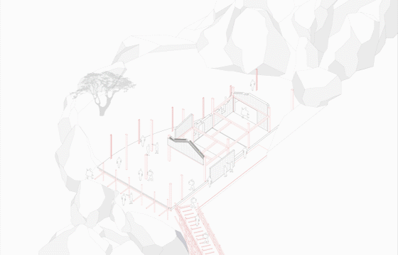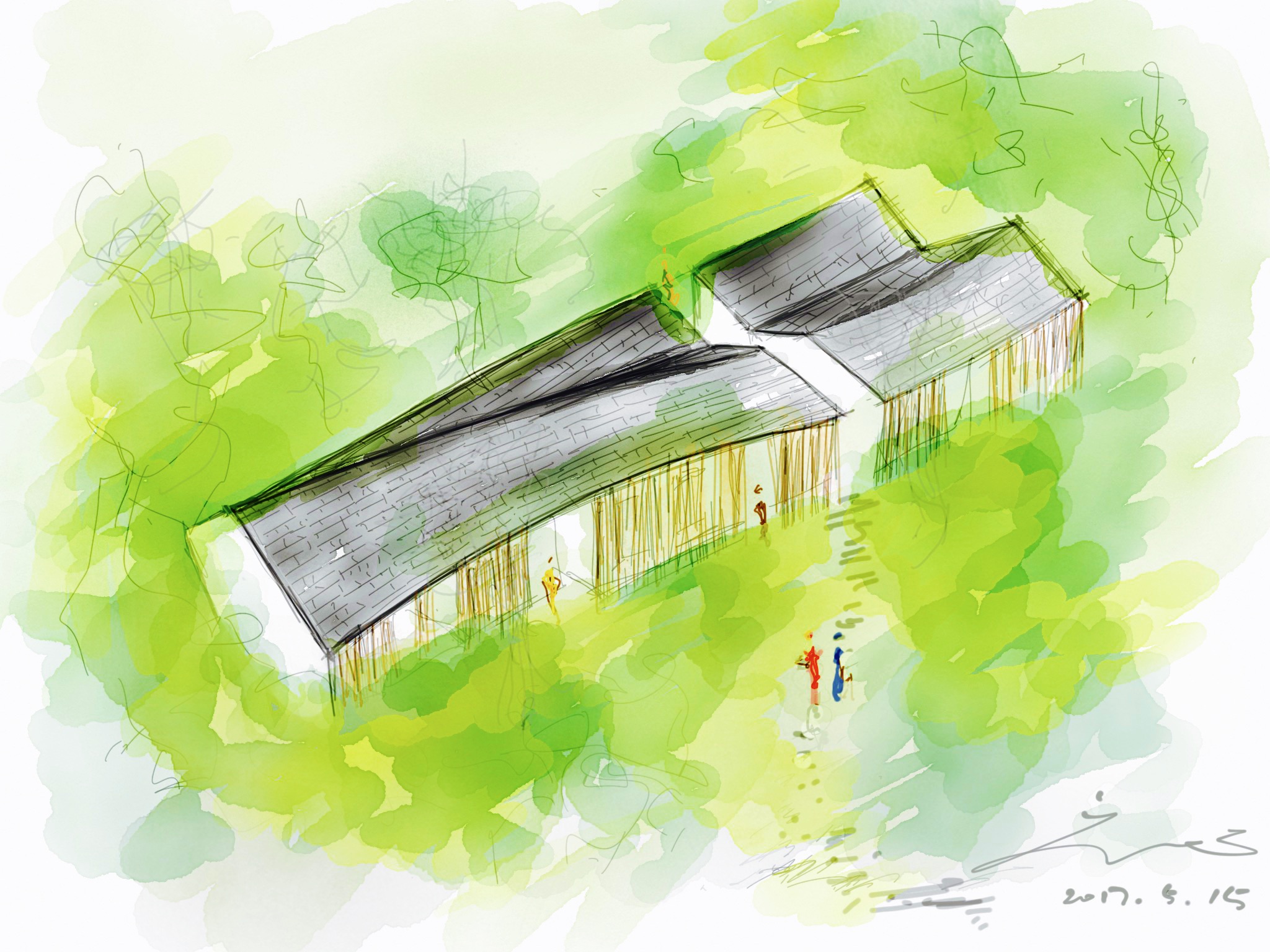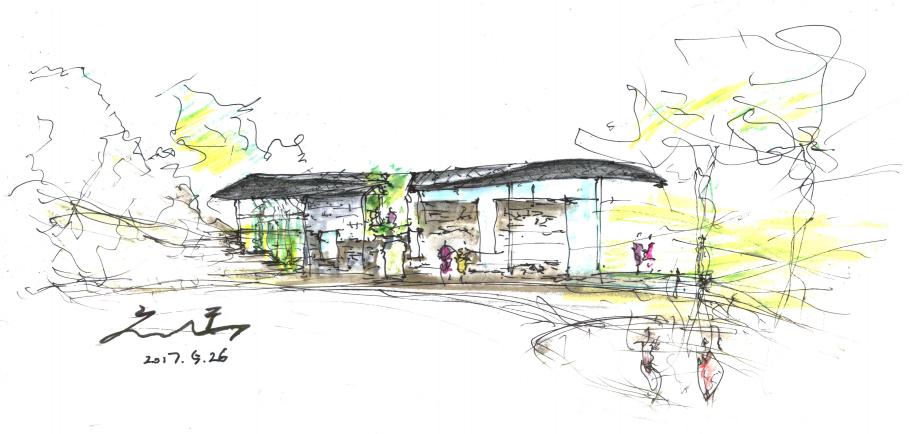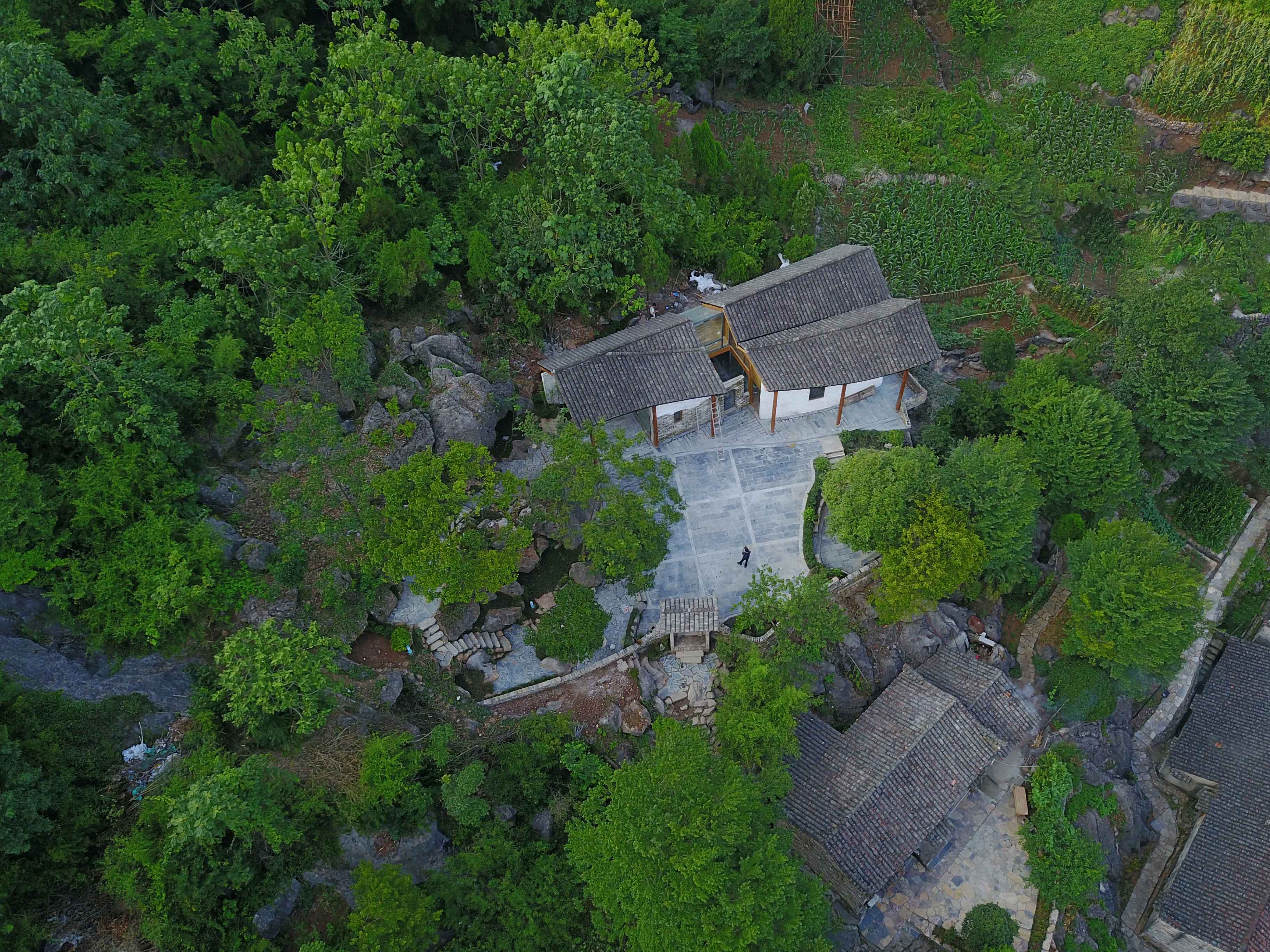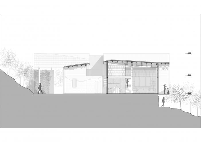 建筑南側(cè)是由入口空間展開的部分室外景觀,軟性的景觀元素旨在和建筑共同打造曲徑通幽的視覺通廊,并結(jié)合建筑的曲線屋面,將遠(yuǎn)處山巒引入建筑空間框定的畫境之中。西南側(cè)為一山門,從山下拾級而上,山門與建筑的中斷形態(tài)形成第一個框景,并與南側(cè)矮墻北側(cè)建筑一同形成了一個圍合的庭院;建筑西側(cè)檐下空間和喀斯特地貌巖石山體形成一個環(huán)形的石階游廊,從山門入口處起,從檐下庭院處止;東南側(cè)結(jié)合原有的一個高大喬木設(shè)置了下沉庭院,對其領(lǐng)域感加以限定,并置入石桌石凳,形成建筑室外的休憩場所。東側(cè)為落差不大的懸崖,建筑由此出挑2米;居者從建筑北側(cè)后門出來,由自然化的臺階和植被引導(dǎo),可達(dá)戶外臺地和作物種植區(qū)域,體驗遠(yuǎn)離塵世的鄉(xiāng)野趣味和田園畫境。