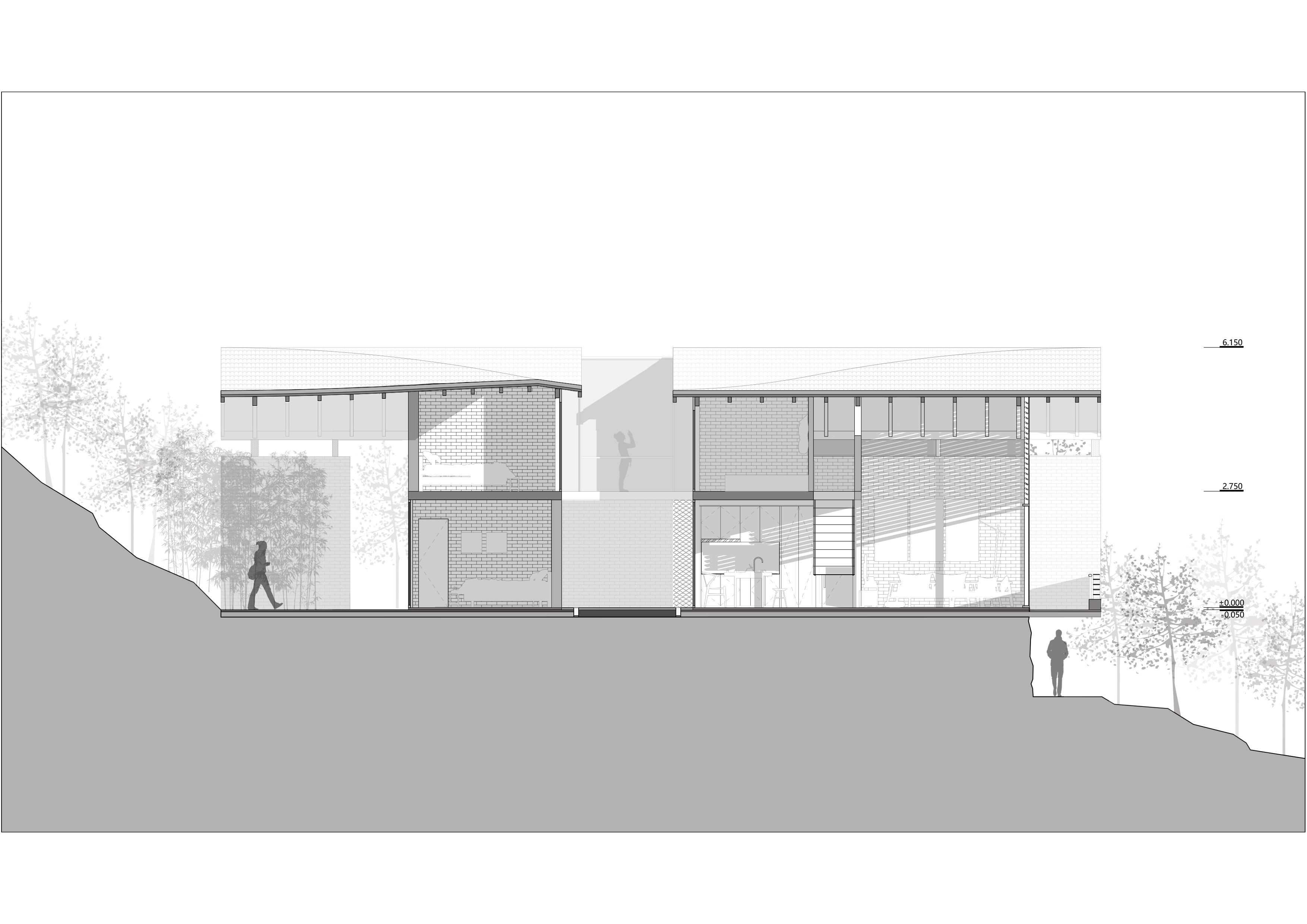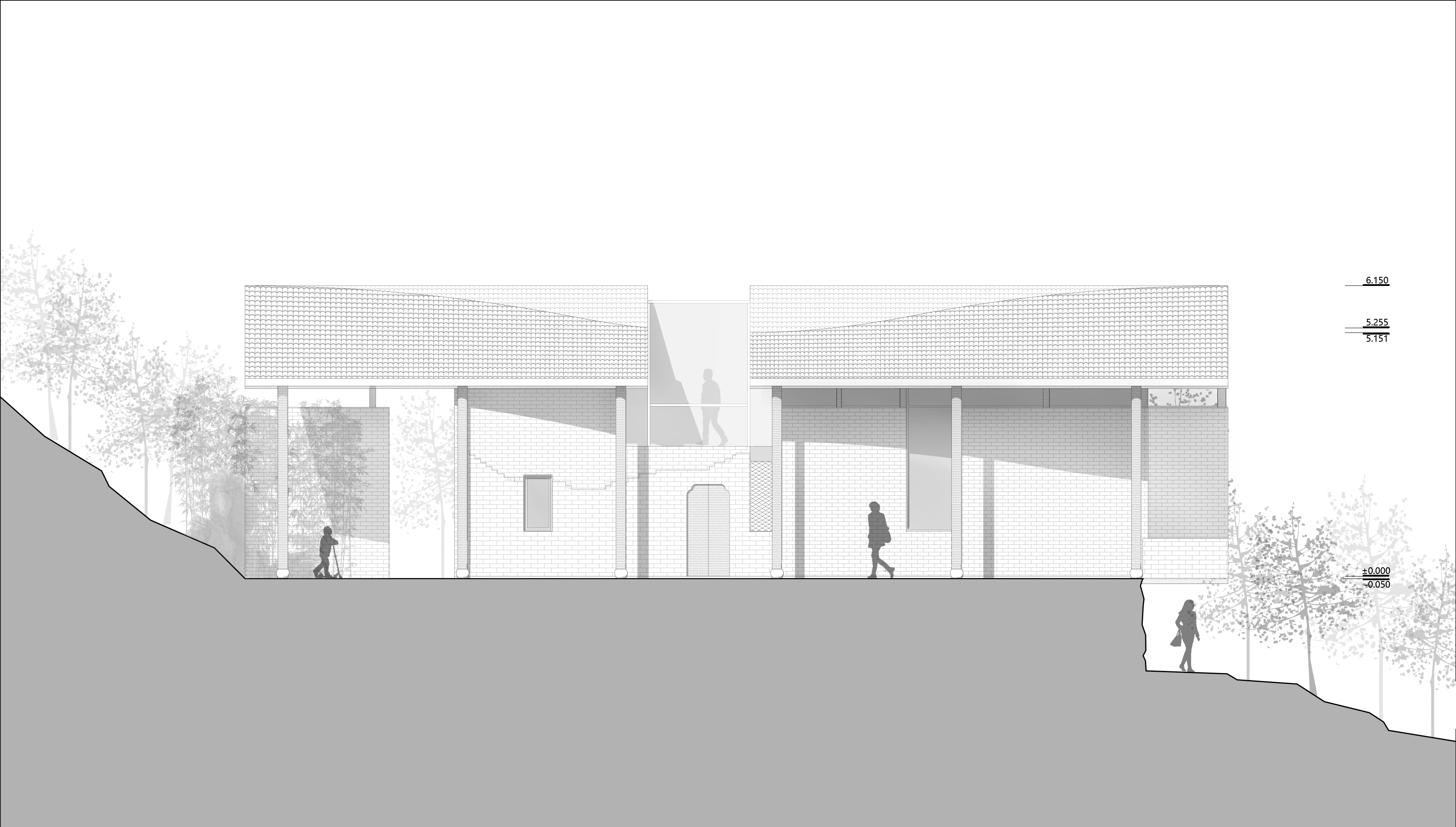 故其東側(cè)立面在原有建筑的單脊面一側(cè)又新生一脊,進一步暗示了這種雙生關(guān)系的線索,并形成一種寧靜的平衡。新脊自成一跨,其中一半并入原建筑外輪廓,另一半形成檐下外廊,形成東立面上的虛實對比,并與南側(cè)的下沉庭院景觀形成對話。與南立面的橫向展開的散點透視關(guān)系不同,東向懸崖方向的姿態(tài)更加傾向于一種單點透視的主體畫面感,從中透射出的室內(nèi)的銅飾構(gòu)件及出挑的露臺和挑檐,昭示著一種活力和期待感。