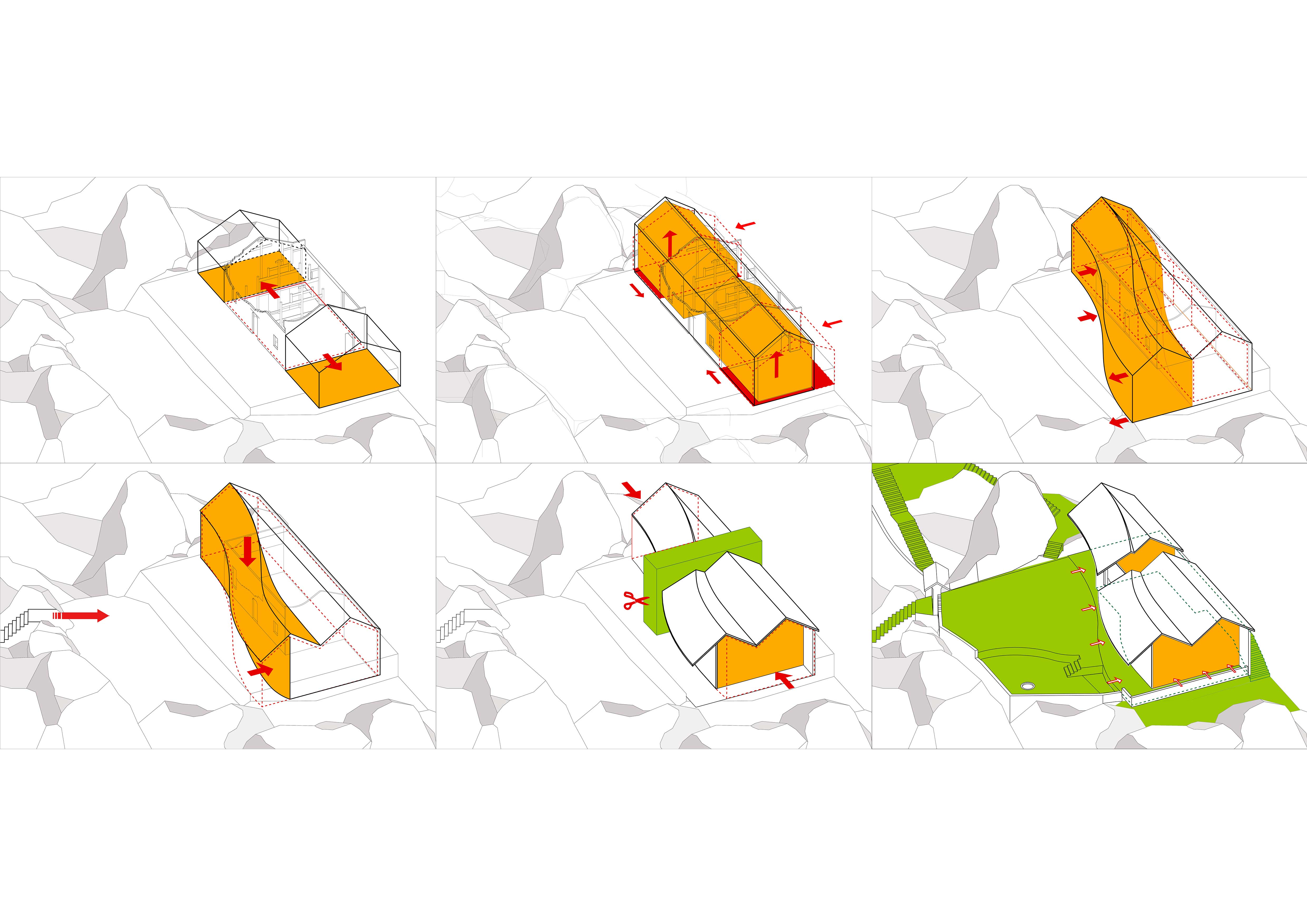 故而從平面布局上我們考慮西向增加一跨直抵一側(cè)巖石山體,南北向部分增加一跨以形成較寬闊的起居室空間;并在平面上部分引入曲線,一個異化的虛體從原有投影輪廓中抽離出來;由于原有層高的限制和原有屋面完全破損不能再用,我們選擇將原有建筑加高至兩層,并結(jié)合平面上抽離出的雙生虛形在空間上放樣拉伸,并將前面的部分脊線壓低,形成前后錯落的空間連續(xù)曲面。傳統(tǒng)的折面屋面和旁邊抽離出來的流線型融合成一體,并暗合了中國文化道生一一生二的宇宙觀;整個屋面以青瓦覆蓋,在鳥瞰角度形成獨特的形態(tài),與現(xiàn)有的古村落,既融合又出挑,并將室內(nèi)空間的特征從外部進行首次表述。