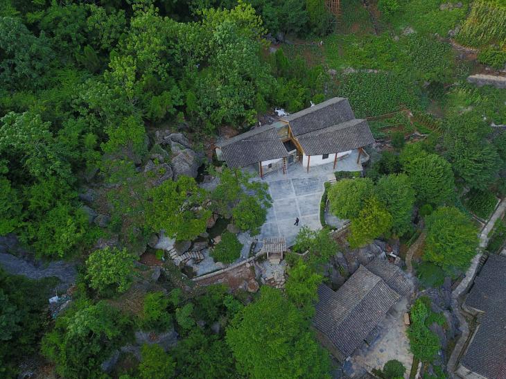 傳統(tǒng)性與當(dāng)代性在現(xiàn)今中國的建筑實踐中永遠(yuǎn)都處于一種交織中的并行狀態(tài)。就像銅陵山居這個項目,起始于一幢徽州與沿江風(fēng)格融合的普通民居,地處皖南一個僻靜山村。原有建筑處于全村最高的山頂,占地較小,且現(xiàn)狀及為殘破,已逾十年未有人居住,故其四周皆為雜草和灌木覆蓋;其東西向三跨,南北向一跨,原有屋面和墻體損毀嚴(yán)重。