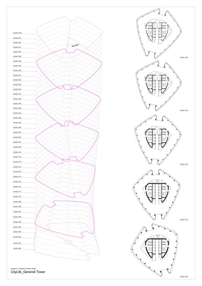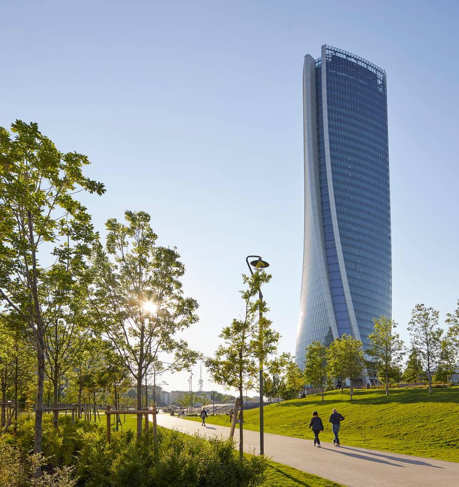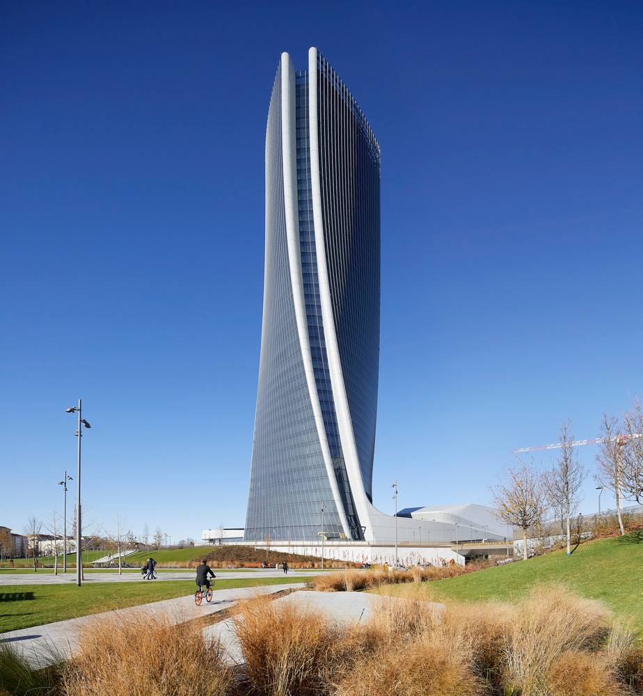 這座170米高(44層)的忠利大廈與周圍的公共廣場和公園相連接,并與 CityLife 商業(yè)區(qū)中的三個主要軸線保持一致。它那幾何曲線造型是基于該建筑的三個城市軸線交叉點所產(chǎn)生的向心力所定義的。