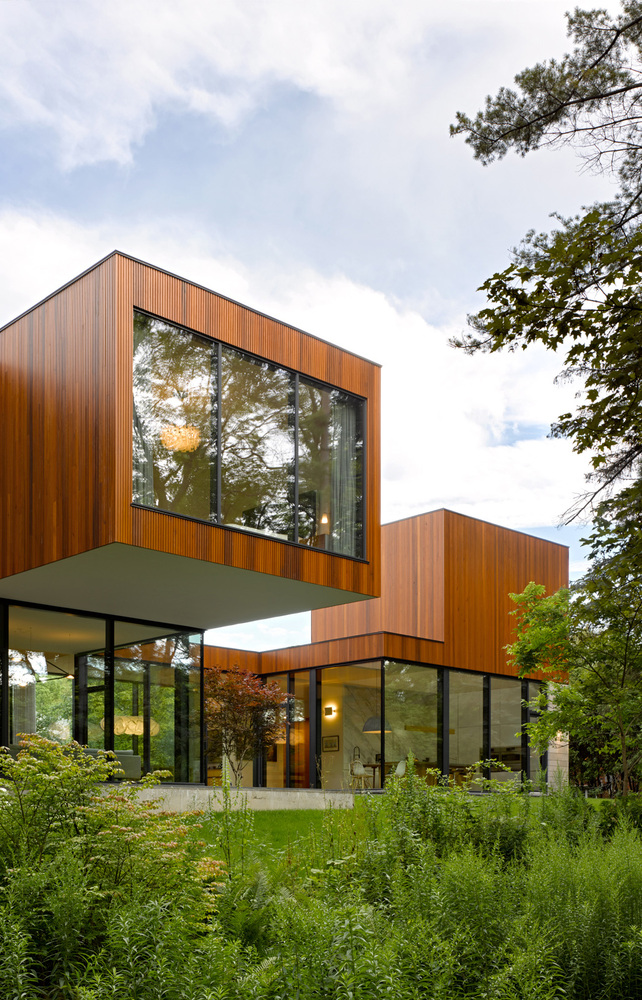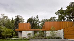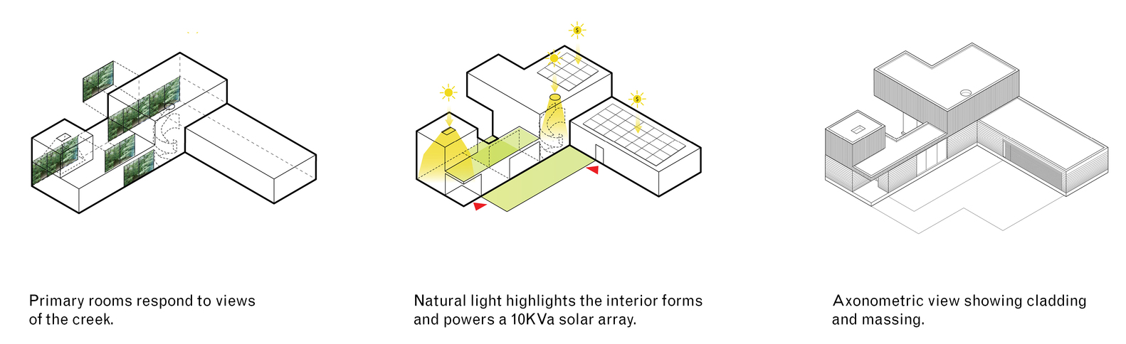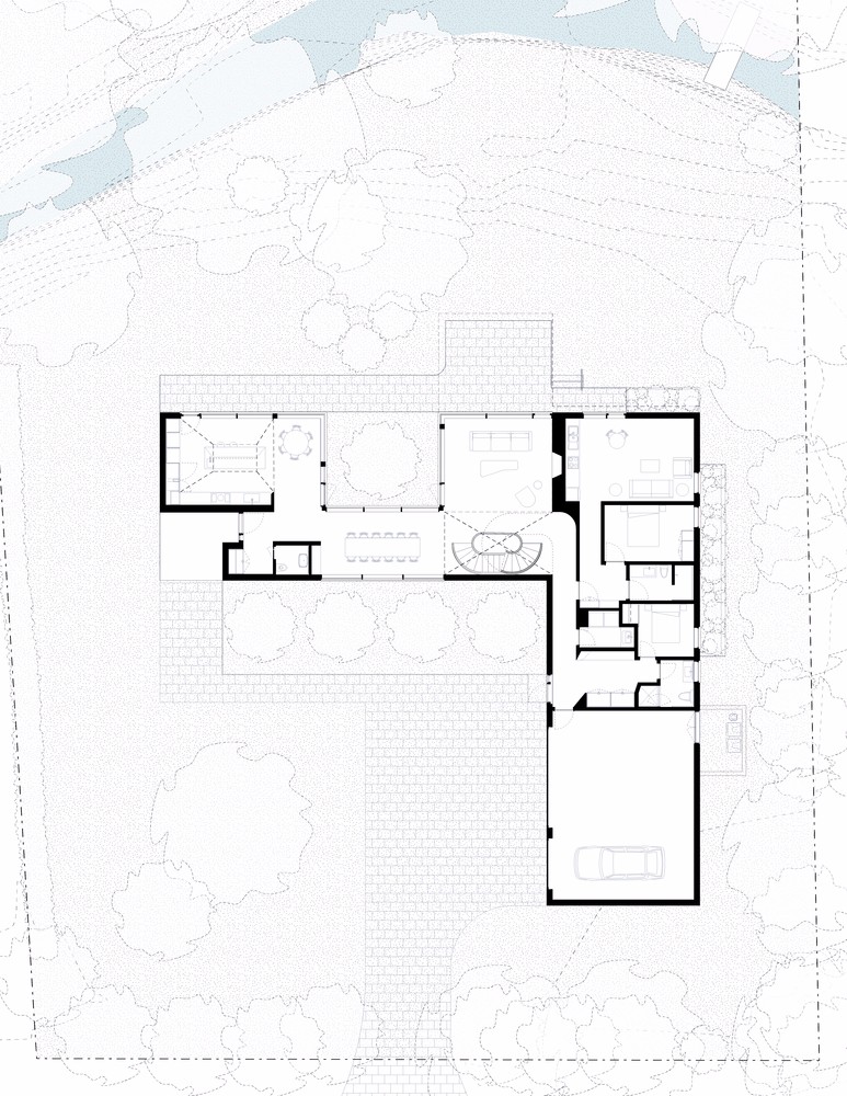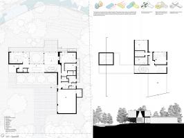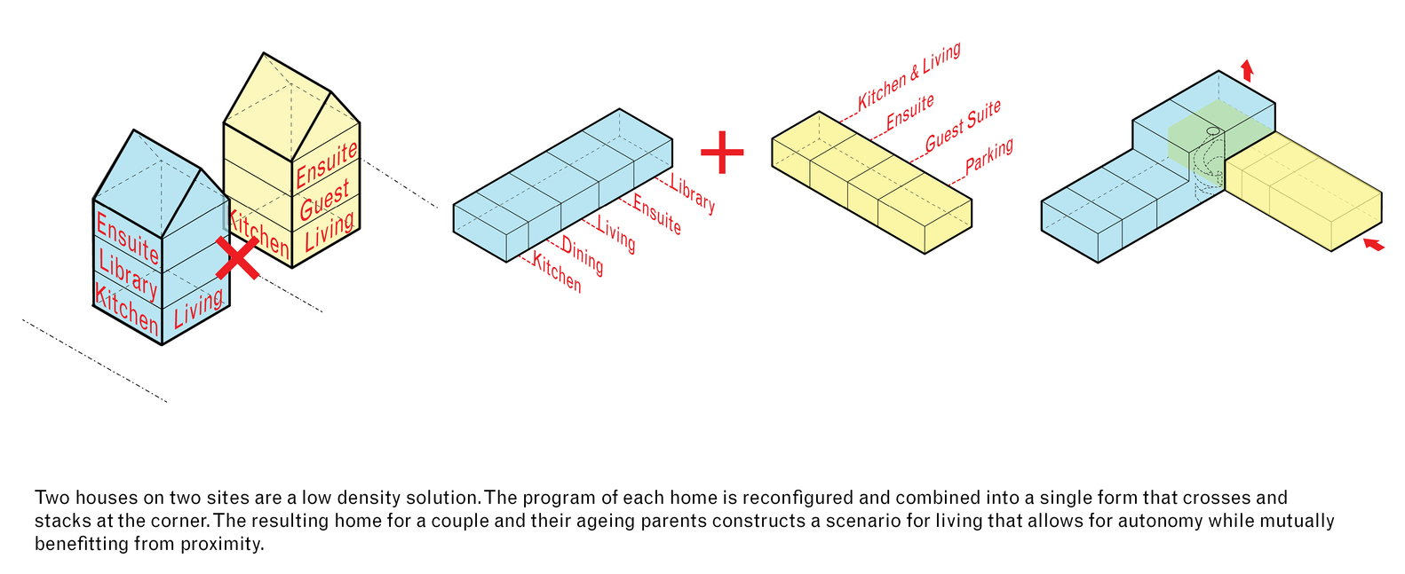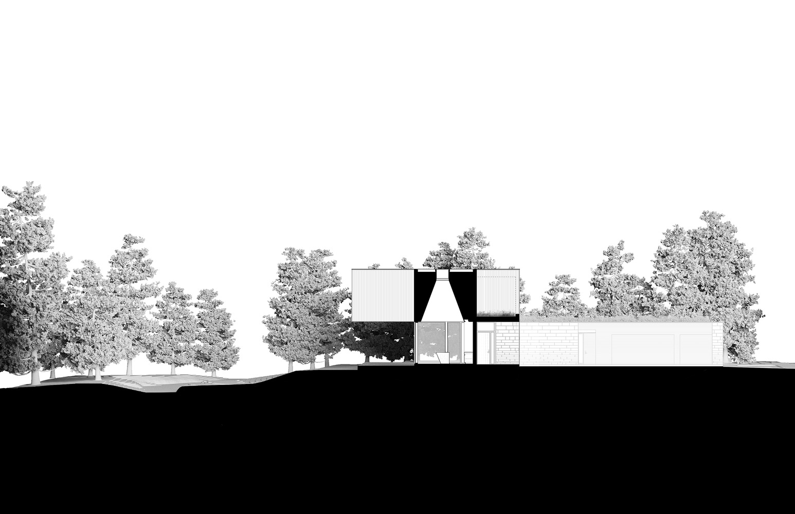 安卡斯特溪背后廣闊的地塊上坐落著一座國際化的家庭住宅,一對夫妻和他們年老的父母居住在此。這座家宅內包含著兩座獨立住宅,它們在呈現(xiàn)出線性排布同時也具備家庭住宅的所有功能。兩座住宅相互垂直形成角落,充當一塊隔離出街道的庭院。