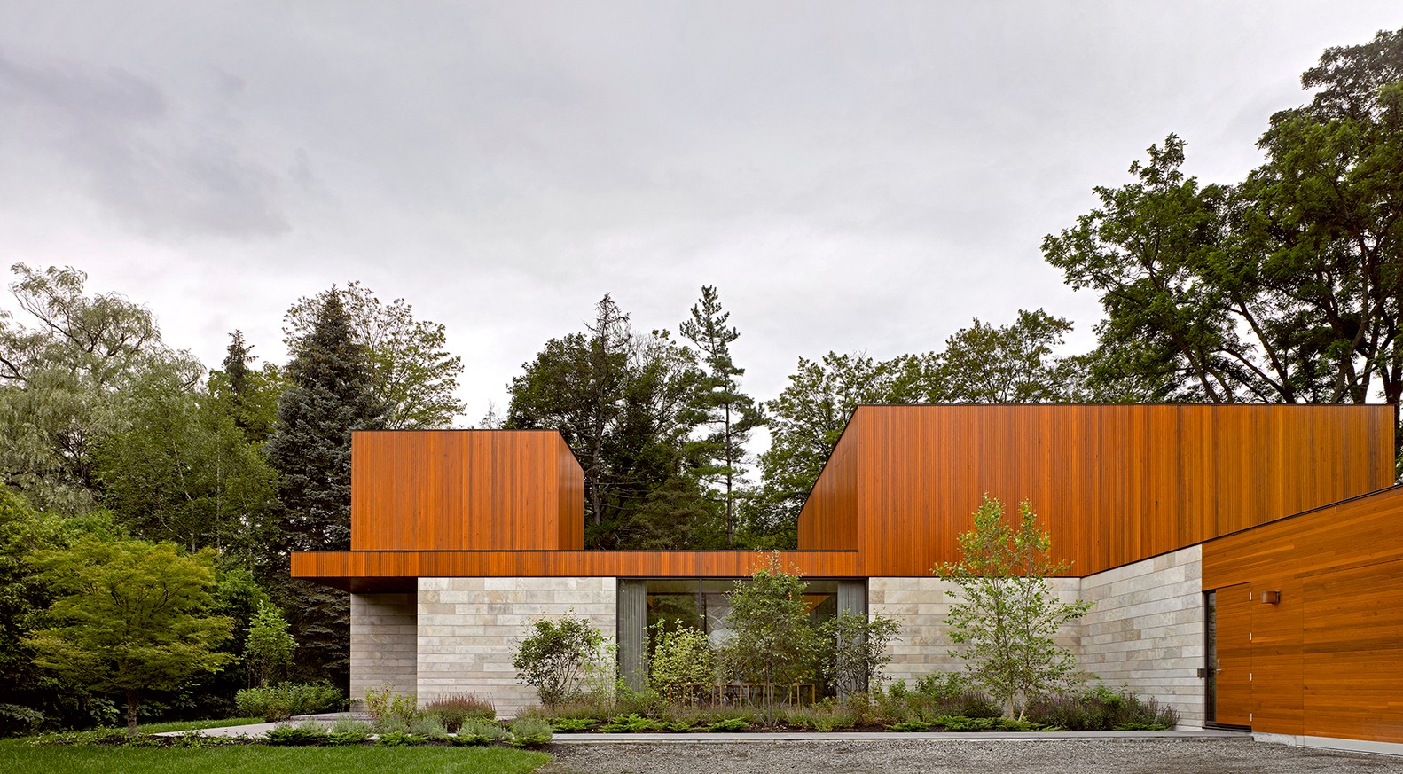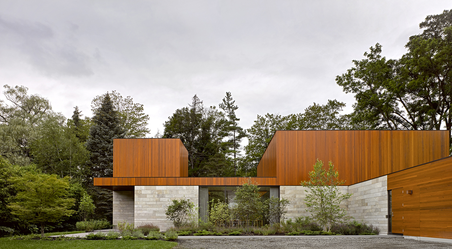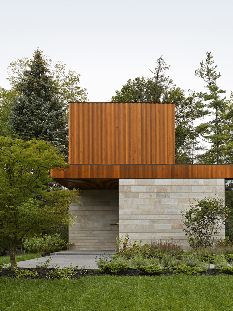 在房屋的地面層,環(huán)繞建筑周邊鋪設了8.89厘米厚當地開采的阿爾岡金石灰石。這種設計形式旨在強調著沉積巖石的獨特張力和分層特質。墻面頂層石塊有30厘米高,向下石塊高度逐漸減小,底部石塊只有10.16厘米高。石塊的相互交叉構成水平處的連接,垂直方向上的石塊被填充平齊,強調了墻面的平整。