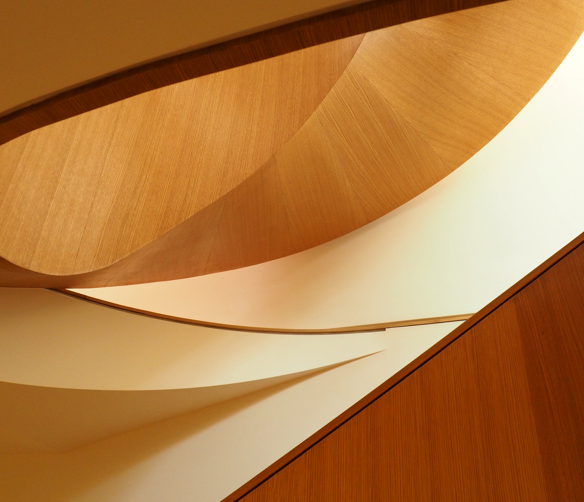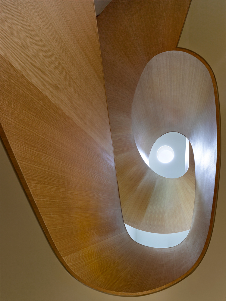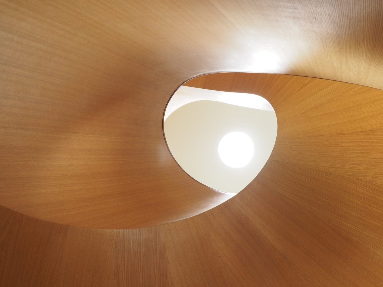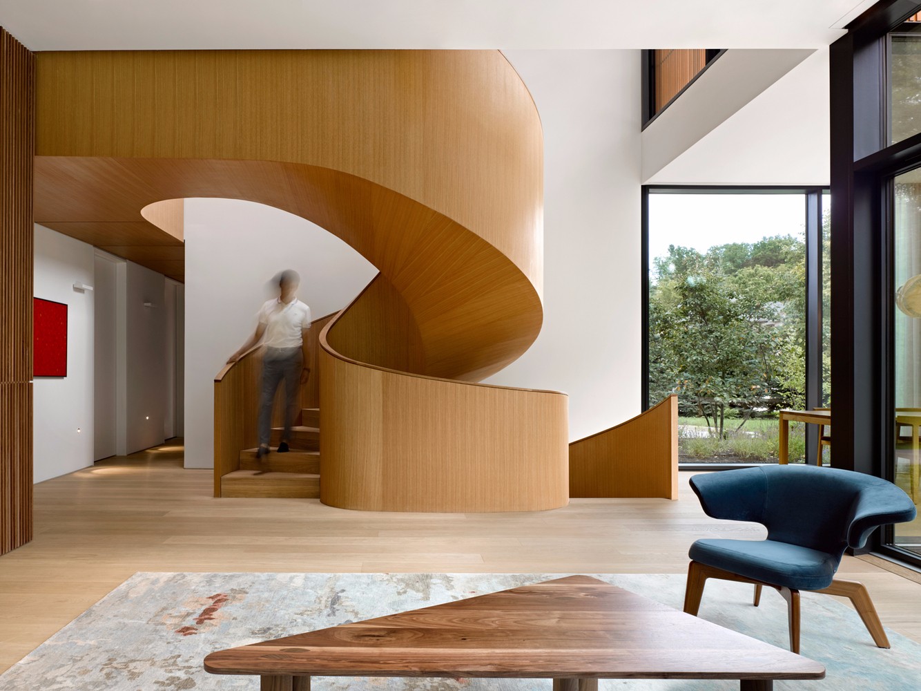 壯觀的木制螺旋樓梯將二樓主套間和三樓連接起來,樓層與樓層之間的空間以這種獨特的方式相互交匯。這些開放的曲線在上升的同時轉化成相鄰走廊的天花板,像風車一樣連接著父母的套間。