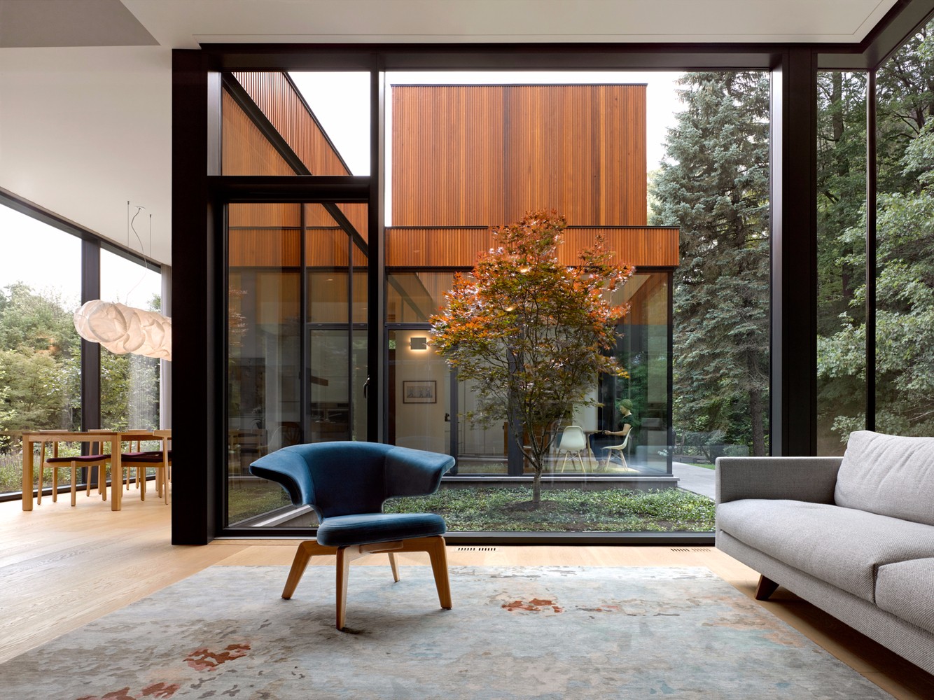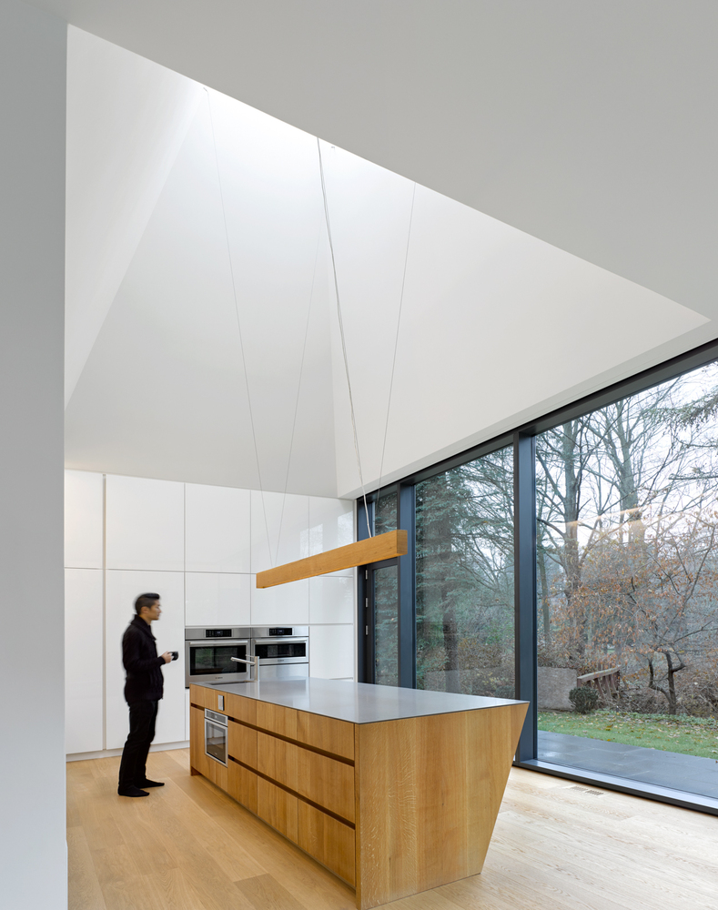 與小溪平行的是主住宅。廚房位于住宅的南端。約1.86米雙層高度的金字塔形的天花板使得空間格外開放,庭院的流水美景和廣闊天空盡收眼底。