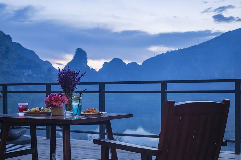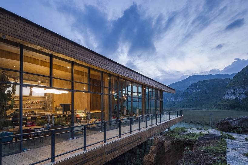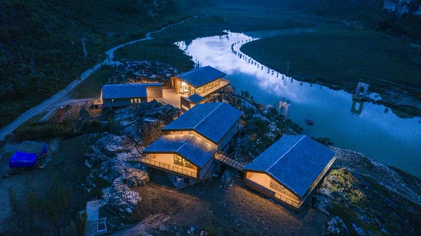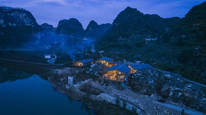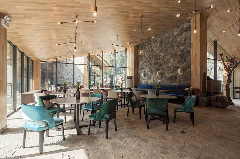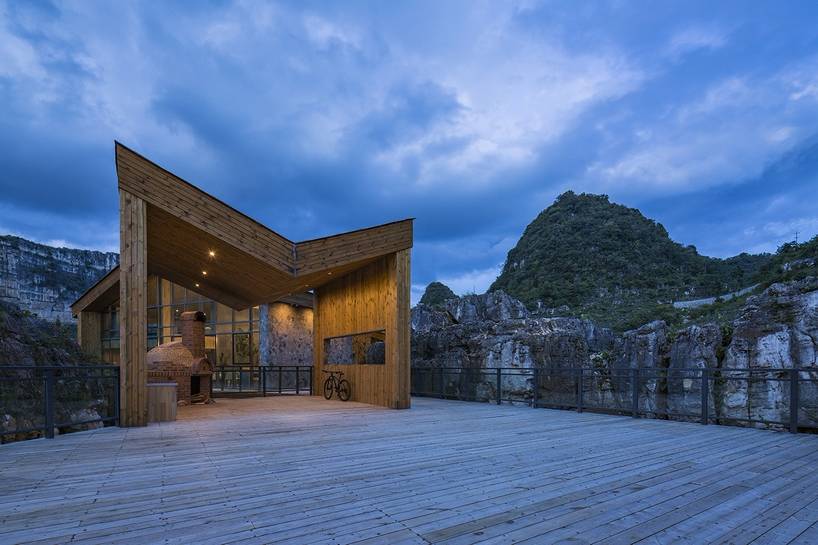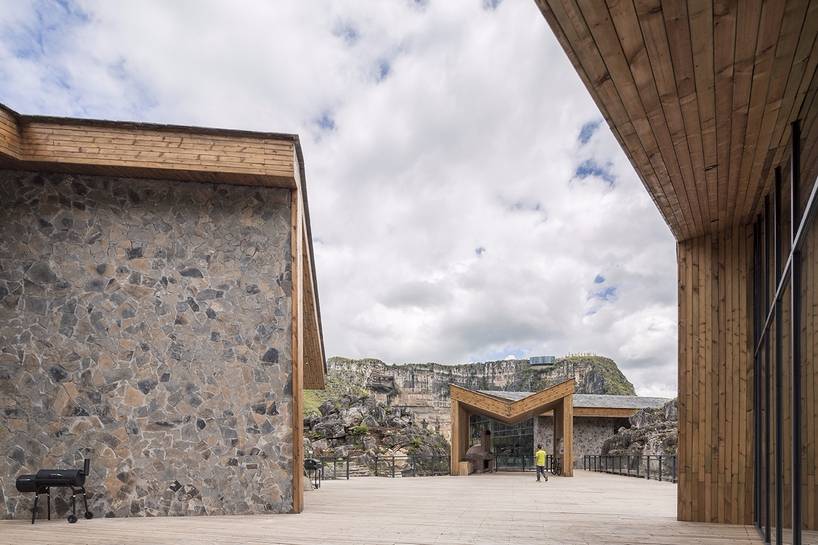 場(chǎng)地周邊環(huán)境是吸引人來這里最重要的原因,群山、百米崖壁、河流、怪石、天坑……設(shè)計(jì)師希望服務(wù)中心能為游客提供觀賞周邊環(huán)境絕佳的視角。為此,建筑單體的外立面被打開,根據(jù)建筑與周邊山石,遠(yuǎn)處景觀的關(guān)系形成對(duì)景和框景。