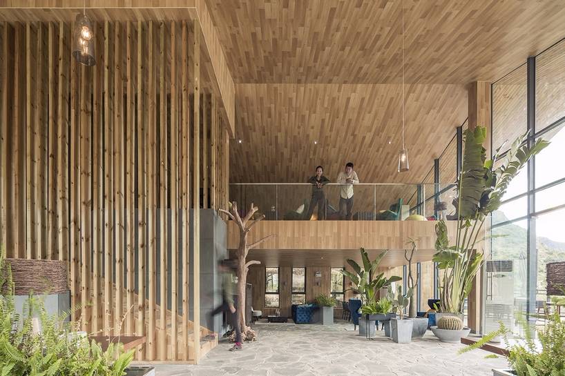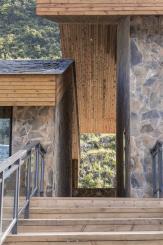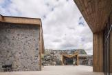 建筑的外觀力求具有鄉(xiāng)土性,或者在地性。設(shè)計(jì)師通過對(duì)附近村莊的調(diào)研,發(fā)現(xiàn)此地區(qū)的傳統(tǒng)民居多為雙坡頂,外觀看為一層,但室內(nèi)有夾層;外墻多為毛石搭建而成,粗糙中顯著質(zhì)樸的美,木材的運(yùn)用是民居外觀的第二種語言。新的建筑也希望能延續(xù),或者回應(yīng)這種語匯,即:雙坡頂單層建筑的形成,外立面主要由石材與木搭配完成;當(dāng)然既然是新的建筑,就一定會(huì)有一些突破或者變化,設(shè)計(jì)師并不準(zhǔn)備百分百的照搬原始民居的形式。在屋頂與墻面的關(guān)系上,在外立面的開窗處理上,在外立面材料的選擇上,設(shè)計(jì)師都根據(jù)實(shí)際情況作了調(diào)整。這些調(diào)整有的是積極主動(dòng)的,有的也是出于現(xiàn)實(shí)條件和現(xiàn)行規(guī)范的限制。