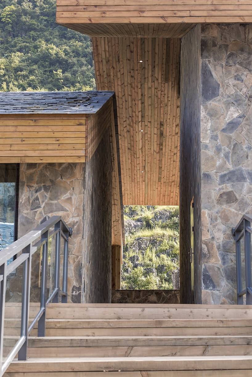 外墻沒能使用傳統(tǒng)的毛石壘砌的方式一直是本項(xiàng)目的遺憾。設(shè)計(jì)師認(rèn)為原始的民間工藝比現(xiàn)在的外立面裝飾手法更真實(shí)和質(zhì)樸傳神,但現(xiàn)行的規(guī)范并沒有收錄毛石壘砌的工藝,這導(dǎo)致在報(bào)規(guī)過程中,毛石壘砌是不被接受的;此外因?yàn)榇说氐乃臈l件非常復(fù)雜,在汛期谷底最高水位和平時(shí)水位的高差有十米以上,這就要求此建筑必須具有防汛的處理。設(shè)計(jì)師在實(shí)地考察和詢問地方相關(guān)部門的情況,最終采用將建筑抬起,建于高架平臺(tái)上的方式。這種處理方式可以很好的解決防汛的問題,同時(shí)也對(duì)場(chǎng)地影響最??;但同樣高架平臺(tái)和鋼結(jié)構(gòu)的處理方式(工期要求)無法滿足毛石壘砌的局部荷載要求。這也是設(shè)計(jì)師最終放棄這項(xiàng)傳統(tǒng)工藝的原因。