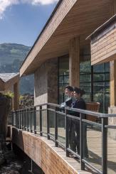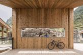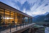 新的建筑的功能是復(fù)合的,它包括游客和運(yùn)動(dòng)員的接待,辦公、會(huì)議、餐飲、酒吧,以及戶外聚會(huì)等。為了盡量不破壞原有山丘的環(huán)境和地形,建筑被化整為零。根據(jù)功能,四個(gè)獨(dú)立的單體被組織起來,插入基地中大塊的山石之間,形成建筑避讓原始環(huán)境元素的模式。建筑與山石之間或緊鄰,或適當(dāng)拉開距離,建筑隱于山石之間,山石成為建筑的掩體,自然造物與人工造物融為一體。由于地形的高低起伏,建筑體也坐落在不同的高程上,設(shè)計(jì)并沒有刻意將場(chǎng)地拉平,而是因勢(shì)利導(dǎo),充分利用場(chǎng)地的起伏,形成豐富的高度變化。這也讓新的建筑更好的融入環(huán)境,同時(shí)也豐富了空間的體驗(yàn)。各個(gè)建筑由木平臺(tái)連接,平臺(tái)除了交通功能外,也為使用者提供了戶外公共活動(dòng)的場(chǎng)地。在場(chǎng)地中部由建筑和山石共同圍合成一塊較開闊的場(chǎng)地,一座M形的亭子很好的控制著場(chǎng)地的空間層次,并為聚集提供了空間支點(diǎn)。