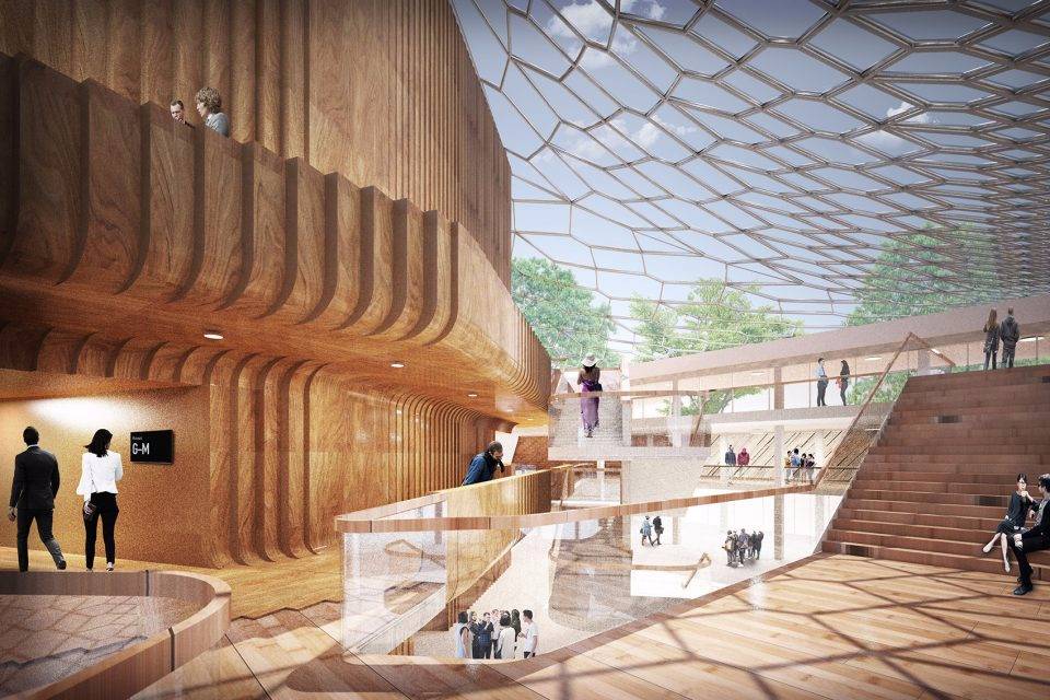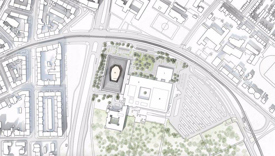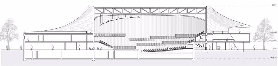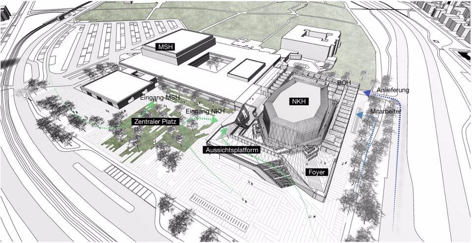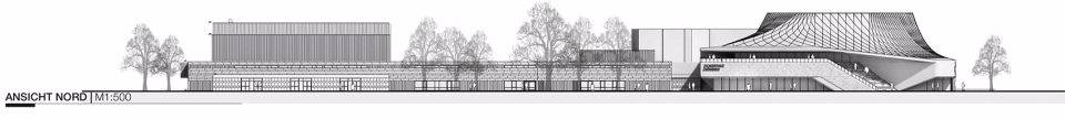 作為L(zhǎng)uitpoldhain城市公園的延伸,紐倫堡音樂(lè)廳與周圍的城市景觀將通過(guò)開(kāi)放的大廳和環(huán)繞在建筑周圍的空中走廊實(shí)現(xiàn)無(wú)縫式的融合。結(jié)構(gòu)獨(dú)立的音樂(lè)廳與Meistersingerhalle市政文化中心共同形成了一個(gè)相互連貫的前院和主入口。大廳與靠外墻分布的一系列公共空間為整個(gè)音樂(lè)廳帶來(lái)了活力,并一直延伸至Meistersingerhalle市政文化中心。