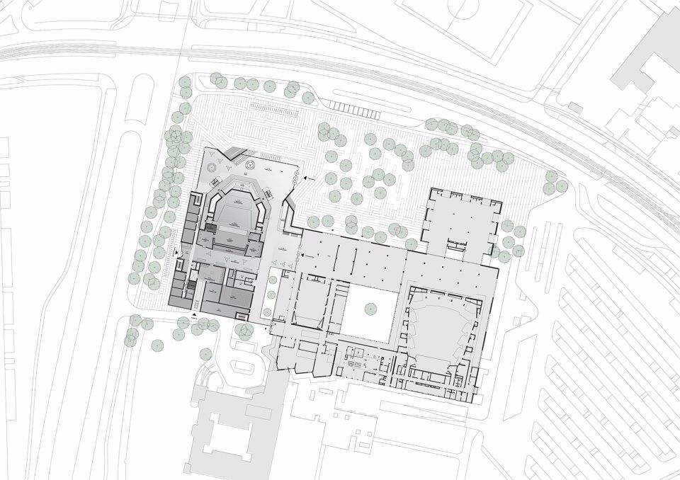 建筑的布局遵循了明確的功能劃分:位于前方的建筑為公眾服務(wù),位于后方的建筑則為藝術(shù)家和工作人員服務(wù)。游客入口直接與垂直的中庭相連,所有與訪客和音樂(lè)會(huì)相關(guān)的功能區(qū)域均沿著大廳布置,作為獨(dú)立音樂(lè)廳既有中庭的延伸。音樂(lè)廳周圍的露臺(tái)將大廳和餐飲區(qū)及休息區(qū)連接在一起,并直接將室外風(fēng)景引入室內(nèi)。員工入口的中央是設(shè)有寬敞的藝術(shù)家休息室,可直接通向舞臺(tái)和餐飲區(qū)。運(yùn)貨區(qū)、樂(lè)器室和藝術(shù)家更衣室均與舞臺(tái)位于同一樓層,便于實(shí)現(xiàn)高效的交通。