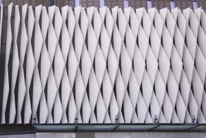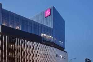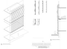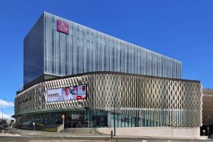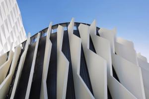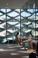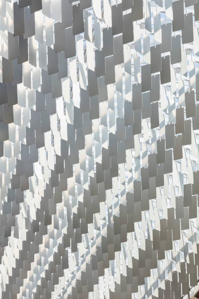 Sage 酒店(Sage Hotel)一共擁有120間客房。這座六層的酒店大樓使用上釉的玻璃進(jìn)行圍合,上釉玻璃的特殊紋理讓這六層的酒店大樓像是覆蓋了一層的白色起褶的窗簾一般,讓人印象深刻。在晚上,從酒店客房透出的光線,則將整棟建筑變?yōu)橐槐K光線不斷變化的燈籠。酒店坐落在一個(gè)停車場(chǎng)的頂部,停車場(chǎng)的外墻使用了形態(tài)不斷變化的魚(yú)鰭狀混泥土構(gòu)件,當(dāng)汽車高速駛過(guò)時(shí),它使整座建筑物呈現(xiàn)出一種動(dòng)態(tài)感。