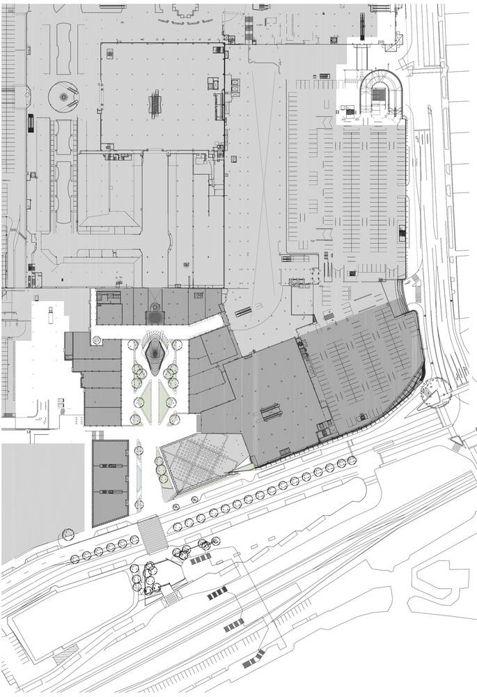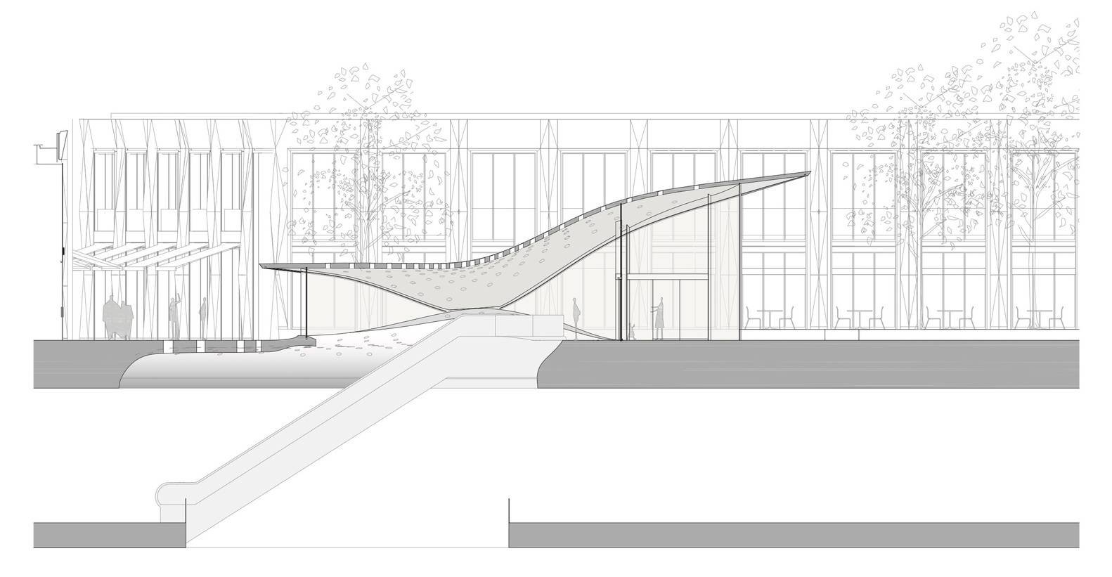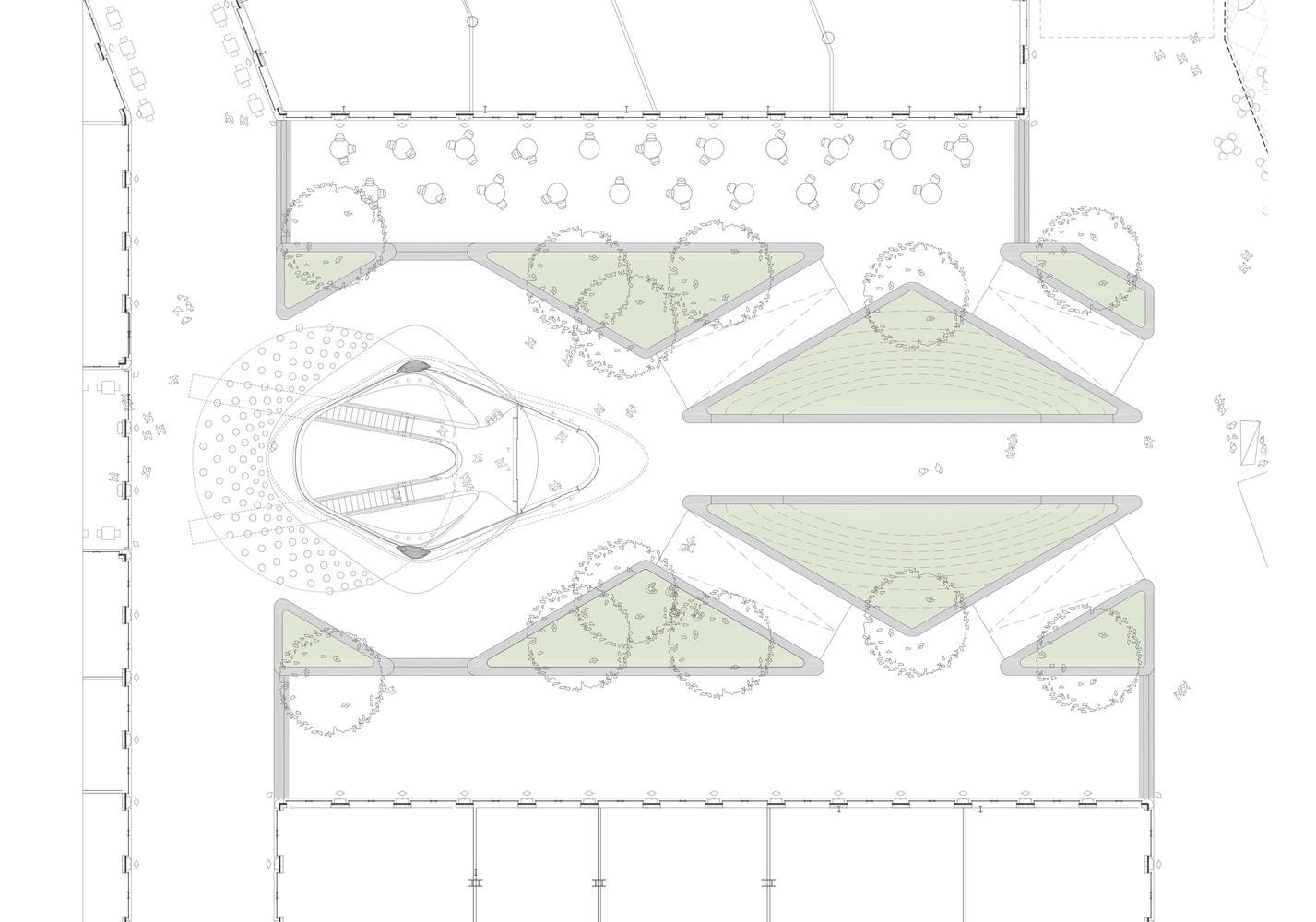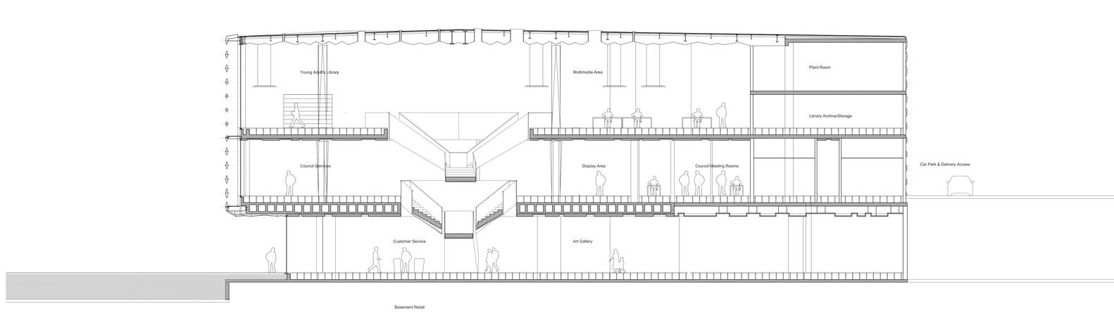 Shard作為商場(chǎng)的出入口,是廣場(chǎng)中心突出的一個(gè)體量。這個(gè)體量由透明的玻璃圍合,頂部則有一個(gè)起伏的屋頂。新的圖書(shū)館則覆蓋了2015年拆除了一個(gè)小型設(shè)施的場(chǎng)地,它是整個(gè)開(kāi)發(fā)項(xiàng)目的地標(biāo)性建筑。 作為一個(gè)裝載書(shū)籍和數(shù)字信息的大盒子,圖書(shū)館的體量似乎像是漂浮于其下的玻璃盒子之上。圖書(shū)館的底層作為公共區(qū)域,包括一個(gè)咖啡館,一個(gè)藝術(shù)畫(huà)廊和市民咨詢中心。