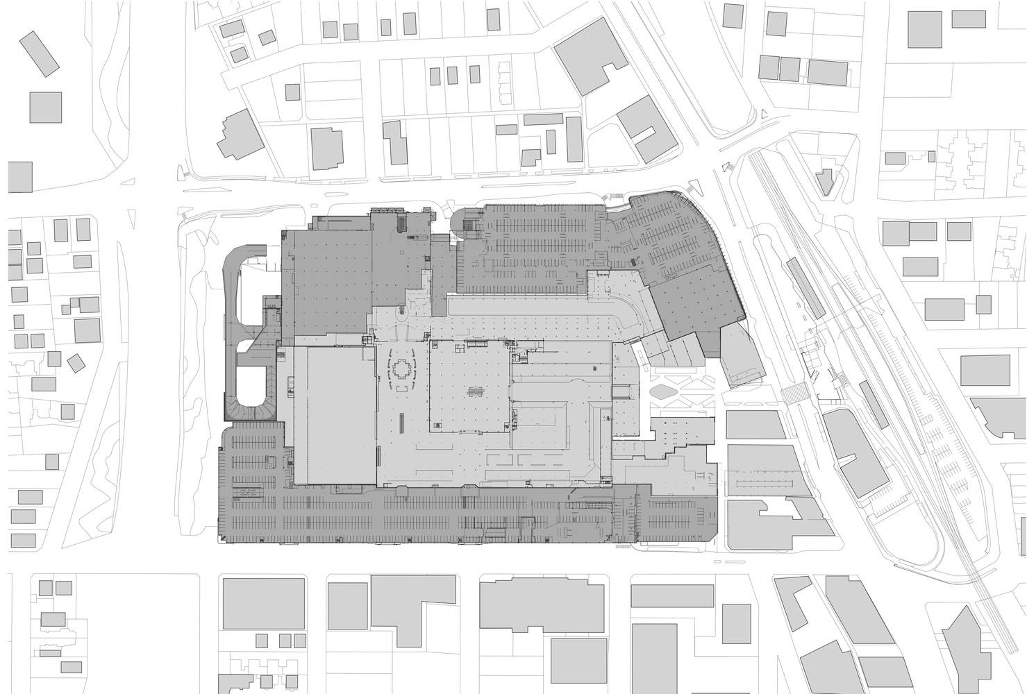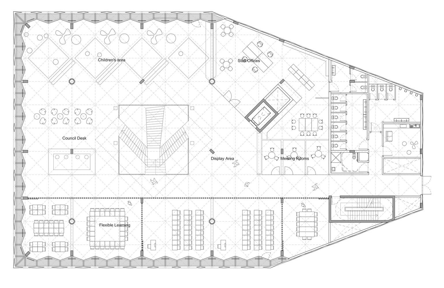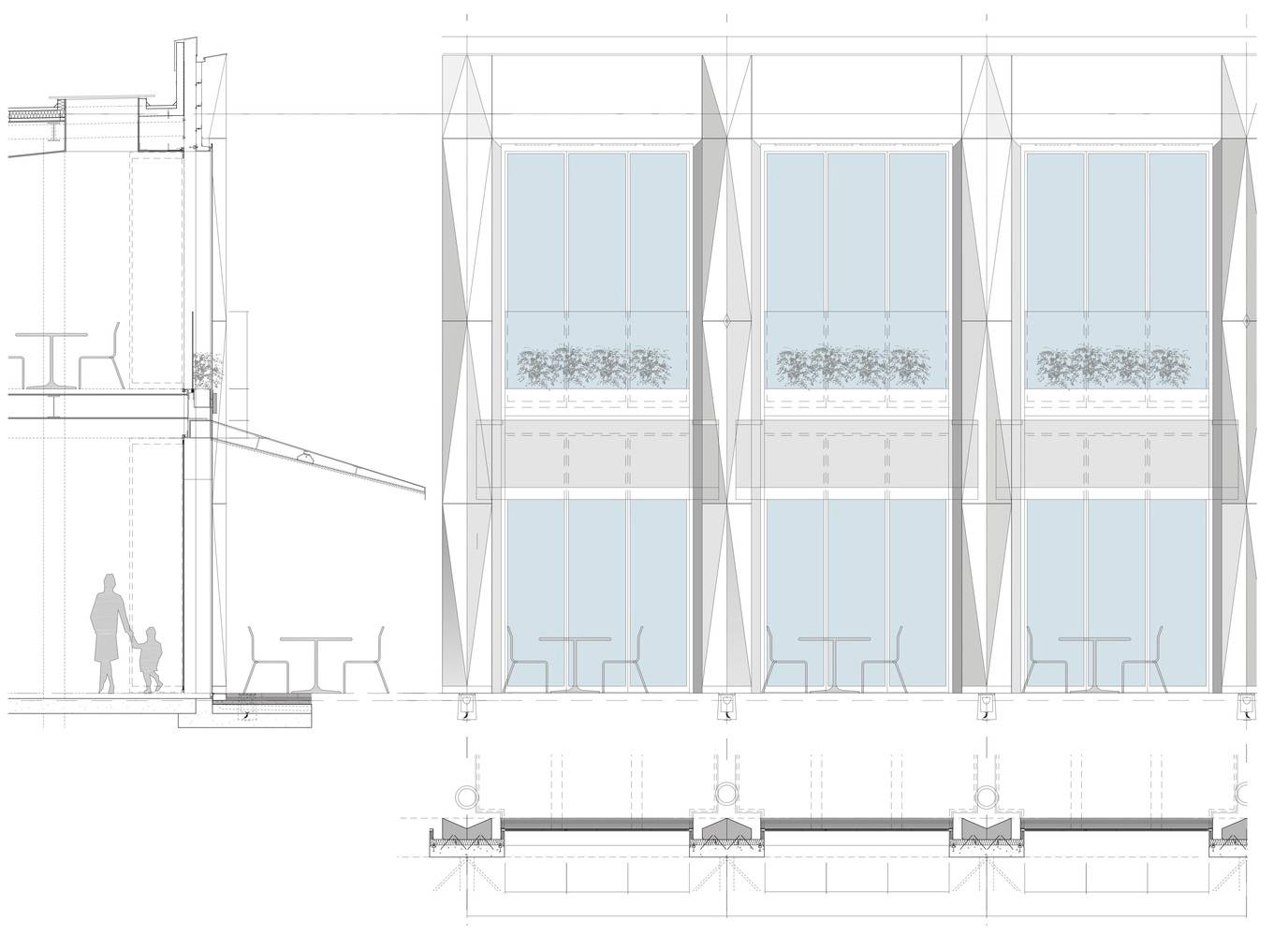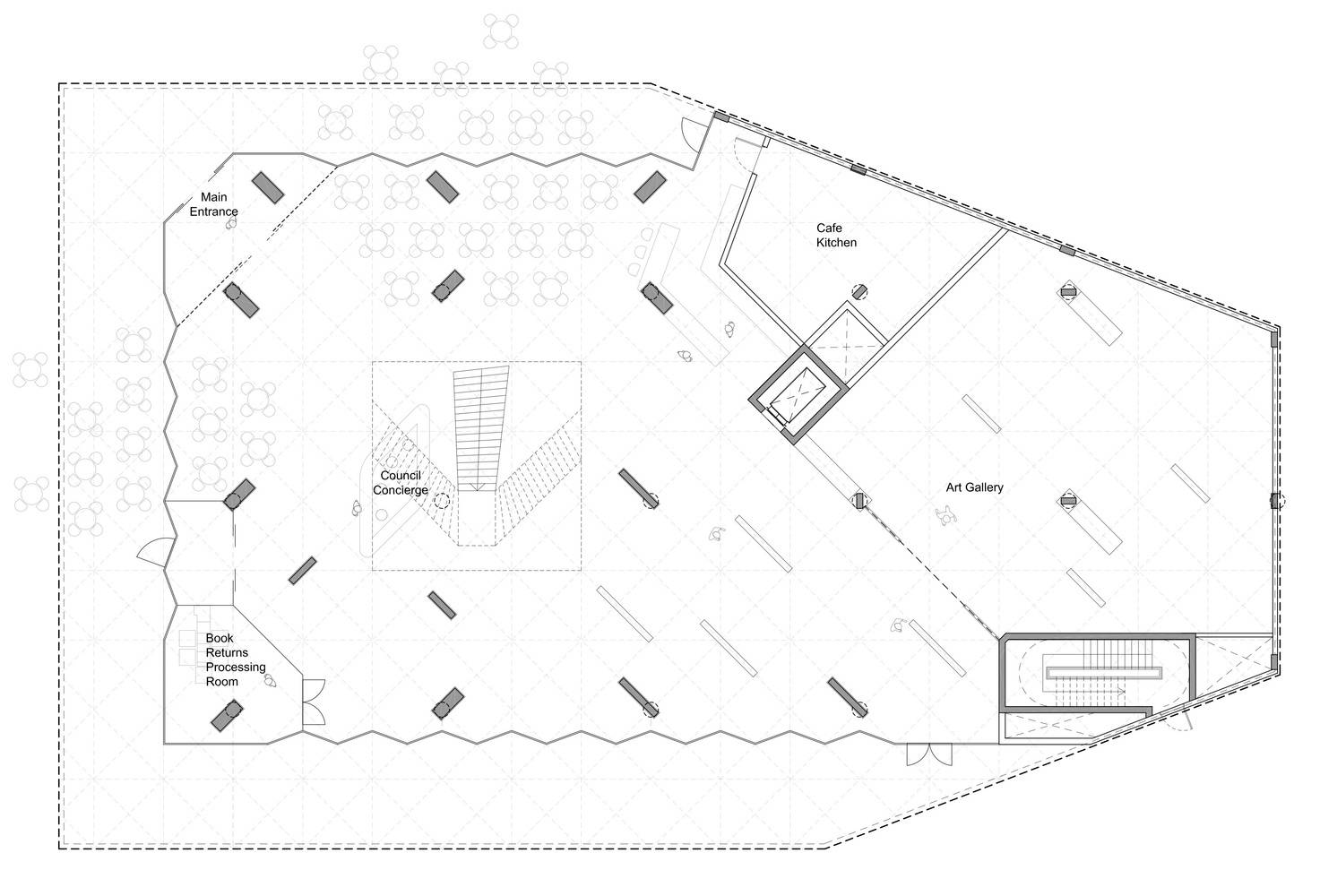 Shard作為商場(chǎng)的出入口,是廣場(chǎng)中心突出的一個(gè)體量。這個(gè)體量由透明的玻璃圍合,頂部則有一個(gè)起伏的屋頂。新的圖書(shū)館則覆蓋了2015年拆除了一個(gè)小型設(shè)施的場(chǎng)地,它是整個(gè)開(kāi)發(fā)項(xiàng)目的地標(biāo)性建筑。 作為一個(gè)裝載書(shū)籍和數(shù)字信息的大盒子,圖書(shū)館的體量似乎像是漂浮于其下的玻璃盒子之上。圖書(shū)館的底層作為公共區(qū)域,包括一個(gè)咖啡館,一個(gè)藝術(shù)畫(huà)廊和市民咨詢中心。