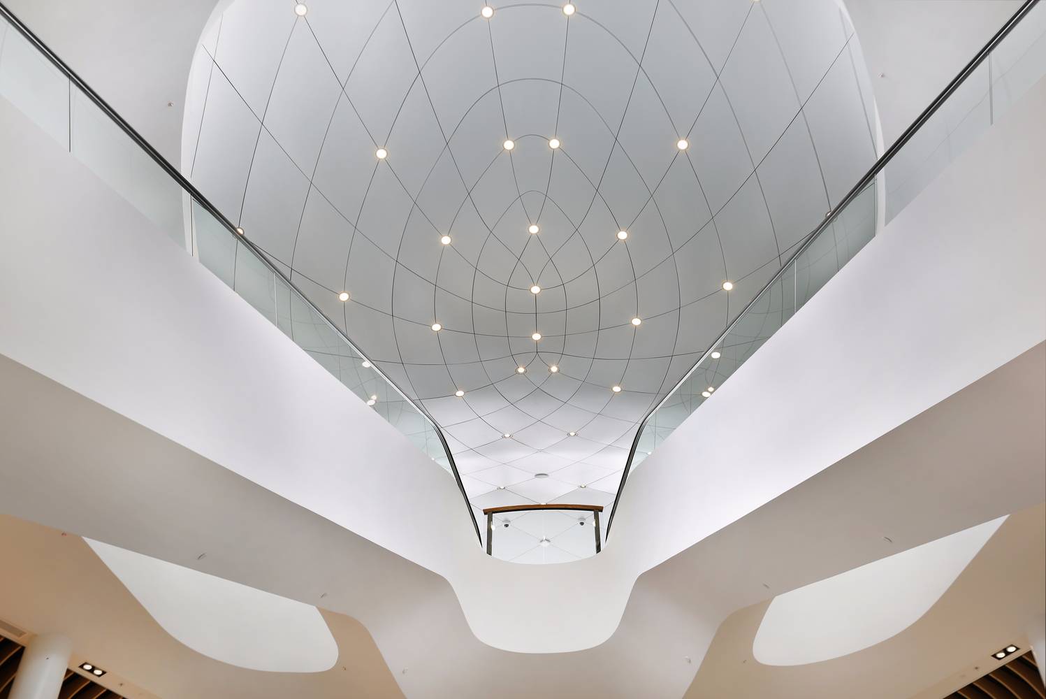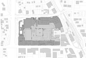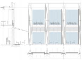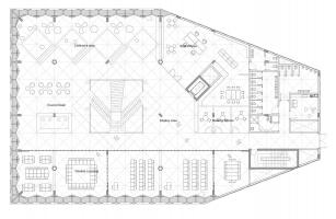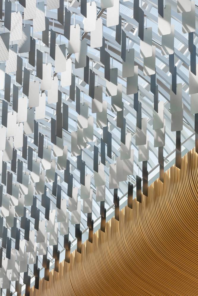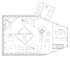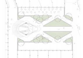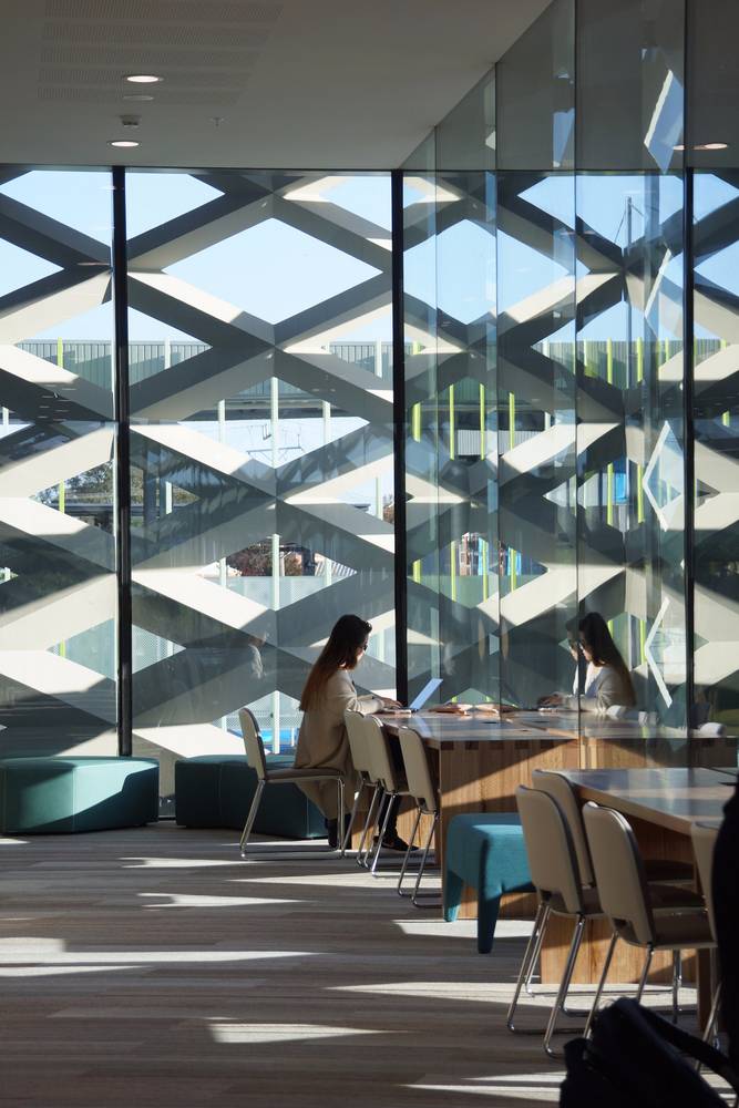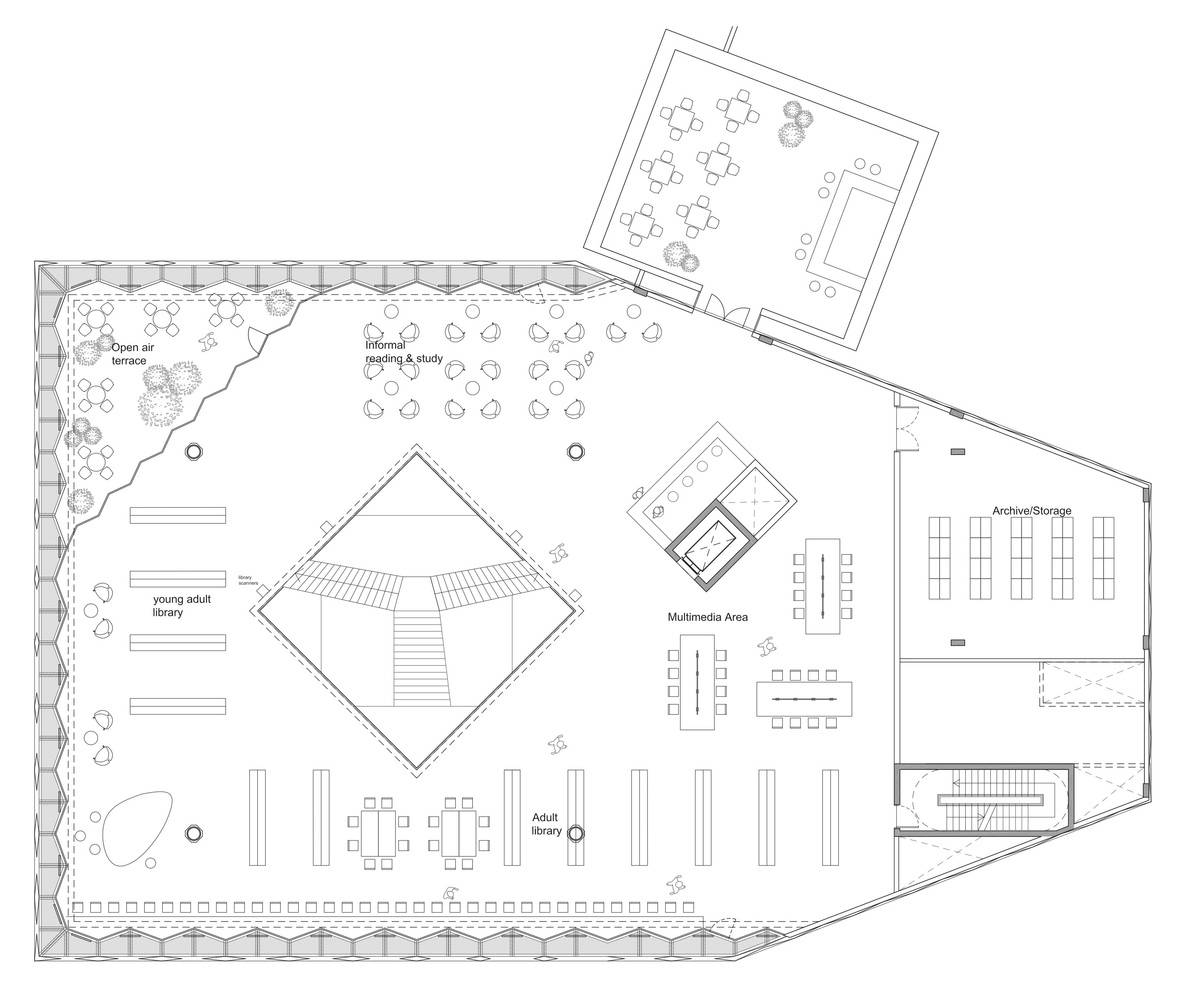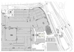 Shard作為商場(chǎng)的出入口,是廣場(chǎng)中心突出的一個(gè)體量。這個(gè)體量由透明的玻璃圍合,頂部則有一個(gè)起伏的屋頂。新的圖書(shū)館則覆蓋了2015年拆除了一個(gè)小型設(shè)施的場(chǎng)地,它是整個(gè)開(kāi)發(fā)項(xiàng)目的地標(biāo)性建筑。 作為一個(gè)裝載書(shū)籍和數(shù)字信息的大盒子,圖書(shū)館的體量似乎像是漂浮于其下的玻璃盒子之上。圖書(shū)館的底層作為公共區(qū)域,包括一個(gè)咖啡館,一個(gè)藝術(shù)畫(huà)廊和市民咨詢中心。