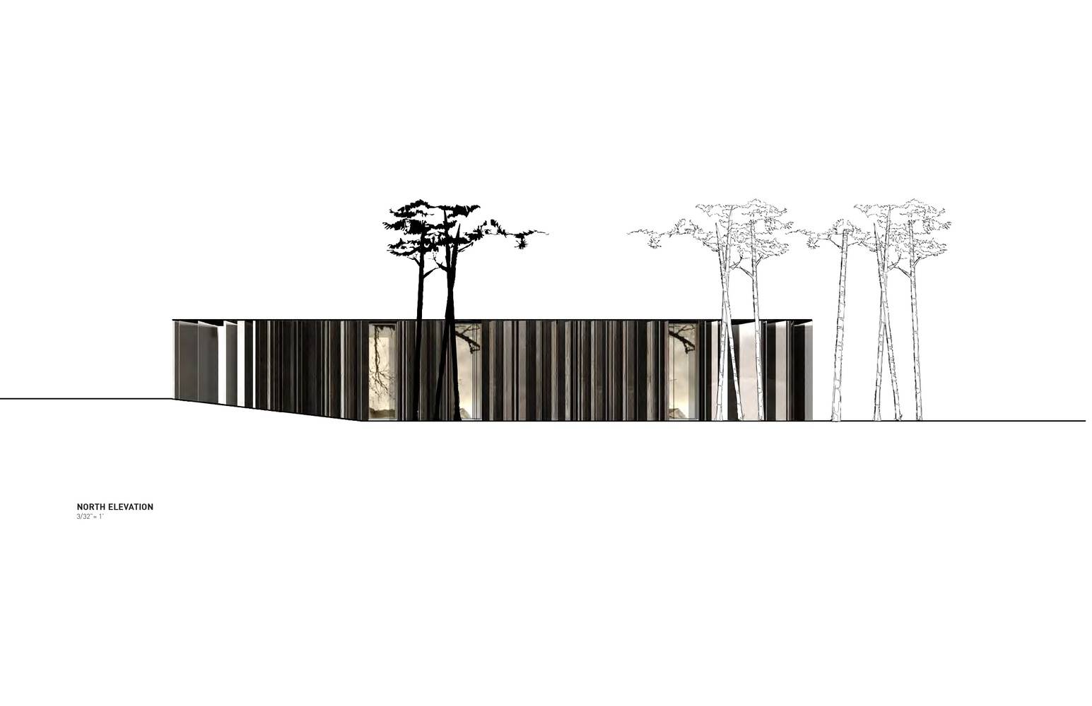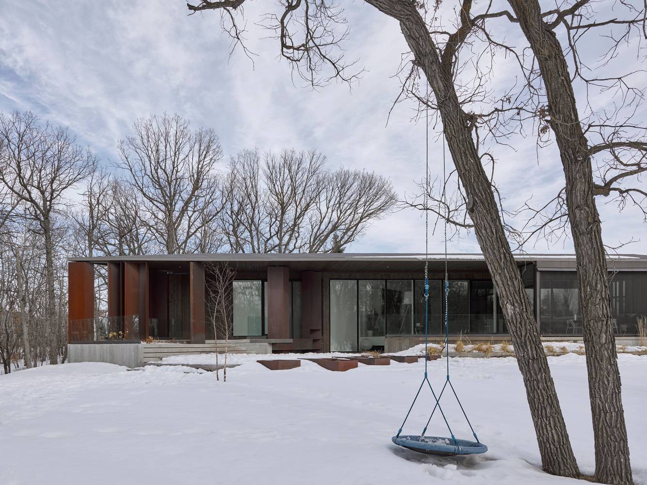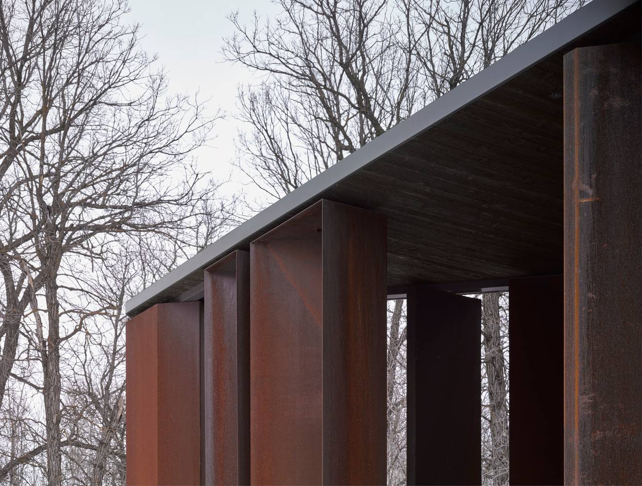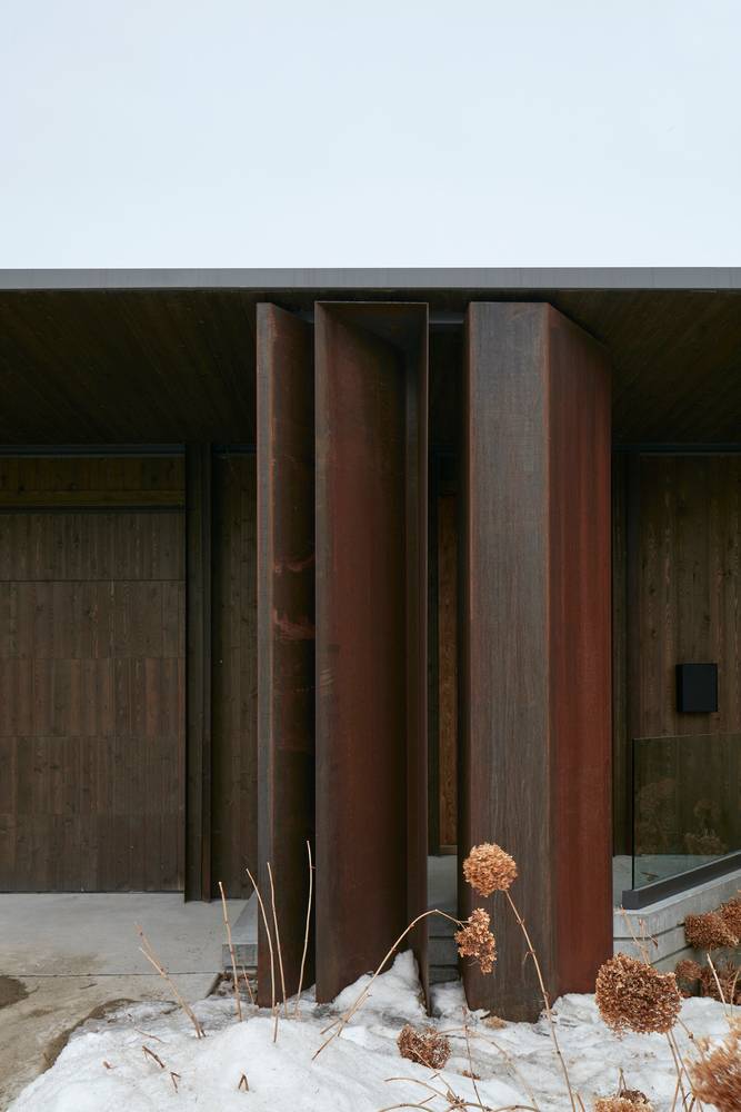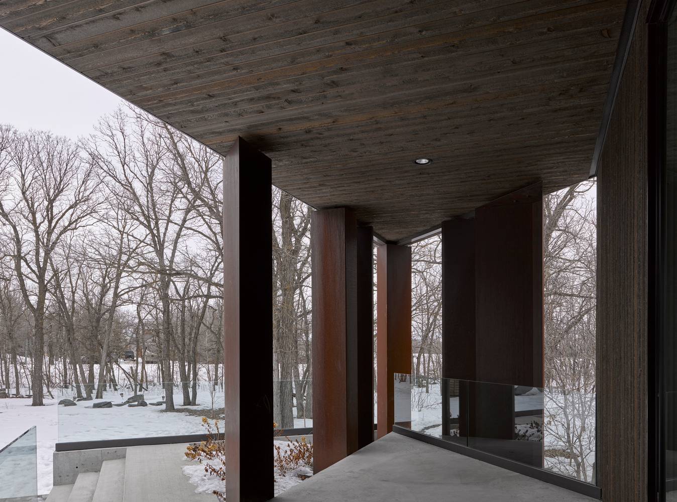 在外部,房子的表皮是自然染色的垂直模板。由木材包裹的拱腹延伸到開放的天井和遮蔽的門廊,以完成這個平行四邊形。由一系列U型的Cor-ten鋼柱支撐,它可以將視圖屏幕顯示在私人房間里,并讓人聯(lián)想到場地中的樹木。