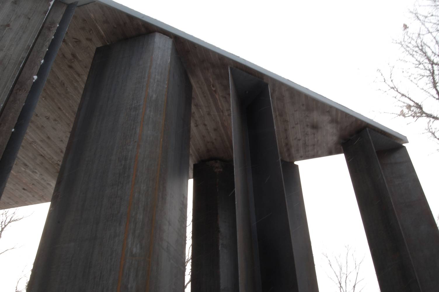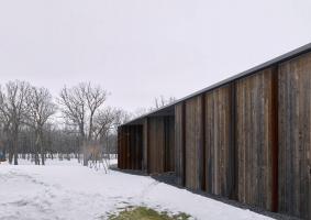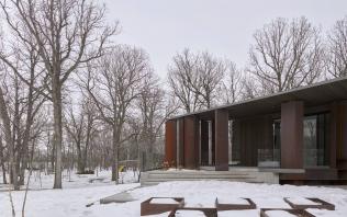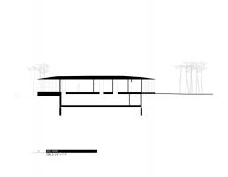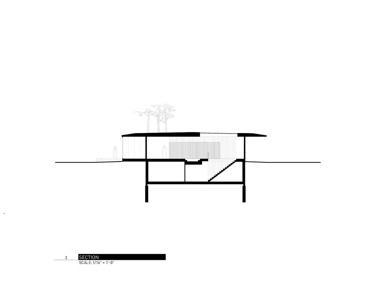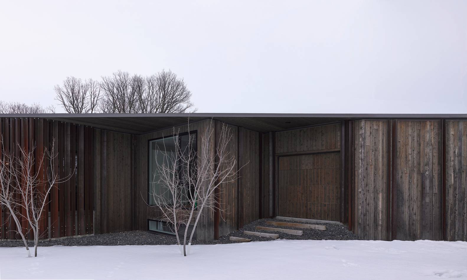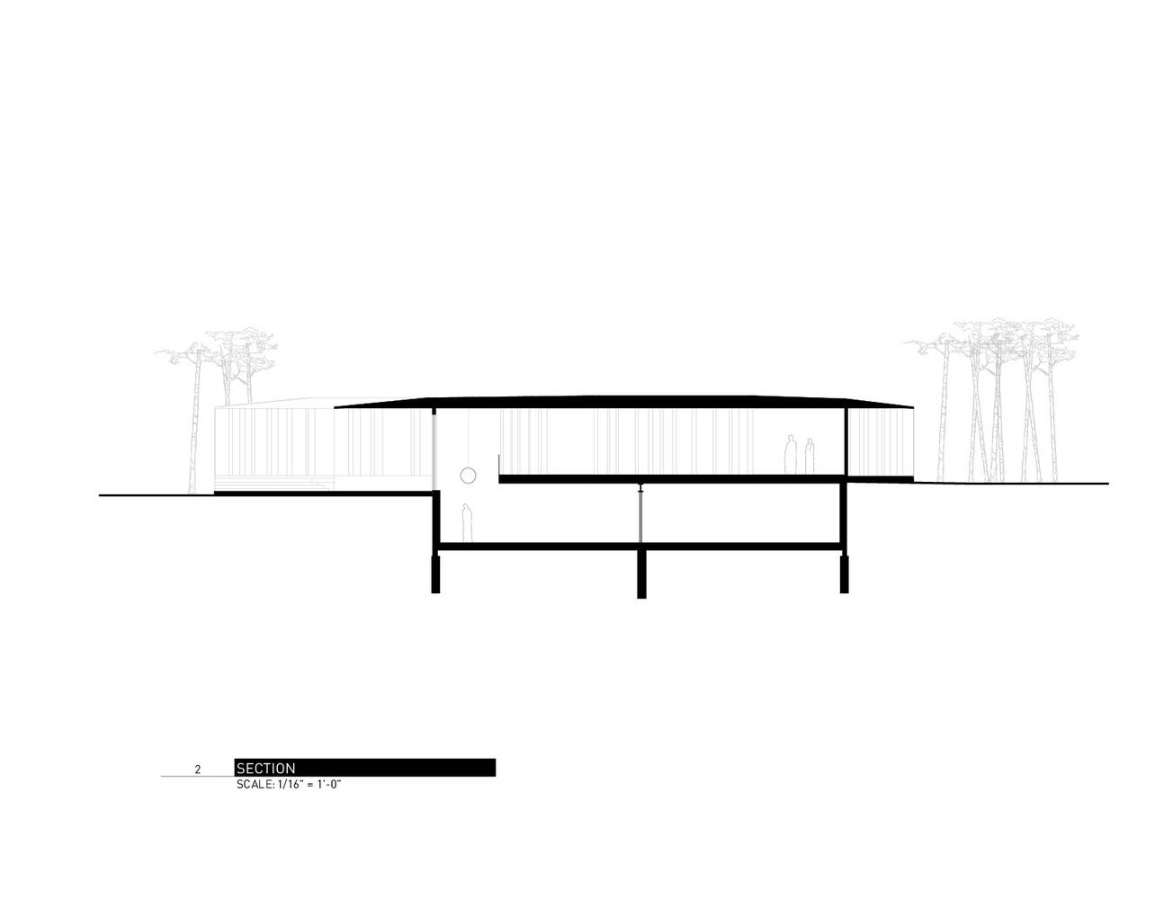 在外部,房子的表皮是自然染色的垂直模板。由木材包裹的拱腹延伸到開放的天井和遮蔽的門廊,以完成這個平行四邊形。由一系列U型的Cor-ten鋼柱支撐,它可以將視圖屏幕顯示在私人房間里,并讓人聯(lián)想到場地中的樹木。
