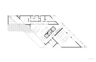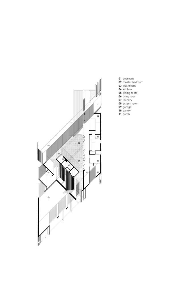 雖然業(yè)主更喜歡只有一層的布局,但是他們提出的關于面積和各種要求的限制,只適用于兩層的布置。通過把平面變成一個平行四邊形,增加的外部??可以在一個單一水平面上容納他們所需要的功能,方便了整個房子中的各種活動功能整合,這很適合一個有孩子的家庭。