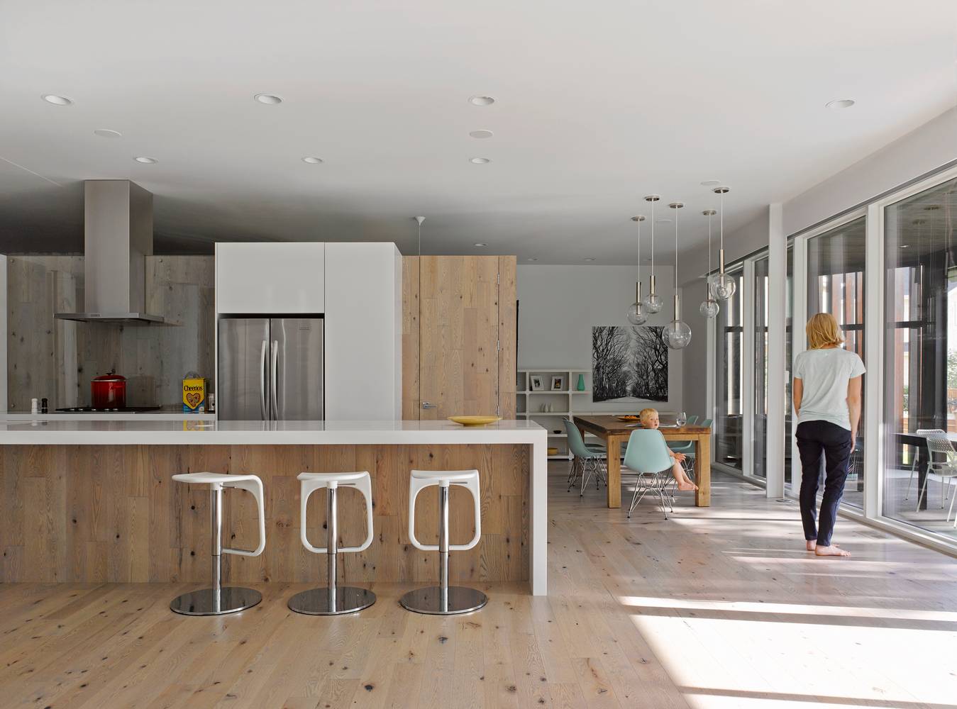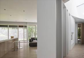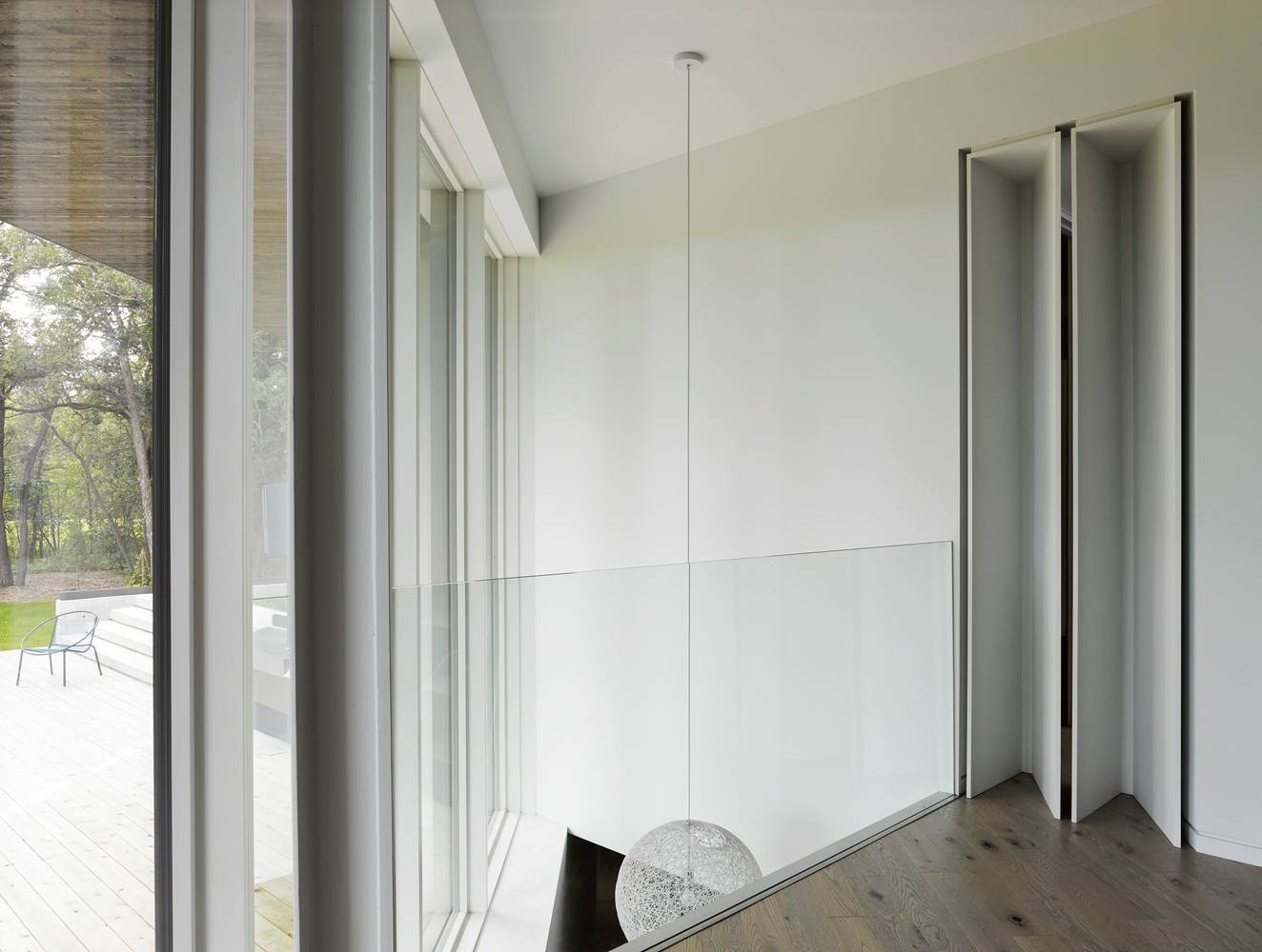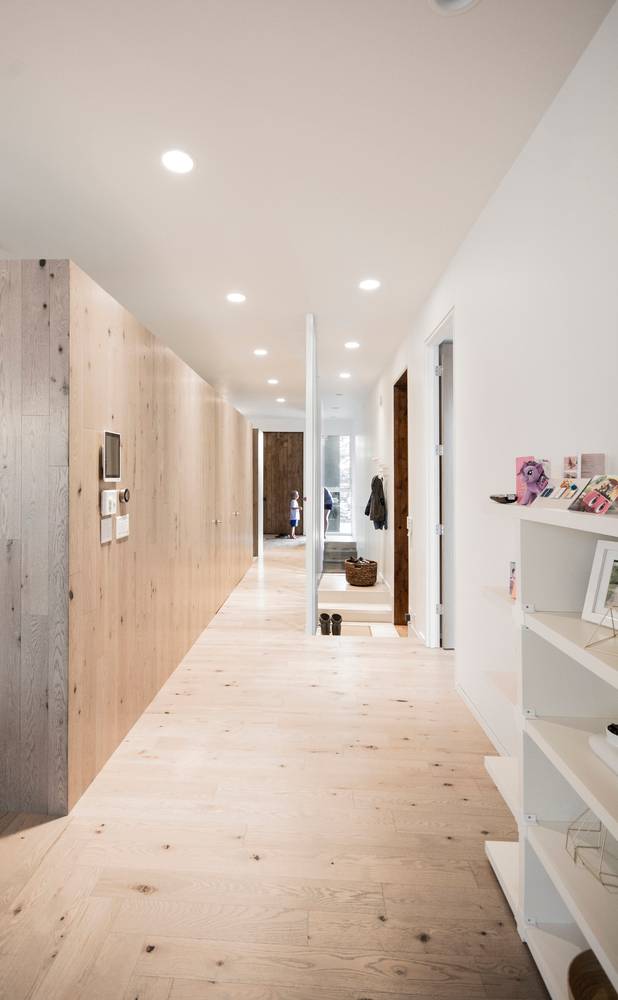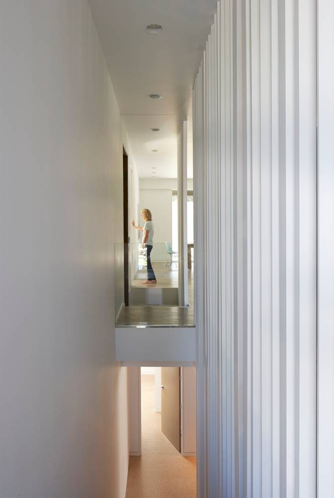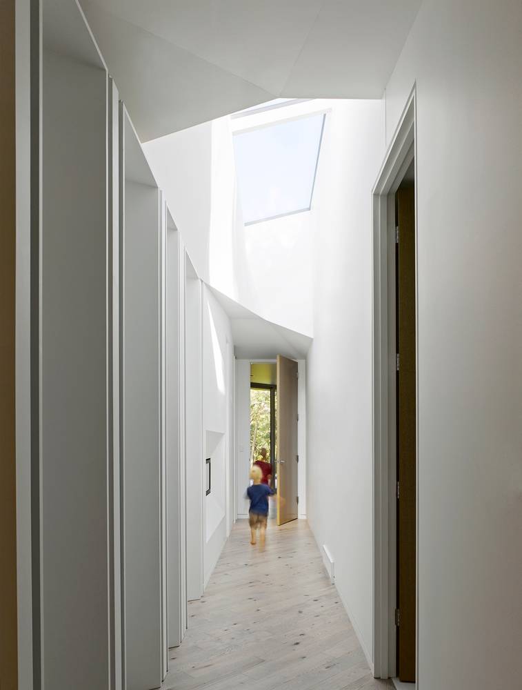 在內部,一個漂浮的公共盒子讓起居和交通空間自由流動,其中包含了入口壁櫥、化妝間和儲藏室。主臥的兩邊用一種白漆楓木隔障從起居空間中分隔開來,隔障將外部體量的集合形狀延伸到內部空間中。簡單而柔和的調色板、從主樓層一直延伸到地下室的一系列光井和天窗,極大地強調了內部的體量。