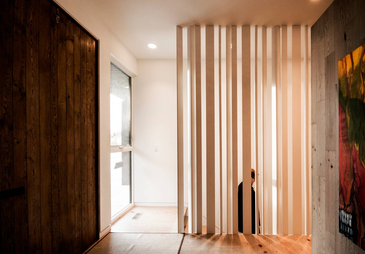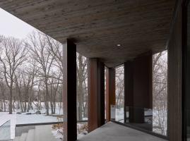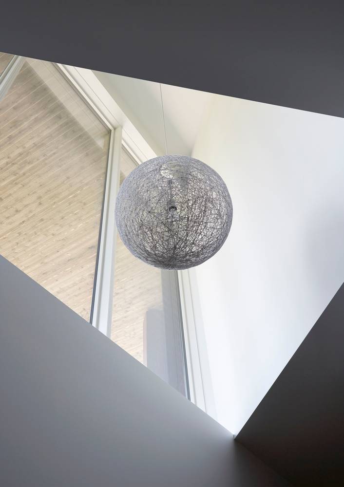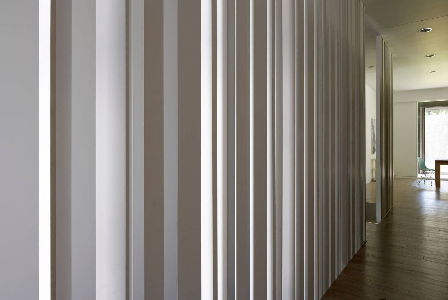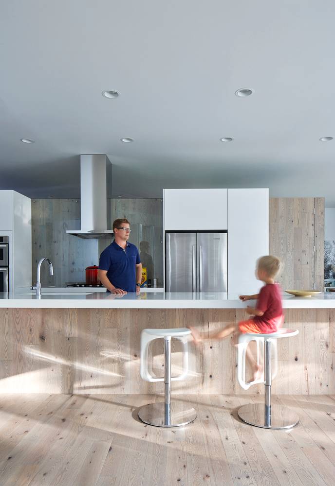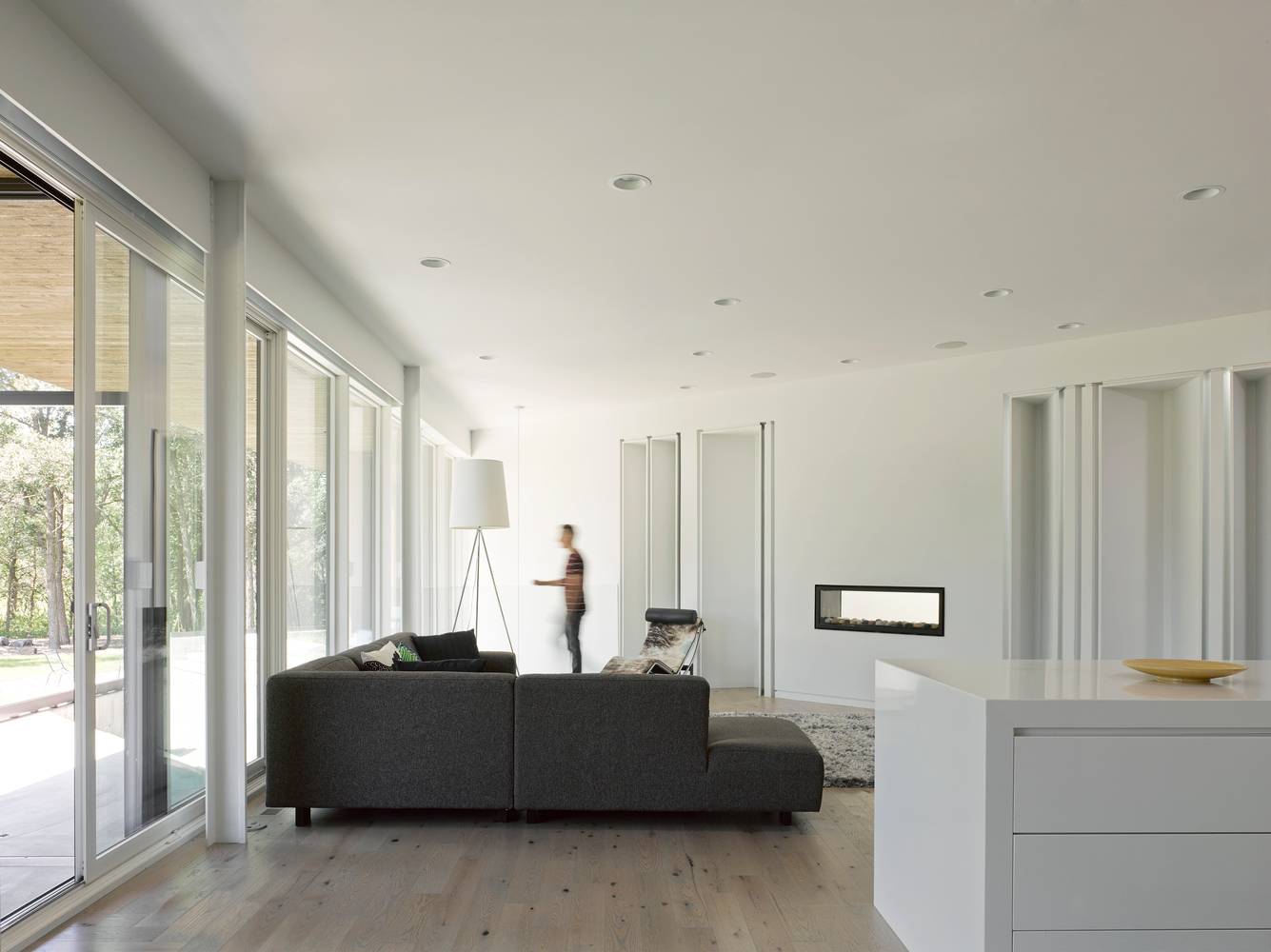 在內部,一個漂浮的公共盒子讓起居和交通空間自由流動,其中包含了入口壁櫥、化妝間和儲藏室。主臥的兩邊用一種白漆楓木隔障從起居空間中分隔開來,隔障將外部體量的集合形狀延伸到內部空間中。簡單而柔和的調色板、從主樓層一直延伸到地下室的一系列光井和天窗,極大地強調了內部的體量。