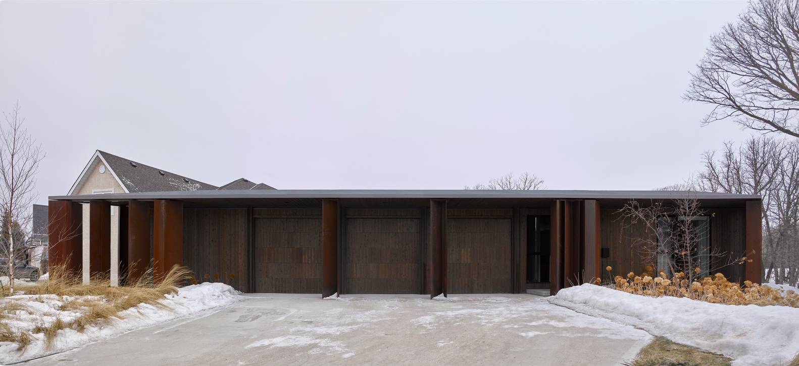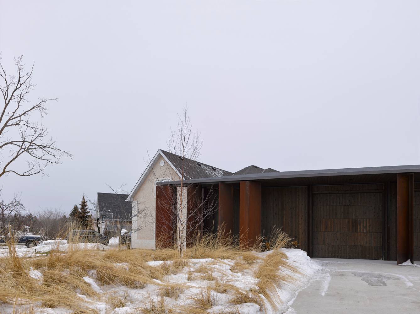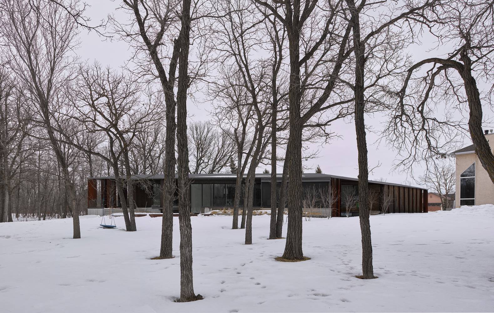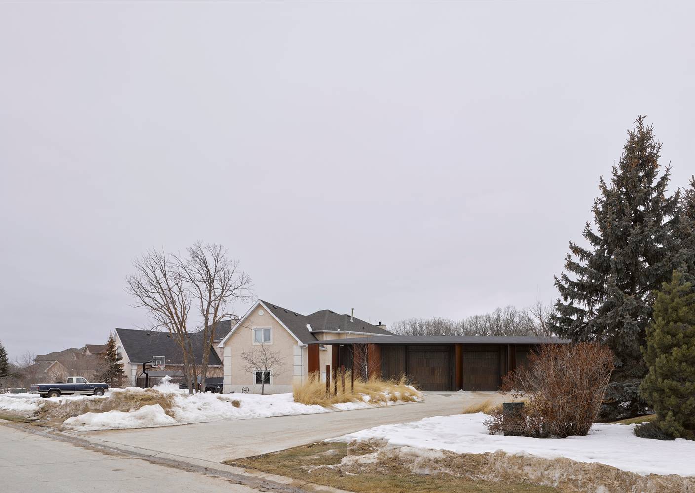 “平行四邊形之家”是一個四口之家的一處寬敞的小房子,在溫尼伯背部的東圣保羅郊區(qū)。場地在一處安靜的海灣里,周圍都是典型的郊區(qū)、灰泥外墻的住宅,這處建筑以一副樸素的面孔朝向街道。在滿是樹的后院里,有大面積的落地玻璃窗面向寬闊的庭院空間。