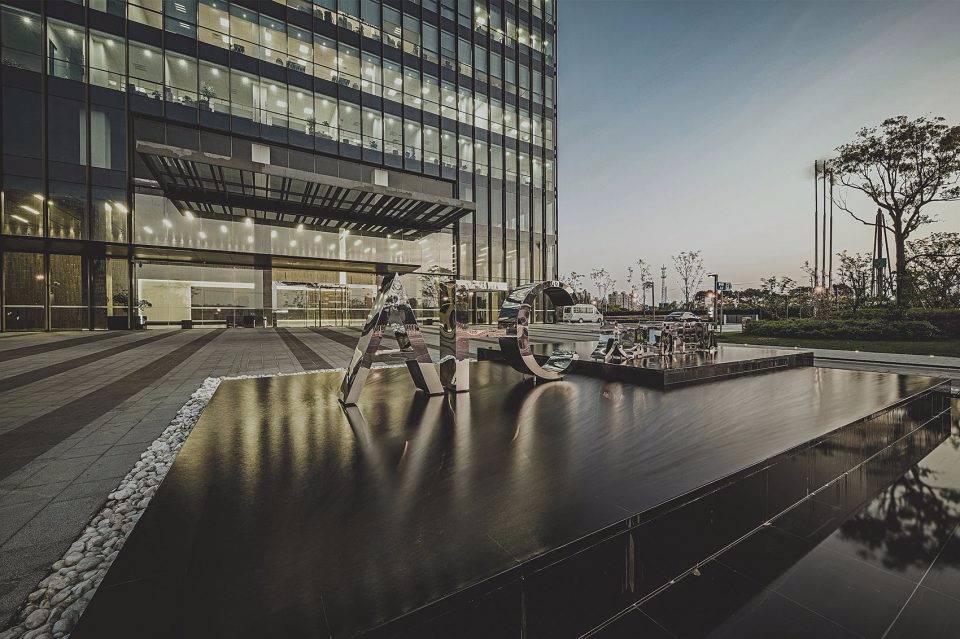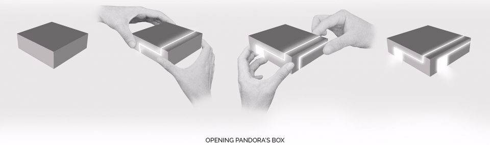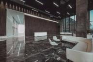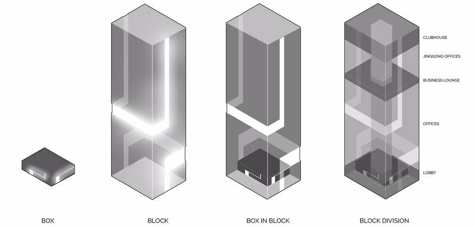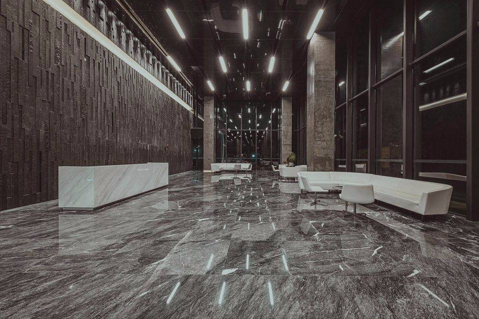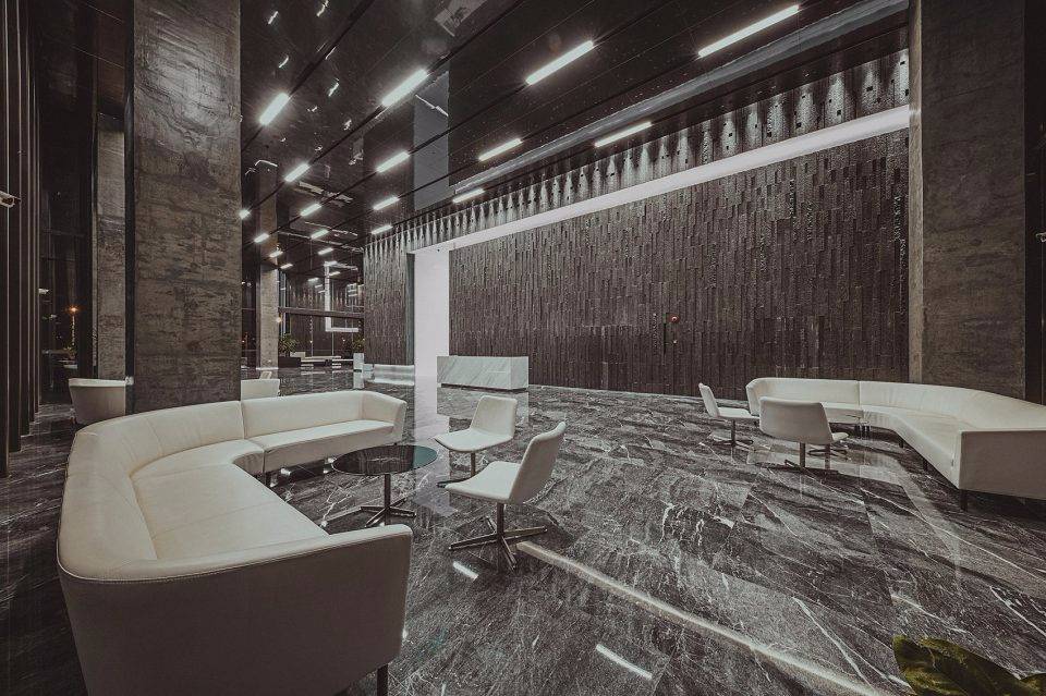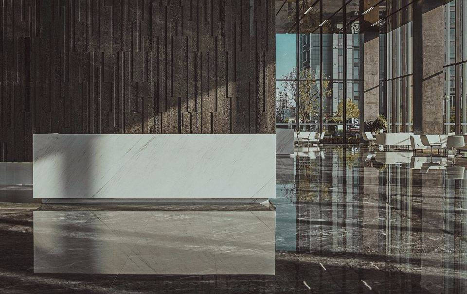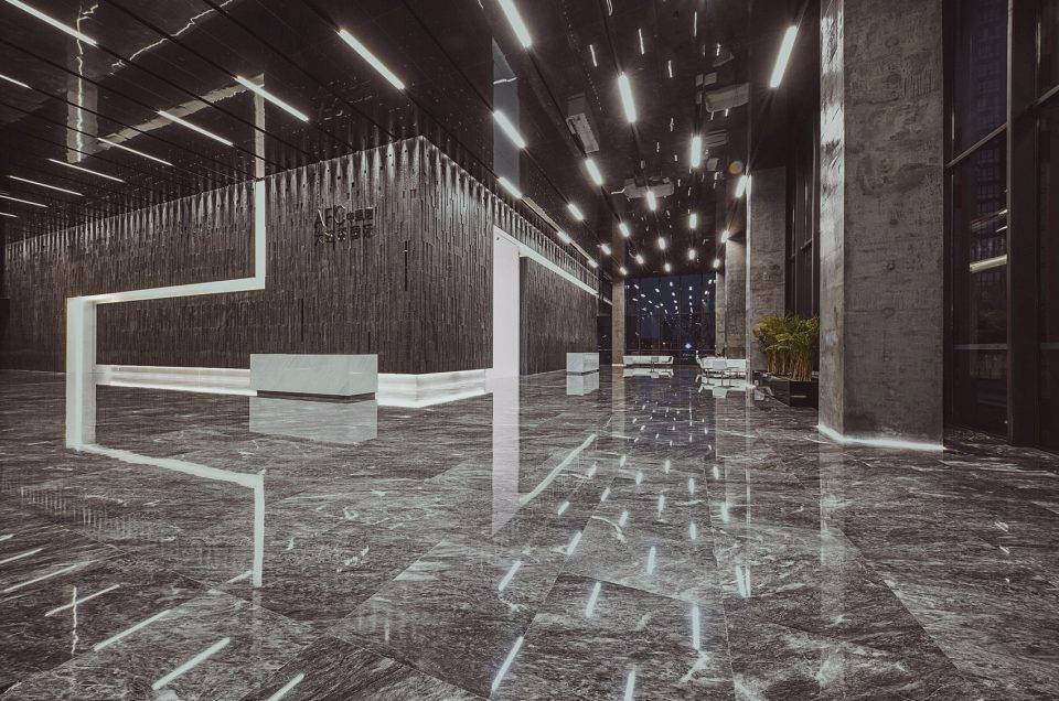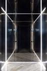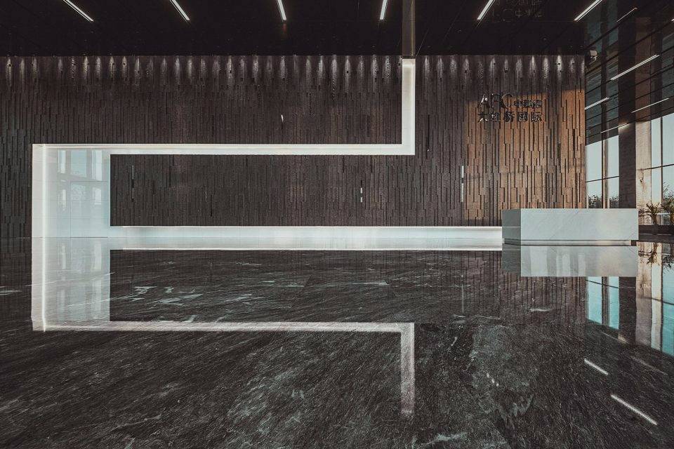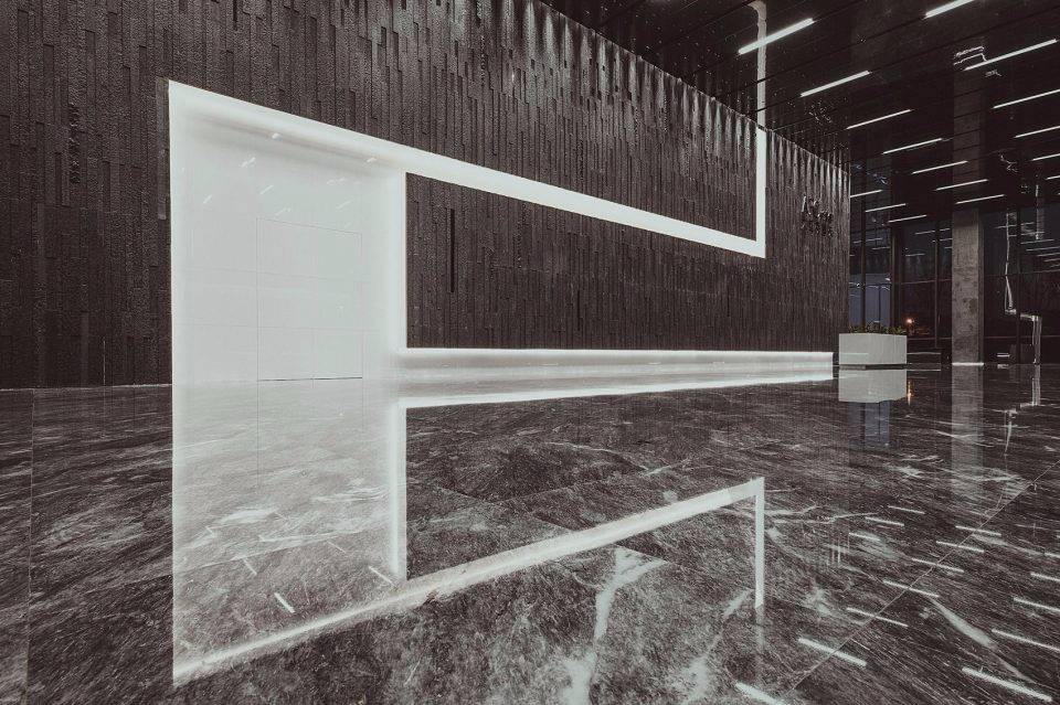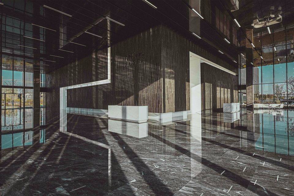 設(shè)計(jì)靈感來源于古代希臘神話故事里的“潘多拉魔盒”。中央大堂如裂開的黑盒子,兩道白光隱隱的引導(dǎo)人流到內(nèi)部電梯大廳。四種不同的工藝來處理組成“黑盒”完成面的石頭:拋光面、翻滾面、荔枝面和噴砂面,打造出粗曠紋理的完成面。