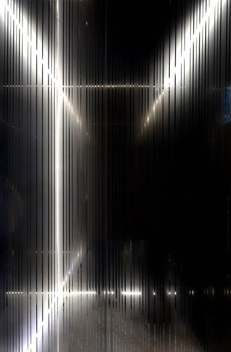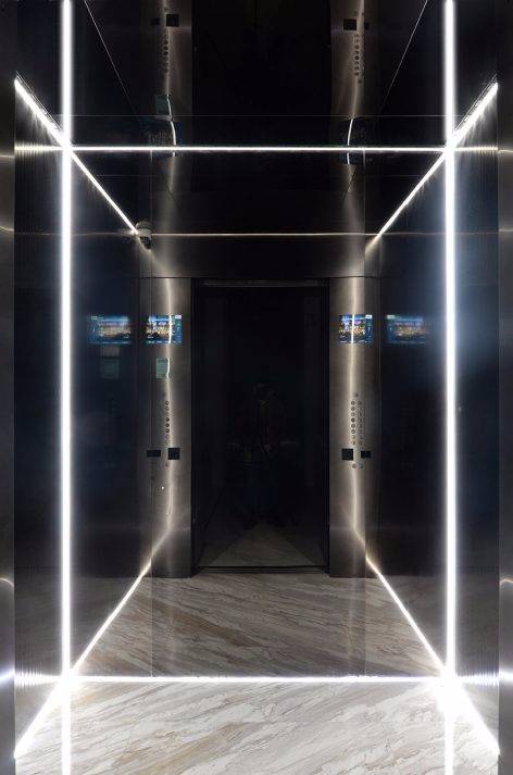 在上升的電梯里,你猶如進(jìn)入了一個(gè)被灰鏡反射的無限空間里,仿佛時(shí)間靜止了。
