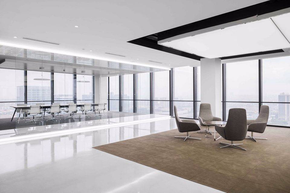 極簡的設(shè)計(jì)風(fēng)格也被運(yùn)用在了集團(tuán)在大樓20層到28層的辦公空間中。在入口接待處,設(shè)計(jì)師別出心裁,由白色大理石、可麗耐和拉展軟膜制成的幾何體塊仿佛懸浮在空間之中。開放的休息處中央設(shè)有一座吧臺(tái),從這里可以盡享360度室外景觀。裝飾在墻面上的拉制金屬由精工集團(tuán)直接提供,展示了公司在鋼結(jié)構(gòu)制造業(yè)的廣泛影響。