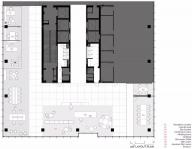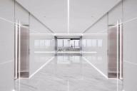 大樓租戶從一個(gè)黑暗、活躍和豐富質(zhì)感的空間轉(zhuǎn)移到一個(gè)純白可麗耐和拉絲金屬打造的寧靜空間。電梯廳里純凈的材質(zhì)和燈光別于大堂,讓人感覺到安靜與舒適。