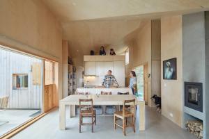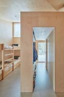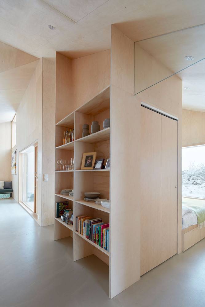 為了創(chuàng)造一個溫暖而又光線充足的室內(nèi)空間,建筑師使用了堿水和白油處理過的松木膠合板來裝飾小屋內(nèi)部。一系列定制的松木家具,包括床架,雙層床,沙發(fā),餐桌,長凳和貨架,充滿整個建筑空間。