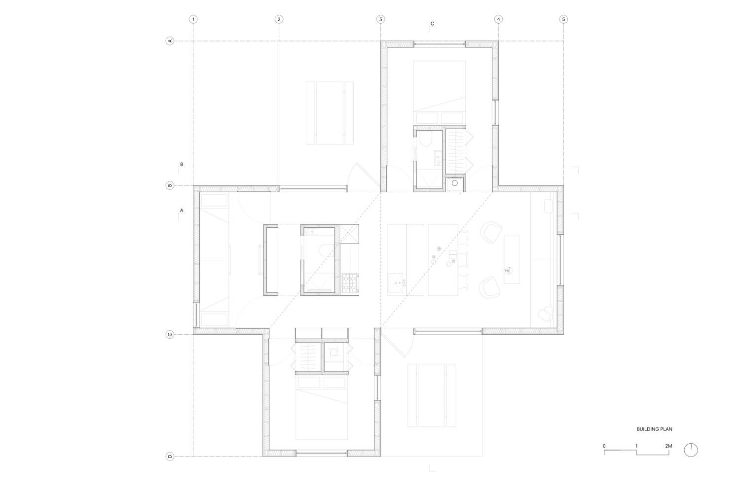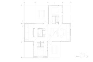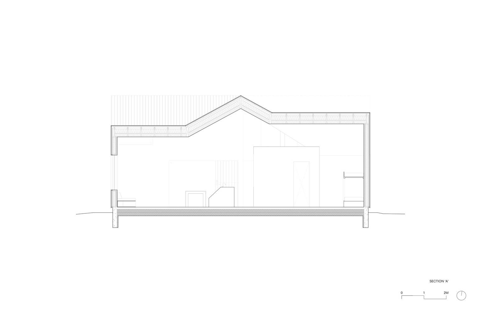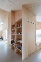 即使小屋只有84平米的室內(nèi)面積,內(nèi)部空間也被設(shè)計的盡可能自然流動,而不是將平面空間劃分成獨立的房間。2.4米到4.3米高拱形天花板形成了一個組合式棚頂連接著建筑的整個空間。棚頂之下有三個功能性的核心區(qū),其中一個包括廚房,大衣柜和浴室,一個則用于浴室和儲藏,另一個用于儲存和機械設(shè)備。這些功能區(qū)之間的交互創(chuàng)造了內(nèi)部的人員流動,并劃分了私人空間的領(lǐng)域。