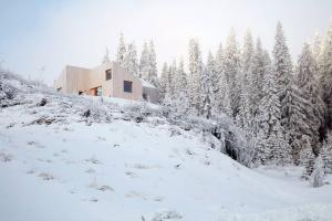 Mylla小屋在設(shè)計上并沒有過多強調(diào)這一地區(qū)周圍的松樹,森林,山脈和湖泊的全景,它更注重于臨近環(huán)境。房屋的四處向外延伸空間代表著這座建筑四種截然不同的屬性,最大的房間俯瞰Mylla湖,客房朝向傾斜的山坡,孩子們的房間望向天空,而臥室則有著朝向森林的私人化景觀。