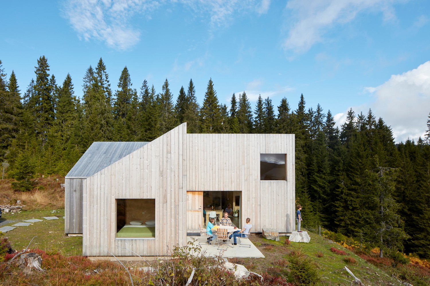 “平面風(fēng)車式的建筑和傾斜的屋頂是一種向氣候的妥協(xié),分開的臥室在保證隱私的同時,為每個房間提供了獨特的景觀。從這個角度出發(fā),這座建筑的設(shè)計是與環(huán)境之間一種非常直接的反映,產(chǎn)生了一種非常獨特的體驗?!盋asper Mork-Ulnes這樣說。