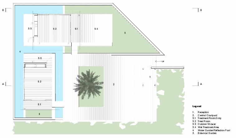 太平洋地區(qū)的傳統(tǒng)巨型屋頂被賦予了具有現(xiàn)代感的幾何造型,同時(shí)還能夠?qū)鏊暮oL(fēng)引入室內(nèi)。分布在室內(nèi)和室外的石墻為spa中心帶來了疏密有致的景觀。水景花園和植物園融入到了場(chǎng)地中的每個(gè)角落,使每一處空間和視野都變得更加美觀。