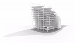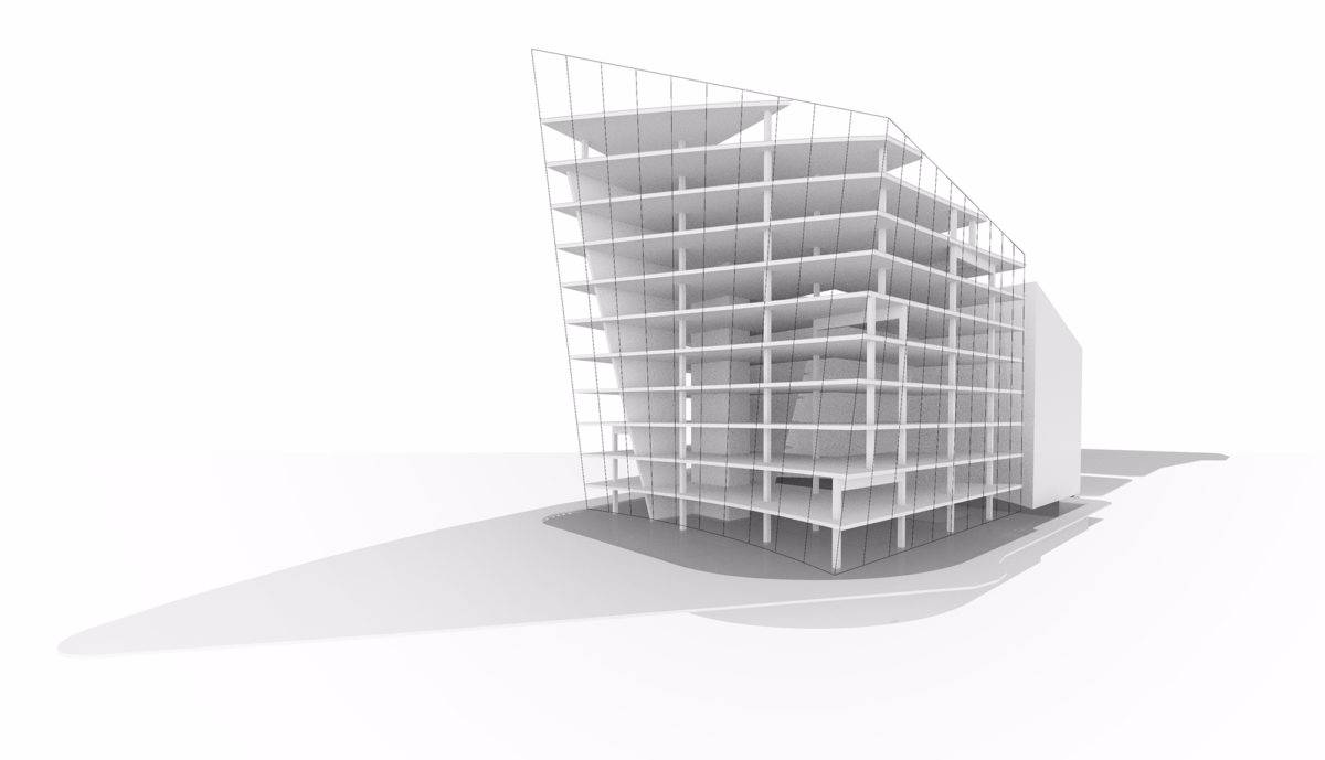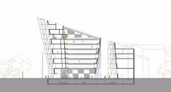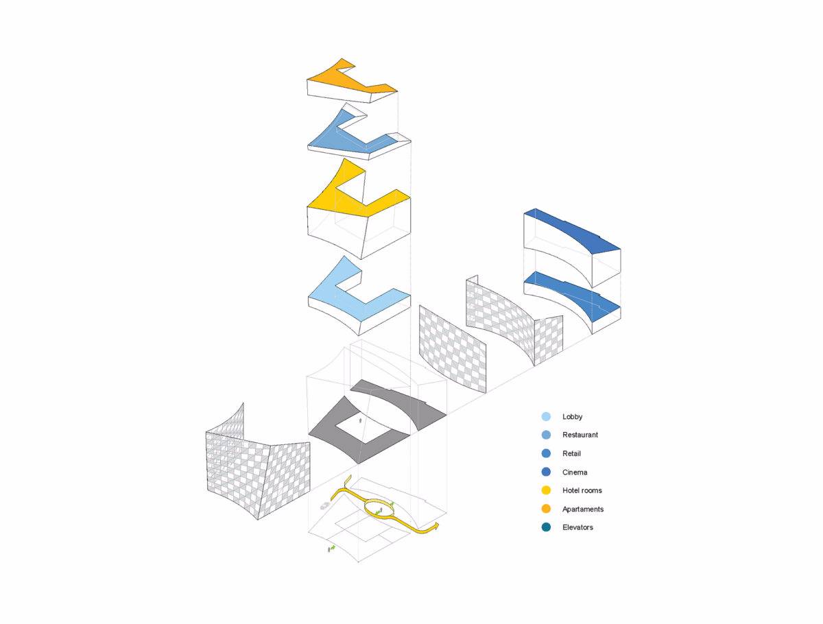 酒店客房圍繞內(nèi)部中庭排布,中庭內(nèi)集中設(shè)置有建筑的豎向交通空間。此外,電影院和商業(yè)零售區(qū)域設(shè)置在庭院的后部,緊鄰界墻。結(jié)構(gòu)體系與扭曲的幾何形狀的立面相配合,由沿著拱形線條和直線平行排列的表面組成。外殼的參數(shù)化設(shè)計(jì)通過(guò)合理的布局進(jìn)行調(diào)和,讓內(nèi)部房間的排布與窗口位置相一致。