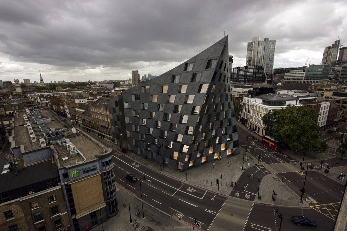 AQSO arquitectos事務(wù)所設(shè)計(jì)的“肖荻奇酒店”位于倫敦東區(qū)大東街和老街標(biāo)志性的十字路口處,造型十分惹眼。穿過(guò)被稱為“硅圓環(huán)”的環(huán)形交通路口后,這條古羅馬街道的西側(cè)做了加寬處理,打開(kāi)了哈格斯頓肖荻奇區(qū)域的大門。這個(gè)交叉路口不僅從城市肌理的形態(tài)學(xué)角度講很重要,它還是這個(gè)古老工業(yè)區(qū)的復(fù)興催化劑。該工業(yè)區(qū)因受到倫敦市正在經(jīng)歷的創(chuàng)意與藝術(shù)繁榮發(fā)展的影響而慢慢發(fā)生蛻變。