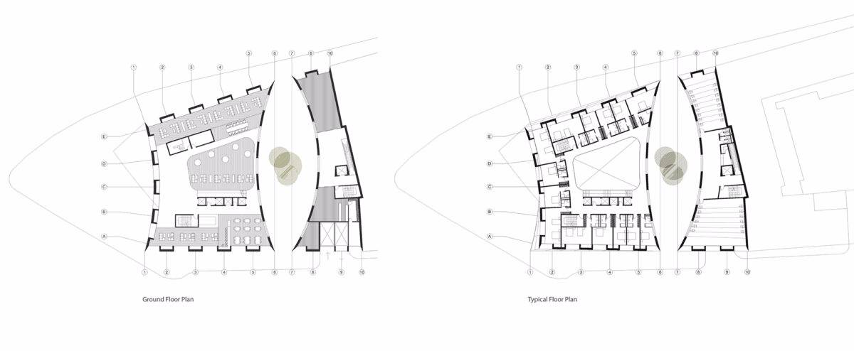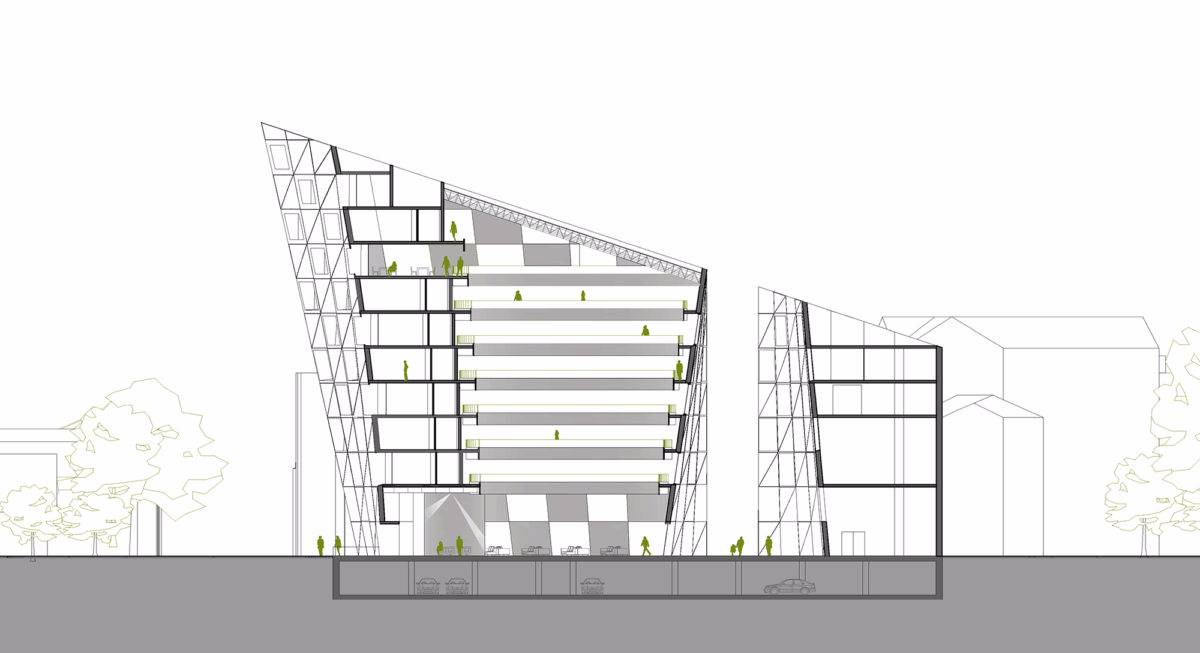 肖荻奇酒店變成了一個(gè)船頭建筑,強(qiáng)化路口角度的同時(shí)與城市視角相呼應(yīng),同時(shí)體量在地面層標(biāo)高上有所后退,對(duì)垂直交叉的自行車流線和行人流線進(jìn)行退讓和強(qiáng)調(diào)。這兩股流線的交疊塑造劃定了建筑的形式,創(chuàng)造出一種標(biāo)志性的元素,獨(dú)特而又不會(huì)過(guò)于另類,從相鄰街道剛好可以讓人一眼注意到。