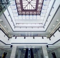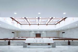 新設(shè)計(jì)的展館中庭天窗處理借鑒了傳統(tǒng)建筑“藻井”的手法——紫銅板裝飾的吊頂梁格,形成了既簡(jiǎn)約現(xiàn)代又古樸典雅的現(xiàn)代“藻井”,使得恢弘的大廳空間有了自己的個(gè)性。