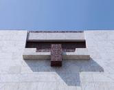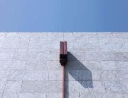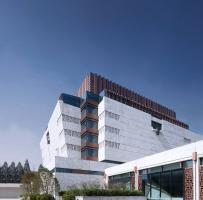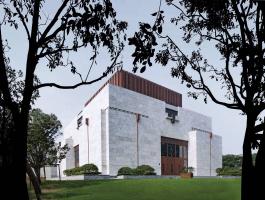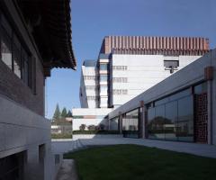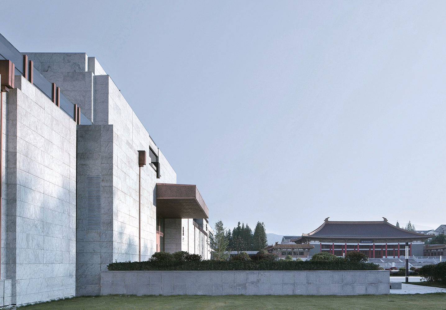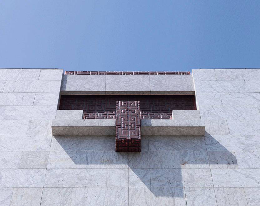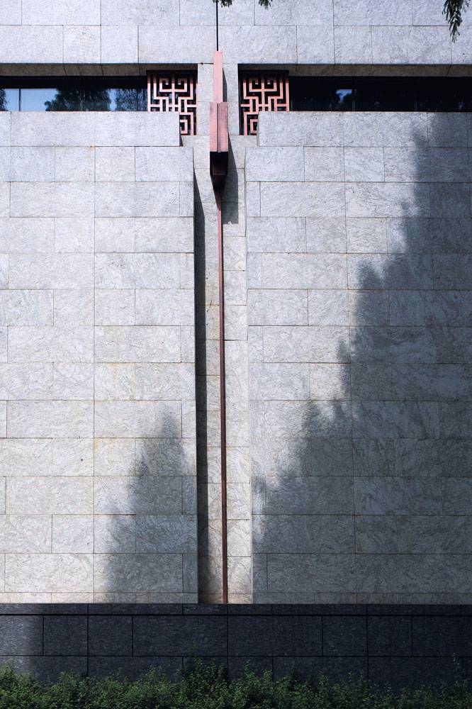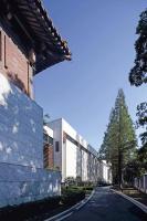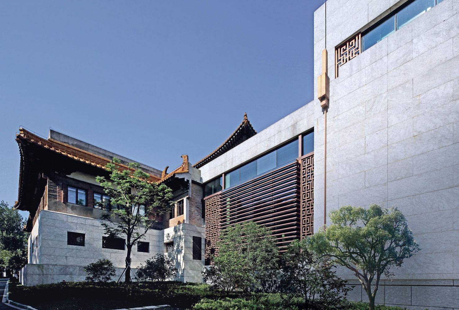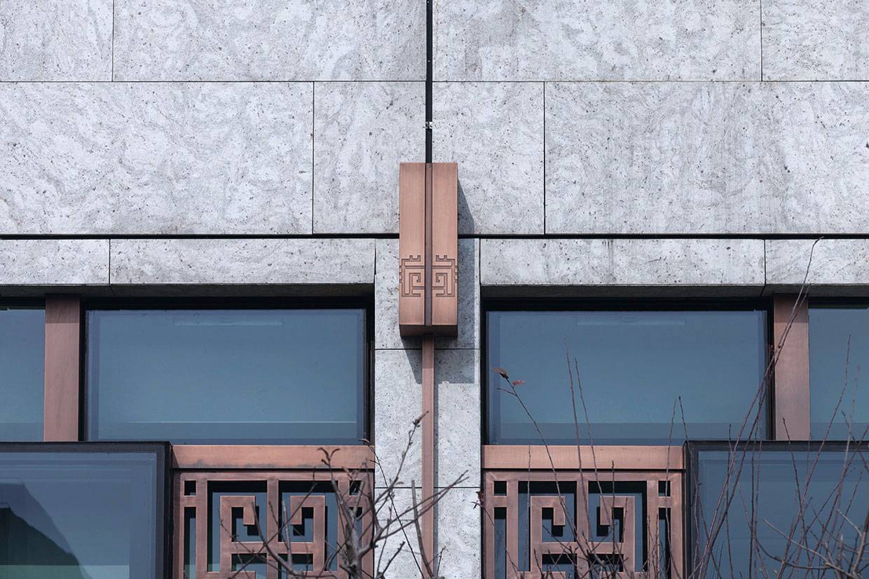 建筑立面造型經(jīng)由統(tǒng)一設(shè)計(jì),選取灰白基調(diào)夾雜暗紅色點(diǎn)線的石材掛面,并在石材表面作古典面處理,使建筑整體氣質(zhì)粗獷而內(nèi)斂,溫潤(rùn)又有厚重感。室內(nèi)外還選用了紫銅板裝修,銅板的質(zhì)樸、莊重與典雅既與整體的設(shè)計(jì)氣質(zhì)相吻合,也與“老大殿”的琉璃瓦屋頂相得益彰。