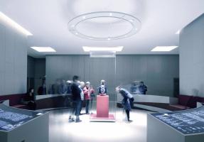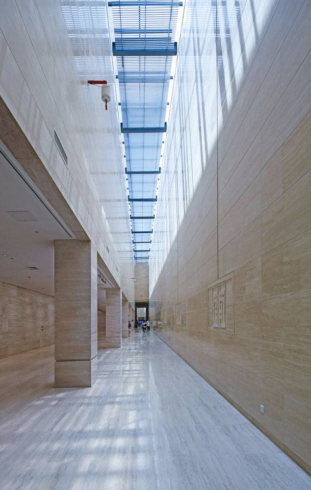 設(shè)計(jì)利用200米長(zhǎng)的地下通廊、4個(gè)大小不一的下沉庭院和12個(gè)采光中庭,把地下多個(gè)展廳聯(lián)系起來,地下空間顯得生動(dòng)而活躍,同時(shí)也解決了地下公共空間的自然采光與通風(fēng)問題。