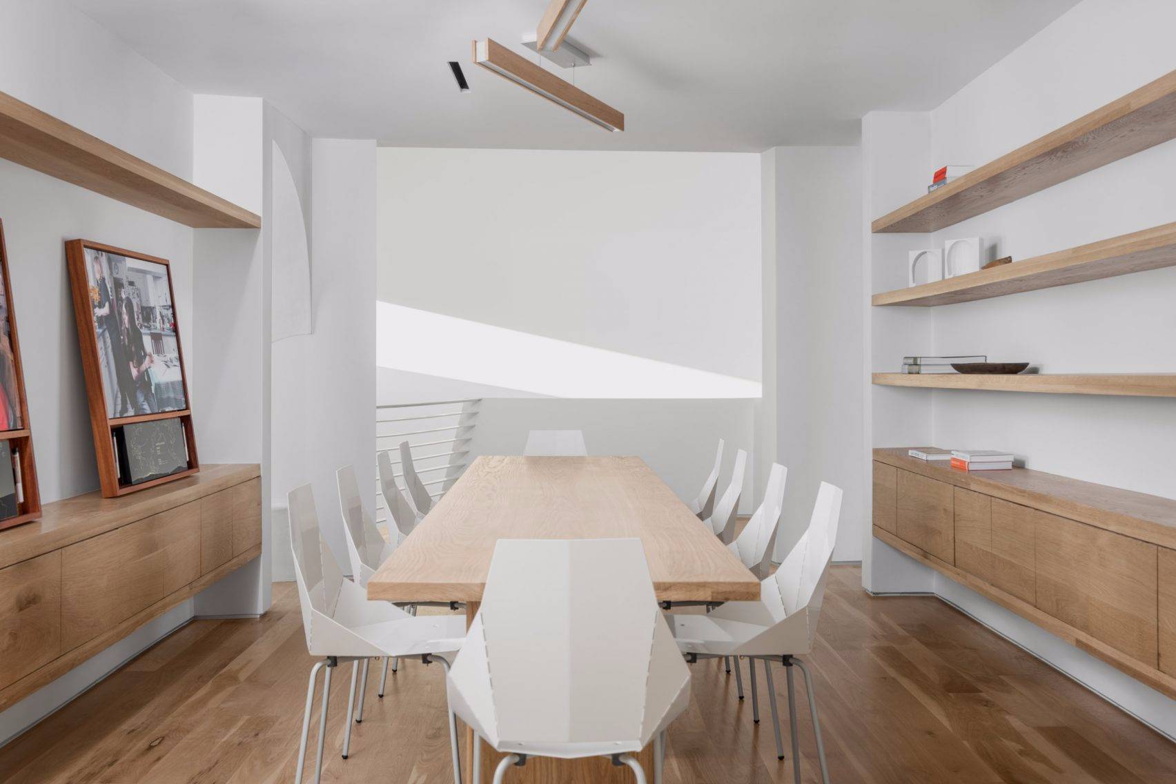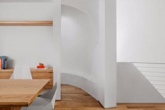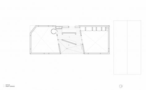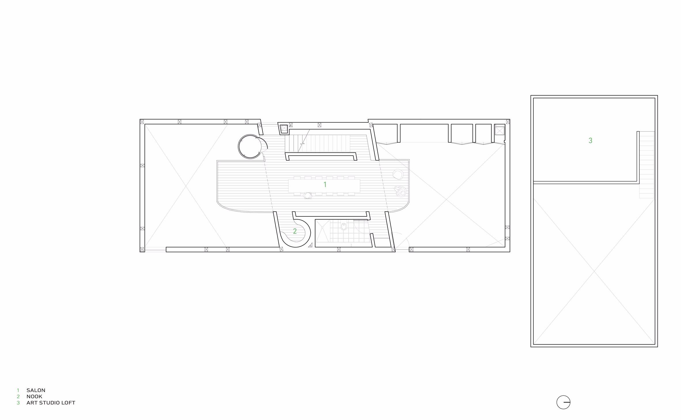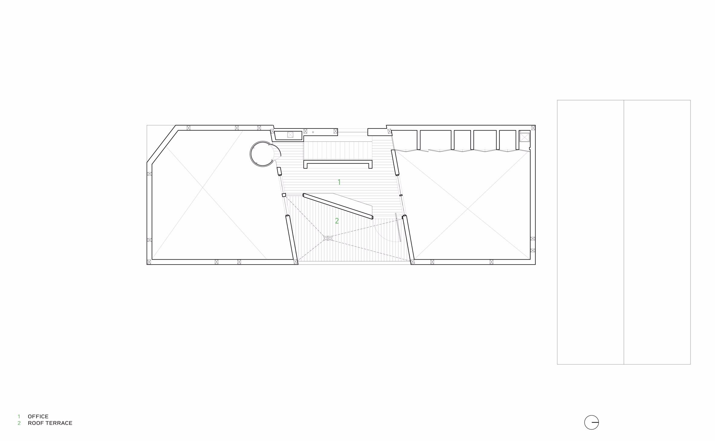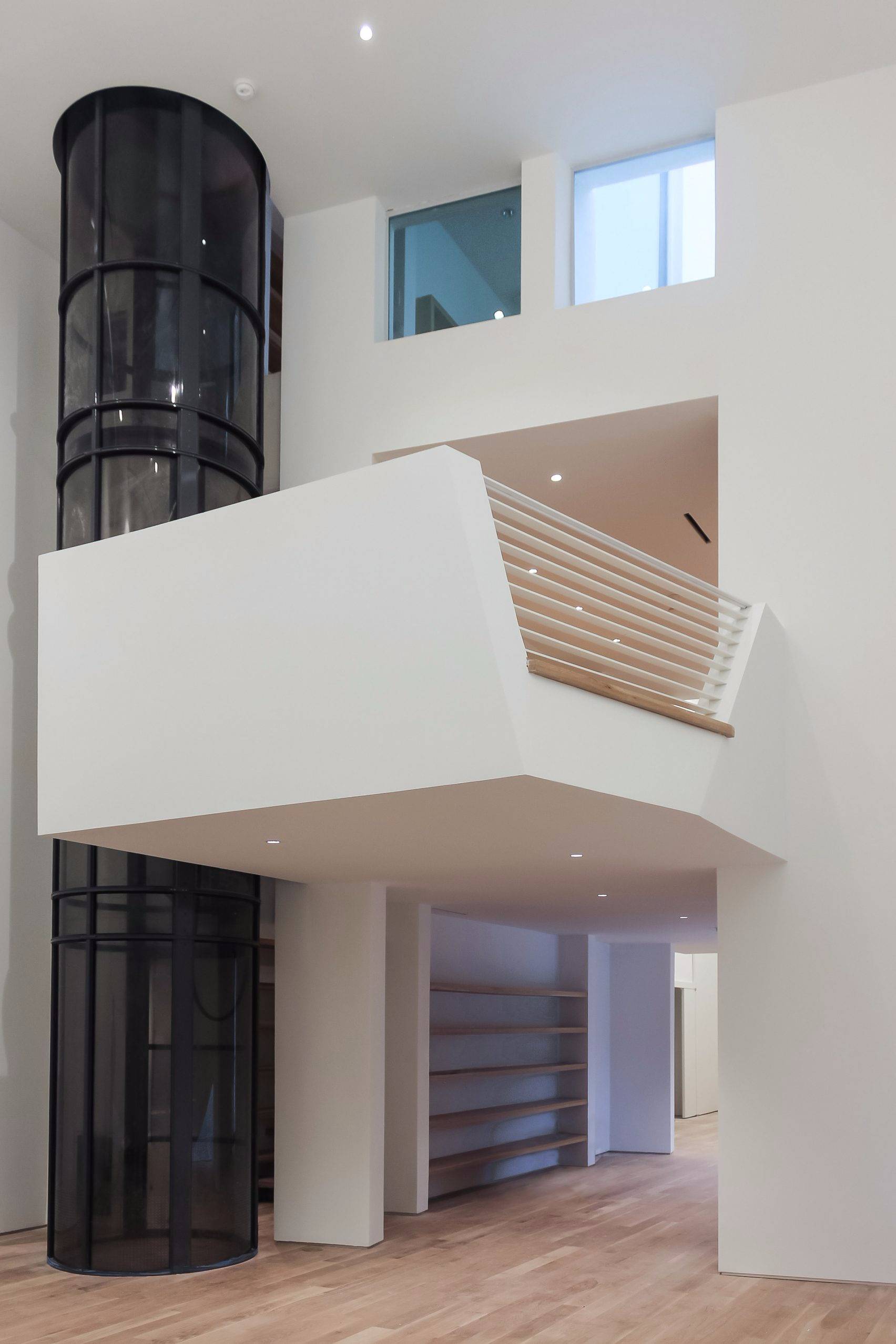 樓梯和一個(gè)黑色的圓柱形電梯通向二樓,建筑師在這一層設(shè)置了一個(gè)與一層空間連通的沙龍。二層空間內(nèi)還設(shè)置有用于私人會(huì)議或者冥想的角落空間,辦公室和室外露臺位于第三層。