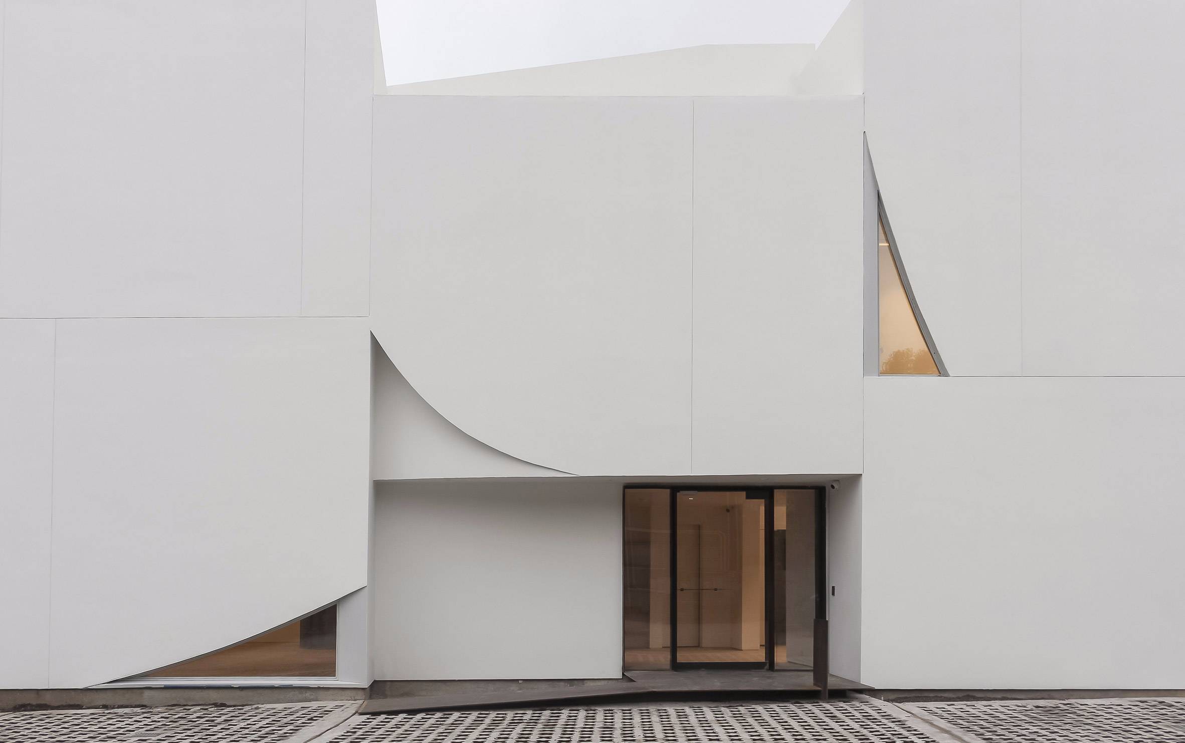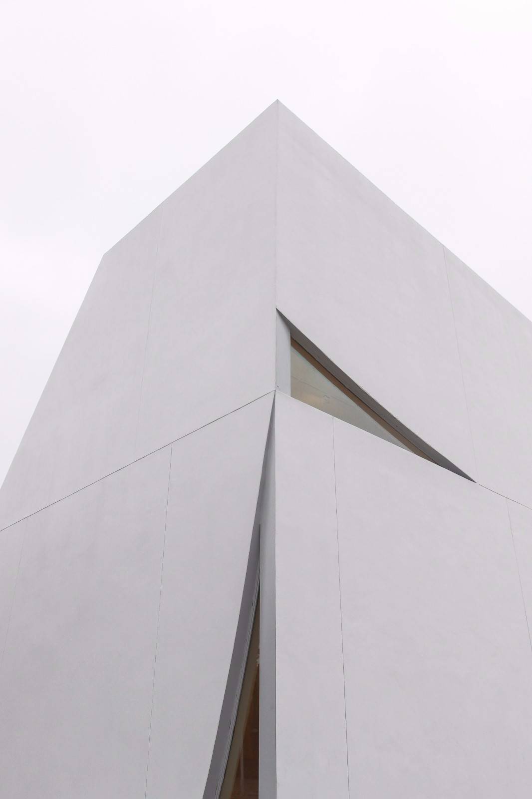 這座美術(shù)館由美國建筑事務(wù)所Schaum/Shieh設(shè)計(jì)完成,其立面造型由雕塑般的白色拉毛粉刷板和小塊三角形的玻璃窗共同勾勒出來,仿佛“被風(fēng)掀開了的裙裾” 一般優(yōu)雅好看。