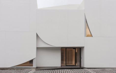 “我們追求的是整體的輕盈感,”事務(wù)所說道?!熬唧w來說,我們感興趣的是如何利用幾何形體和材料飾面讓建筑形成一種在風(fēng)中被吹開一角的感覺,就像一塊布上有了褶皺,或者像打散的紙牌一般。”